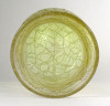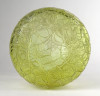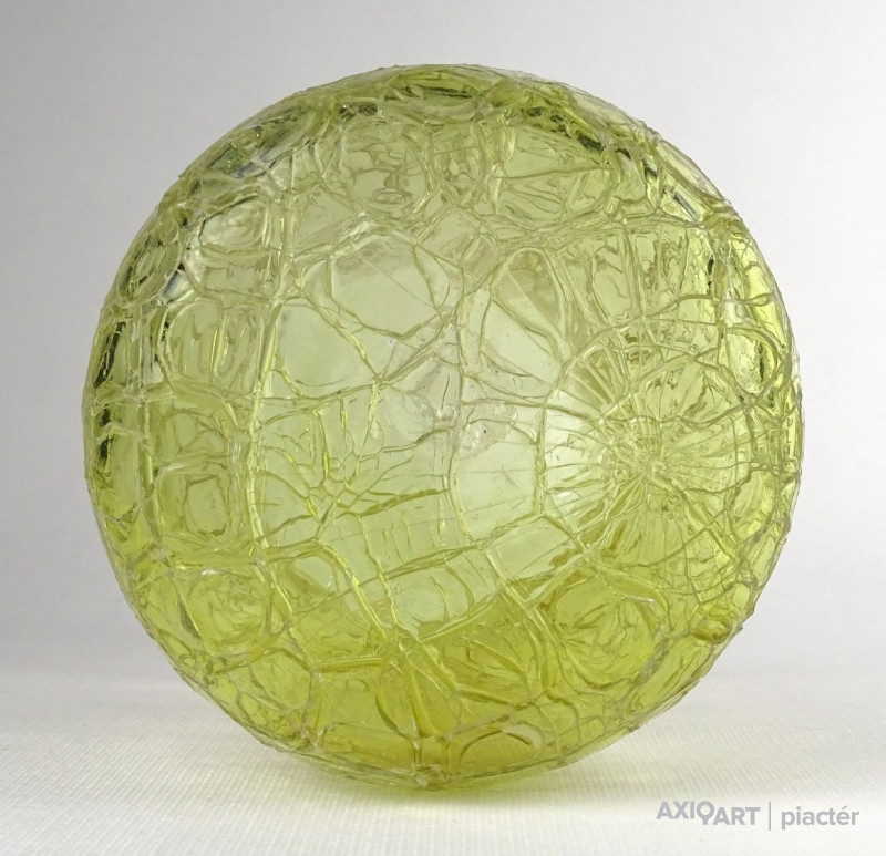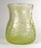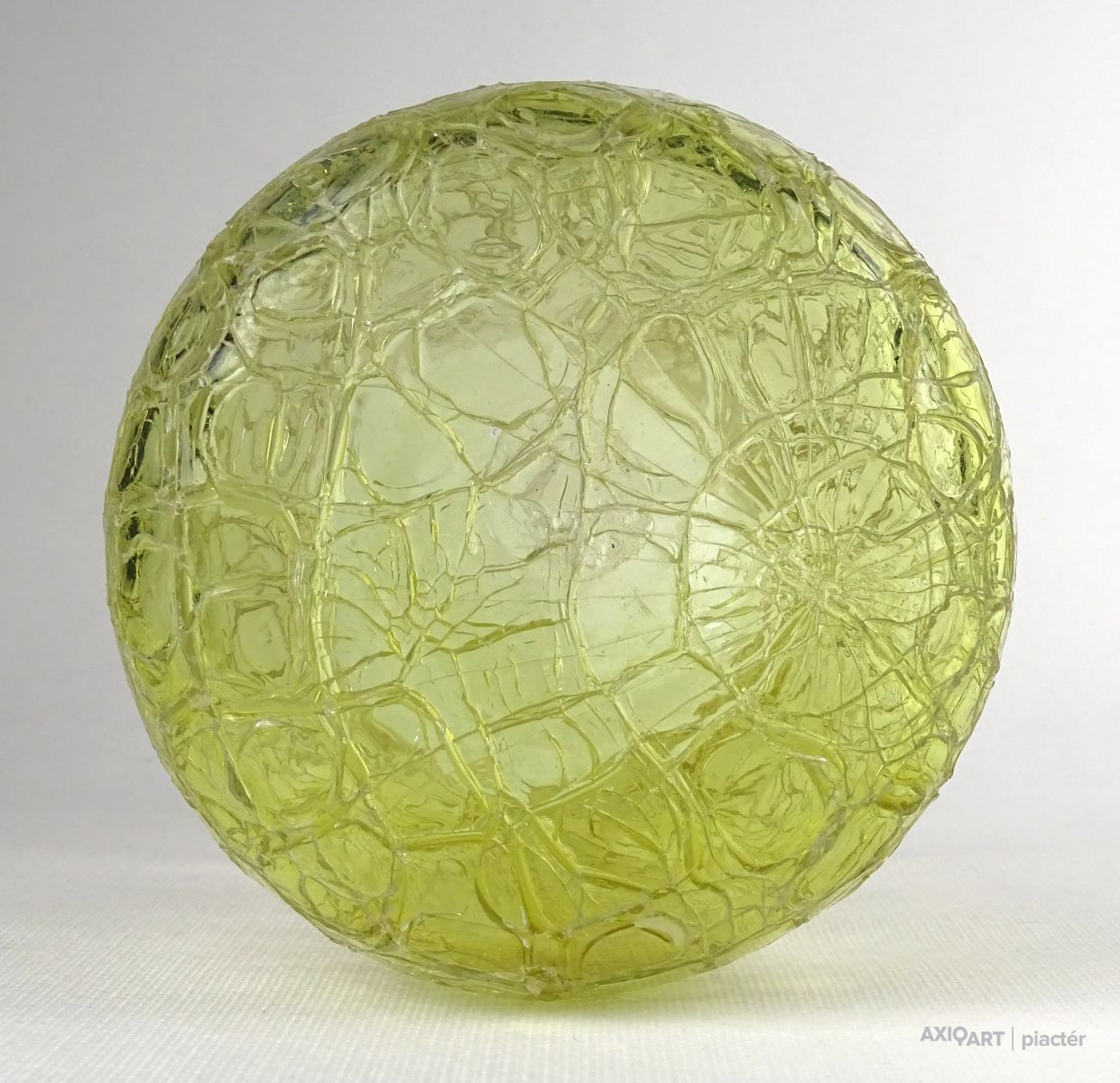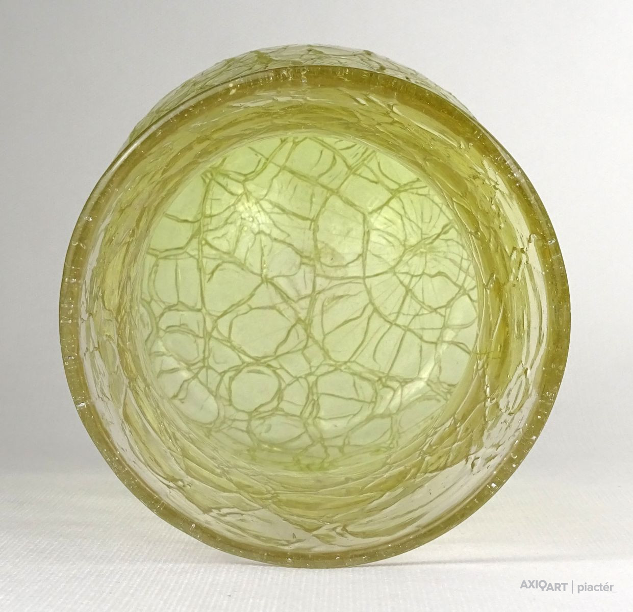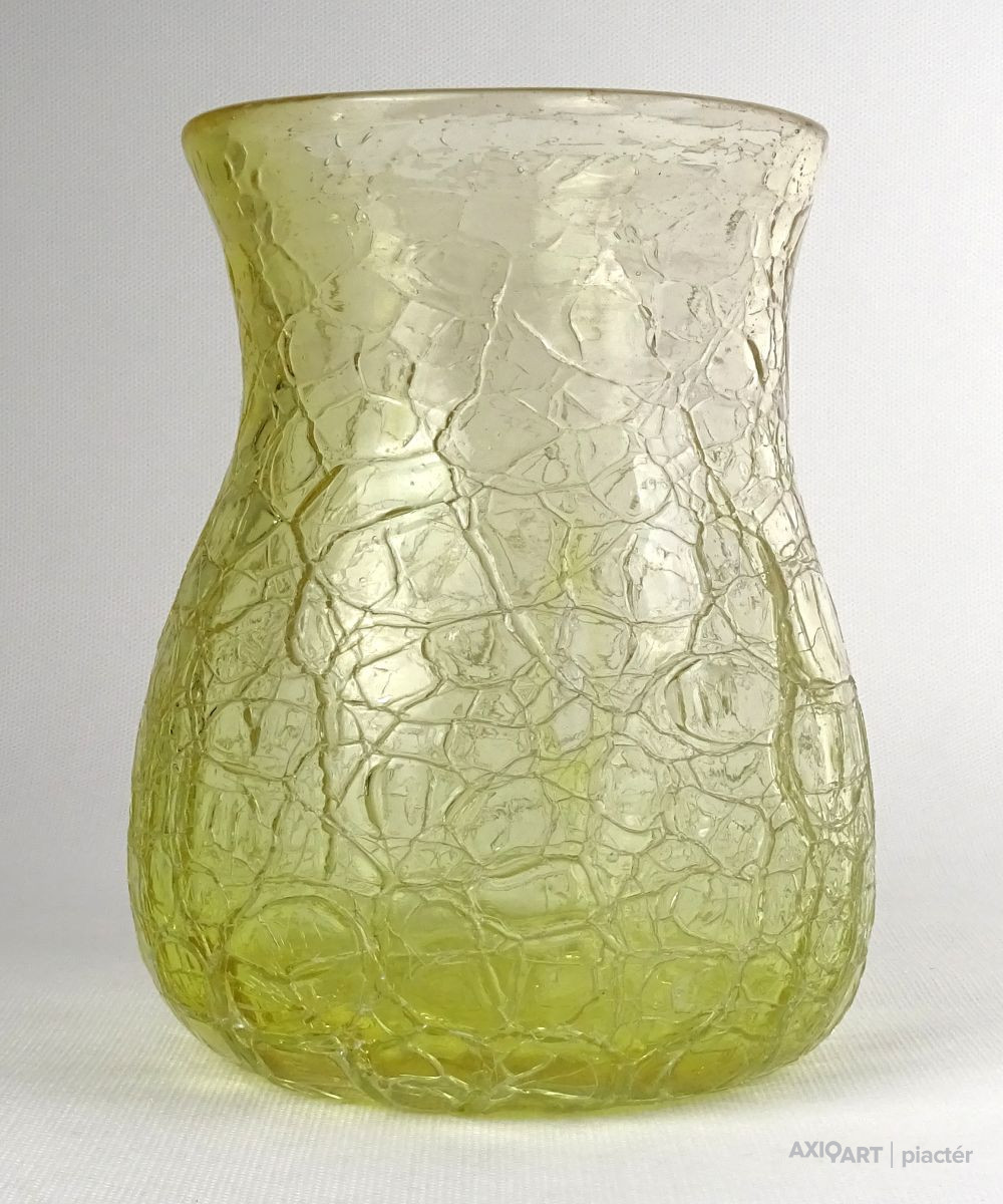 Régi, sárga színű fújt üveg váza. Felülete repesztett, erezett mintázatú. Alján a fújás, szakítás nyoma jól kivehető.