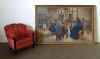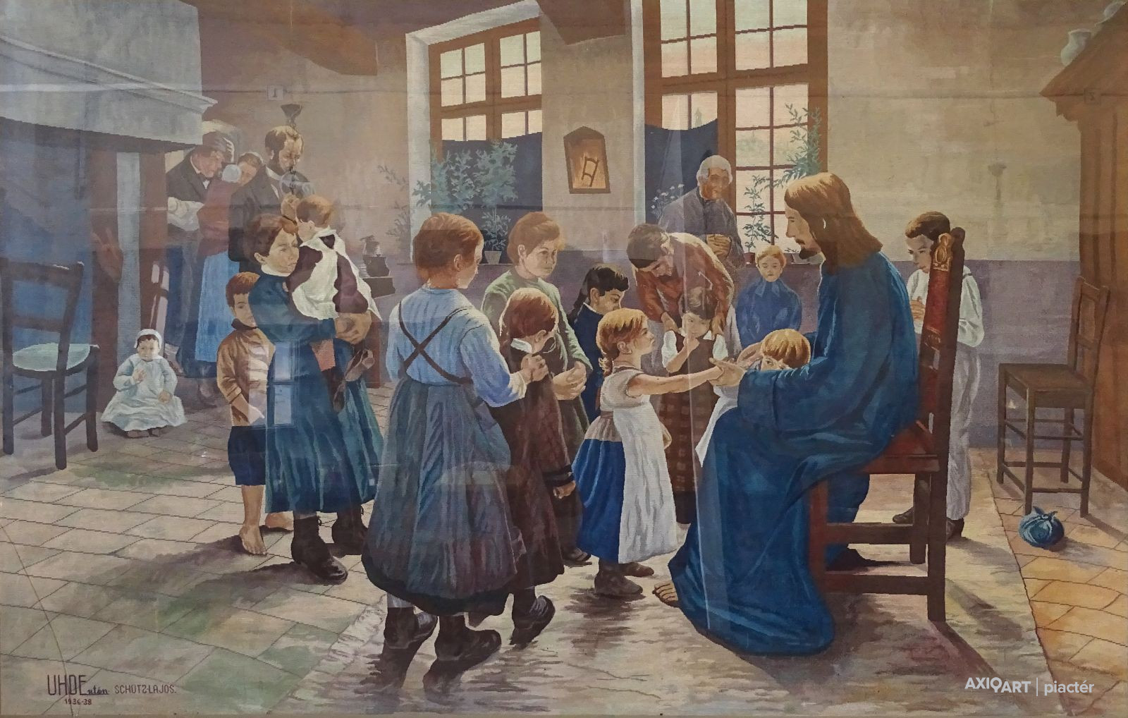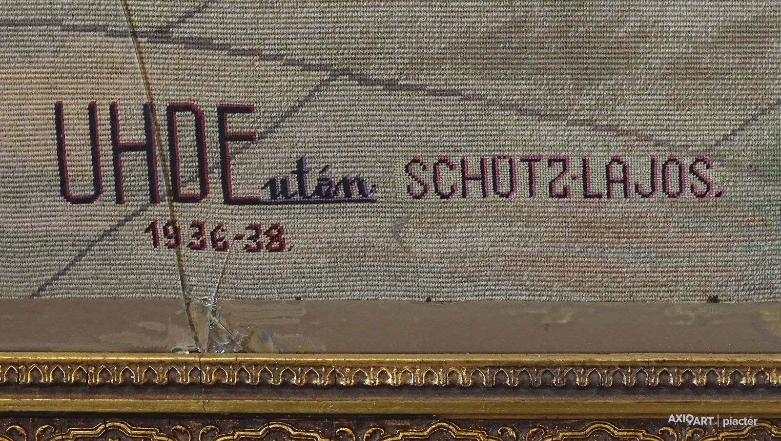 [1H351/UZ-N] Gyönyörű, kapitális méretű keretezett részletgazdag kézimunka, gobelin üveglap mögött. Az üveglap sérült, lásd fotó. A gobelin két éven át készült 1936-tól 1938-ig. Balra lent datált jelzés: UHDE UTÁN SCHÜTZ LAJOS 1936-38. Magasság: 250 cm Szélesség: 165 cm Uhde Frigyes   Német festő, szül. Wolkenburgban (Szászország) 1848 máj. 22-én. 1862. katonai pályára lépett, végigküzdötte az 1870-71-iki hadjáratot és 1877. mint kapitány vált meg a szolgálattól. Eleinte Münchenben tanult, majd 1879, Párisba ment, hol Munkácsynak lett tanítványa, a nélkül azonban, hogy ez nagyobb hatást gyakorolt volna fejlődésére. 1880. kiállított képei: az Énekesnő és a Családi hangverseny inkább a francia impresszionisták befolyását árulják el. Hazatérve, főleg Liebermann hatása alatt, meglátogatta Hollandiát. Ott keletkeztek: A varró nők és A kintornás ember. Eredetiségét, tehetségének teljes kifejlését azonban csak Engedjétek a kisdedeket hozzám jönni! (1884. lipcsei muzeum) címü képével mutatta meg, Rembrandt hatása alatt új irányt szabott a modern vallásos tárgyu festészetnek, mikor a bibliai elbeszélést a jelenkori, mindennapi életbe helyezte át. Ezen képe, valamint a következők: A tanítványok Emmauszban; Krisztus Urunk, légy vendégünk! (berlini nemzeti képtár); Az utolsó vacsora (1886); A hegyi prédikáció (1887); Karácsonyest; Menekülés Egyiptomba; A napkeleti bölcsek; Krisztus prédikációja a tó mellett; Krisztus és Nicodemus: a legismertebb festők sorába emelték, ha nagy ellenzéket keltett is fölfogása kérlelhetetlen realizmusával. Valamennyiben kitünik eredeti festői fölfogása, mély, vallásos érzése és bámulatos jellemző tehetsége. Egyéb művei, számos képmáson kivül: Gyakorló dobosok (1884); Gyermekek körmenete (1888); A gyermekszoba; A pusztai hercegnő (1889); A szinész (1893); Noli me tangere (1894). V. ö. Lücke, Fritz von U. (Lipcse 1887); Bierbaum, Fritz von U. (München 1893).   Forrás: Pallas Nagylexikon Read more: http://www.kislexikon.hu/uhde_frigyes.html#ixzz7Bp09VrsV