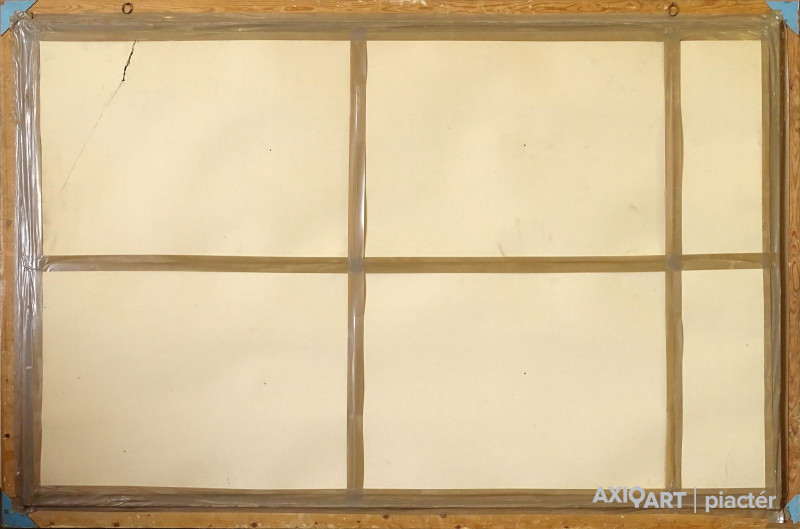 [1Y029/Z018] Olaj farost festmény, üveglap mögött, hibátlan képcsarnokos keretben. Hátoldalán Képcsarnok Vállalat papír címkéje: A művész neve: SCHÉNER MIHÁLY A kép címe: TÁJ Magasság: 66.5 cm Szélesség: 86 cm Súly: 6.54 kg Schéner Mihály festő, grafikus, szobrász, keramikus, bábtervező Medgyesegyháza, 1923-01-9 Elhalálozott: Budapest, 2009. május 11. Honlap: http://www.kormendigaleria.hu/kiadvany.html 1942-1947: Magyar Képzőművészeti Főiskola, tanára: Rudnay Gyula. 1978: Munkácsy-díj; 1984: érdemes művész; 1989: kiváló művész; 1995: Kossuth-díj. 1992-től a Magyar Művészeti Akadémia, 1993-tól a Széchenyi Irodalmi és Művészeti Akadémia tagja. 1956-ig tanított. 1982: Nagyatádi Faszobrász Alkotótelep, 1985: Nemzetközi Acélszobrász Alkotótelep, Dunaújváros. A stílusában felismerhető, mégis sokféle műtárgyat létrehozó ~ gazdag, állandóan alakuló életműve a folyton változó világban helyét kereső, az alkotói szabadságot megvalósító XX. századi képzőművész példázata lehetne. Magát expresszív-szürrealista alkotónak nevezi. Egyaránt dolgozik festékkel, textillel, fával, fémmel. Rajzol, szerkeszt, farag, épít, gyúr, varr és ragaszt, felhasználja a mézesbábok öntőformáit. Festő, rajzoló, textilszobor- és bábkészítő, fazekas, asztalos, esztergályos. Háromlépcsős folyamatban gondolkozik: rajzban tervez, majd fest, szobrot készít, “formába önt”, mindig a végső plasztikai megoldást keresi. Ami állandó és mégis játékosan változékony megjelenésű Schéner művészetében, az a gyermekkori emlékek által meghatározott népi mesterségek iránti tiszteletet kifejező motívumkincs, a tárgyi folklór formakészlete, amely már-már kézjegyként ismétlődik munkáin. Mitologikussá nőtt képzelete új lényeket teremt, pl: a Pigulát, amely disznótestű, emberfejű teremtmény. Schéner festményein a szürrealista motívumokat konstruktív szerkezetbe rendezi, a geometriát és az organikus természeti motívumokat egyaránt beépíti műveibe. A népi, népművészeti formakincsből merített lovas huszárok, betyárok, szegénylegények cifra szűr mentéje, piros csákója, fekete csizmája, az önálló életet élő zsinórdíszek és mézeskalács bábok, a kiskocsik a gyermekkori vásárok, búcsúk színes forgatagába vezet. A primér motívumokat aztán felváltják a vastagon felhordott felületbe karcolt jelek, vonalhálózatok, amelyek a játszó gyermek homokba rajzolt ábráit, a pásztorember fába vésett üzeneteit, az ősember barlang falába rótt mágikus jeleneteit idézik meg. A művész pillanatnyi érdeklődésének megfelelően a színek búvópatakként tűnnek el és jelennek meg ismét. A 60-as években leginkább a formákkal való játék érdekelte, a festmények felülete egyre gazdagodott: a táblaképek felületén applikációk jelentek meg, vagy lemállasztott rétegek hagyták maguk után hiányukat, motívumok nélküli ősformák, archetipikus képzetek bukkantak fel művészetében. A véletlenszerűnek látszó rétegekkel való játék azonban tudatos komponálás eredménye, amely később nyilvánvaló ritmusnak és formai szerkesztettségnek adja át a helyét, mint a Törvénytáblák c. sorozaton. A különböző művészi kifejezési formák egymásra termékenyítő hatással vannak, át- meg áthatják egymást. Textilszobrai, amelyekkel új műfajt teremtett, ugyanazzal az automatikus, expresszív-szürrealista módszerrel készülnek, mint festményei. A hagyományosan a népművészetben alkalmazott anyag, a filc lehetőséget ad a népi formakincs felelevenítésére, amely azonban a művész különös szürrealista átiratában jelenik meg. A szívekkel kivarrt, zsinórdíszes Posztókotlós c. művén mézesbábok lógnak, hátán huszárok lovagolnak. Egész sor textilből készült kéz-plasztikát alkot, amelyeket az ujjakra rávarrt díszekkel öltöztet, személyesít meg. A színes-különös világból aztán ~ újra puritán képi és formai rendbe juttatja el a nézőt, majd nemsokára tépett, gyűrt, vágott, csorgatott, repedezni hagyott szenvedélyesen vonagló képi felületeket hagy hátra. Schéner készített apró gyermekjátékokat, térstruktúra-tereket, mászókákat is. A magyar népi formák mellett szürreális játékaiban gyakran alkalmaz görög mitológiai alakokat, “elkentaurosodott” lovakat, Gorgó-fejeket, sellőket, hárpiákat, Pán-ábrázolásokat. Schéner nemcsak saját művészetéről publikál, hanem művésztársairól is számos írása jelenik meg, elsősorban az Új Auróra c. folyóiratban, amelynek egy ideig főmunkatársa volt. Irodalom kiállítása, Magyar Építőművészet, 1962/4. Húsz év után, Művészet, 1965/4. BOZÓKY M.: ~, Tiszatáj, 1968/5. PERNECZKY G.: Nincs uborkaszezon, Élet és Irodalom, 1969. augusztus 8. BARÁNSZKY-JÓB L.: ~, Művészet, 1969/9. LÁSZLÓ GY.: ~ kaposvári kiállítása, Jelenkor, 1969/4. MAJOR M.: Pásztorok, betyárok, huszárok - kezek, Tükör, 1970. szeptember 15. FRANK J.: Bemutatjuk ~t, Élet és Irodalom, 1972. május 6. ról kiállítása ürügyén, Képzőművészeti Almanach, Budapest, 1972 Sötétkék kokasok, Élet és Irodalom, 1973. szeptember 9. MAJOR M.: ~ játékai, Élet és Irodalom, 1974. július 27. BARTA J.: Egy különös művész, Alföld, 1974/6. VADAS J.: Szárnykészítők, Élet és Irodalom, 1975. október 4. JUHÁSZ F.: A halál ellen játszani, Élet és Irodalom, 1975. május 17. PAP G.: Kincsek és műkincsek, Művészet, 1975/6. P. SZŰCS J.: Az utak kettéválnak, Művészet, 1978/3. Békési művészet, Művészet, 1978/7. SZAMOSI F.: ~ [kismonográfia], Budapest, 1978 VADAS J.: Játék a játékkal, Élet és Irodalom, 1979. augusztus 18. NÉMETH L.: ~ műveiről, Művészet, 1979/4. MIKLÓS P.: Mit akar ez a múzeum?, Művésze