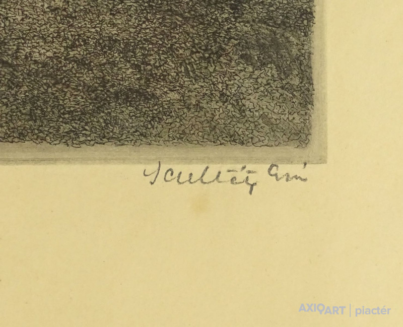 [1A032/109] Papír rézkarc, üveglap mögött, fenyő keretben. Jelezve jobbra lent: SCULTÉTY ÉVA Magasság: 45 cm Szélesség: 62 cm Súly: 1.8 kg Scultéty Éva (Imre Istvánné)  festő, grafikus Szeged, 1917-12-11 hirdetés Elhalálozott: , 2001. november 22. Képzőművészei tanulmányait szülővárosában kezdte. Első mestere Nyilassy Sándor volt. 1936-41: Magyar Képzőművészeti Főiskola, rajztanári oklevél, mesterei: Kandó László, Elekfy Jenő, Varga Nándor Lajos. Több nyugat-európai országban járt tanulmányúton, rövidebb ideig Kanadában is működött. Elsősorban csoportos bemutatókon szerepelt munkáival. Főként akvarelleket festett és rézkarcokat készített. Kedvelt műfaja a színes rézkarc volt. Lírai hangulatú tájkompozíciókat, virágcsendéleteket, zsánerjeleneteket alkotott. Válogatott csoportos kiállítások Válogatott csoportos kiállítások 1960 • 8. Magyar Képzőművészeti kiállítás, Műcsarnok, Budapest 1962 • 9. Magyar Képzőművészeti kiállítás, Műcsarnok, Budapest 1963 • II. Országos Grafikai Biennálé, Miskolc. Művek közgyűjteményekben Művek közgyűjteményekben Forrás: artportal.hu