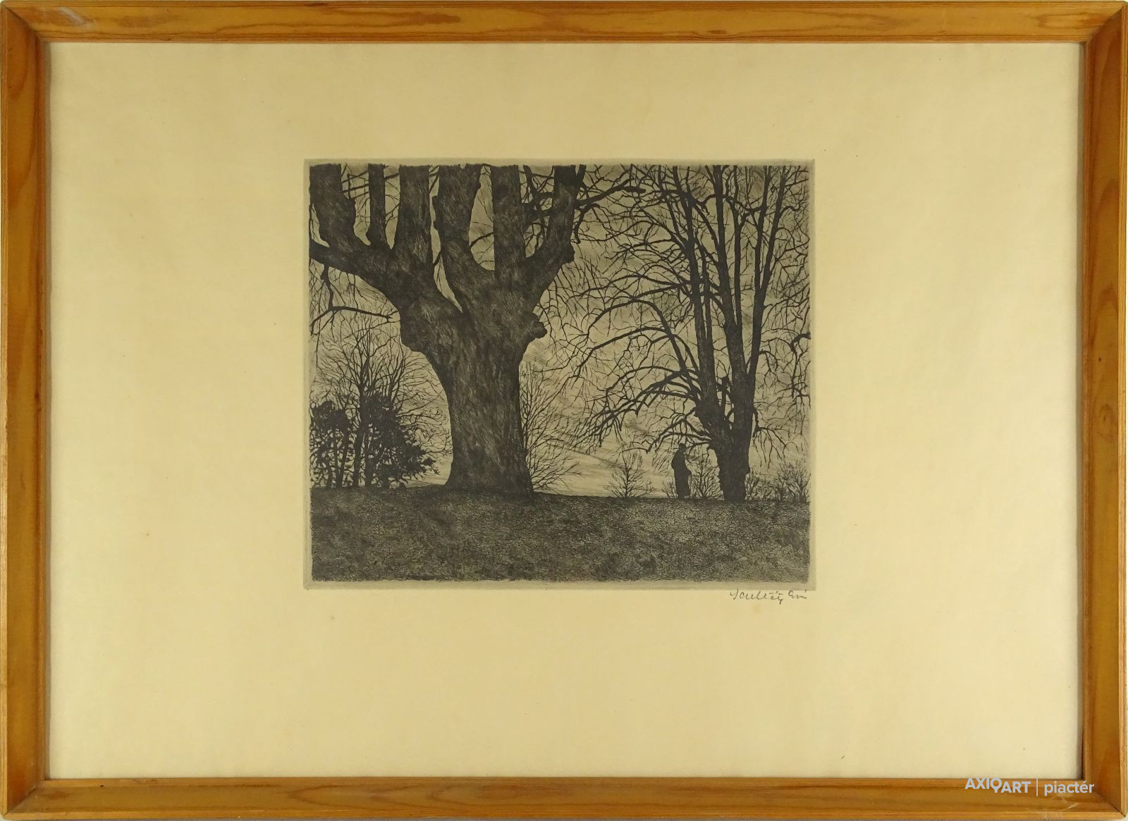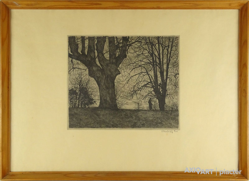 [FKC345/Bp93/94] A kép mérete: 15 x 17,5 cm keret nélkül. Készült: Rézkarc, Papír A kép Csillag József (Győrszentmárton, 1894, Budapest, 1977) alkotása. Jelezve lent "Asztag Csillag (ceruzával)" A festmény jó állapotban van. Keret: Új Magyar festők és grafikusok életrajzi lexikona I-II. Festő, grafikus. 1917-24 között a fővárosi Képzőművészeti Főiskolán tanult és szerzett rajztanári oklevelet. Révész Imre tanítványa volt. A '20-as években tanulmányúton járt Itáliában (Róma, Firenze, Velence, Pádova). Már főiskolás korában kezdett el dolgozni a pécsi és a kecskeméti művésztelepen. Első gyűjteményes tárlatát 1928-ban Pécsett rendezték festményeiből. 1929-ben rézkarcaiból rendeztek bemutatót Brüsszelben. Ezen kívül Firenzében és New Yorkban szerepelt kiállításokon. A '30-as évek folyamán többször műterem-kiállításon mutatta be alkotásait. Elsősorban tájképeket festett, a látványhoz hű, realista modorban. Kerültek ki keze alól magyar jellegű zsánerképek is. Rézkarcain is főként a táj szépségeit igyekezett megörökíteni. Tájképei stockholmi és hollandi múzeumokban is szerepelnek. (Éber, ML, Gyulai Gergely adatközlése nyomán) Magyar festők és grafikusok adattára A Képzőművészeti Főiskolán Révész Imre tanítványa volt. A kecskeméti művésztelepen is dolgozott. 1928-ban Kecskeméten, 1938-ban Velencében, 1935-ben Brüsszelben rendezett gyűjteményes kiállítást. Tájképei stockholmi, hollandiai múzeumokban is szerepelnek. - ML Magyar festők és grafikusok életrajzi lexikona I-II. Műgyűjtők és kereskedők kézikönyve Festő. A fővárosi Képzőművészeti Főiskolán Révész Imre tanítványa volt, majd külföldi tanulmányútra utazott. Gyűjteményes kiállításai voltak Brüsszelben, Firenzében és New Yorkban. Főként magyar jellegű zsánerképeket festett. 1931-ben "Fabán" c. képe kitüntető elismerést kapott. Tájképei stockholmi és hollandiai múzeumokban is szerepelnek. (Éber, ML) Művészeti lexikon I-IV. Festő, grafikus. Révész Imre tanítványa volt a Képzőművészeti Főiskolán, dolgozott a kecskeméti művésztelepen is. 1928-ban Kecskeméten, 1931-ben Velencében, 1935-ben Brüsszelben rendeztek gyűjt. kiállítást műveiből. Tájképei stockholmi, hollandiai múzeumokba is kerültek. Újabban rézkarcokat is készít.