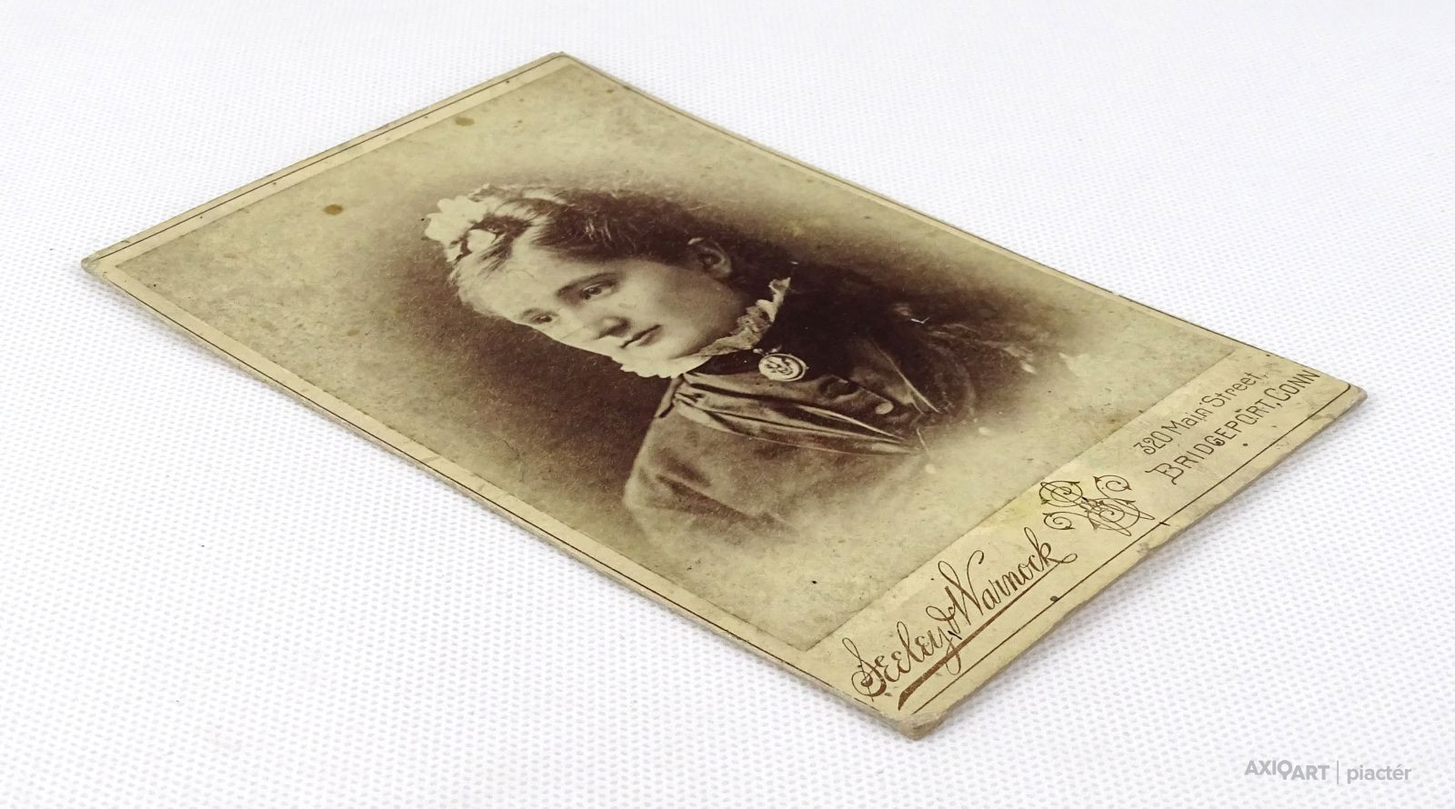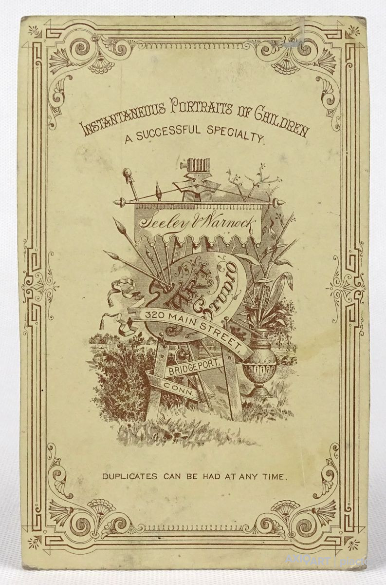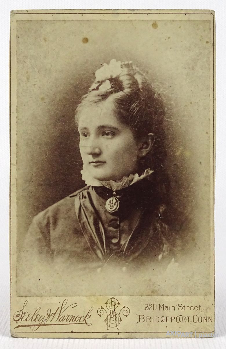 [1R097/143] 25% ÁRENGEDMÉNY MINDEN TERMÉKÜNKRE Dec. 14-ig Antik, szép állapotú, jelzett, fekete-fehér fotográfia, vizitkártya, női portré, ~1880 körül. A kép alatt jelzés: SEELEY & WARNOCK 320 MAIN STREET BRIDGEPORT CONN A fotó hátulján: INSTANTANEDUS PORTRAITS OF CHILDREN A SUCCESSFUL SPECIALITY SEELEY & WARNOCK ART STUDIO 320 MAIN STREET BRIDGEPORT CONN DUPLICATES CAN BE HAD AT ANY TIME Magasság: 16.5 cm Szélesség: 10.5 cm Súly: 0.015 kg