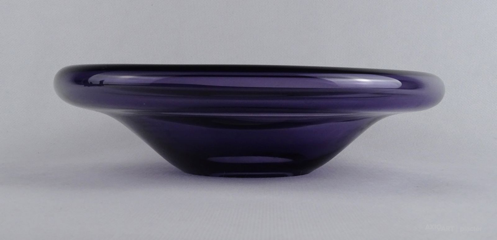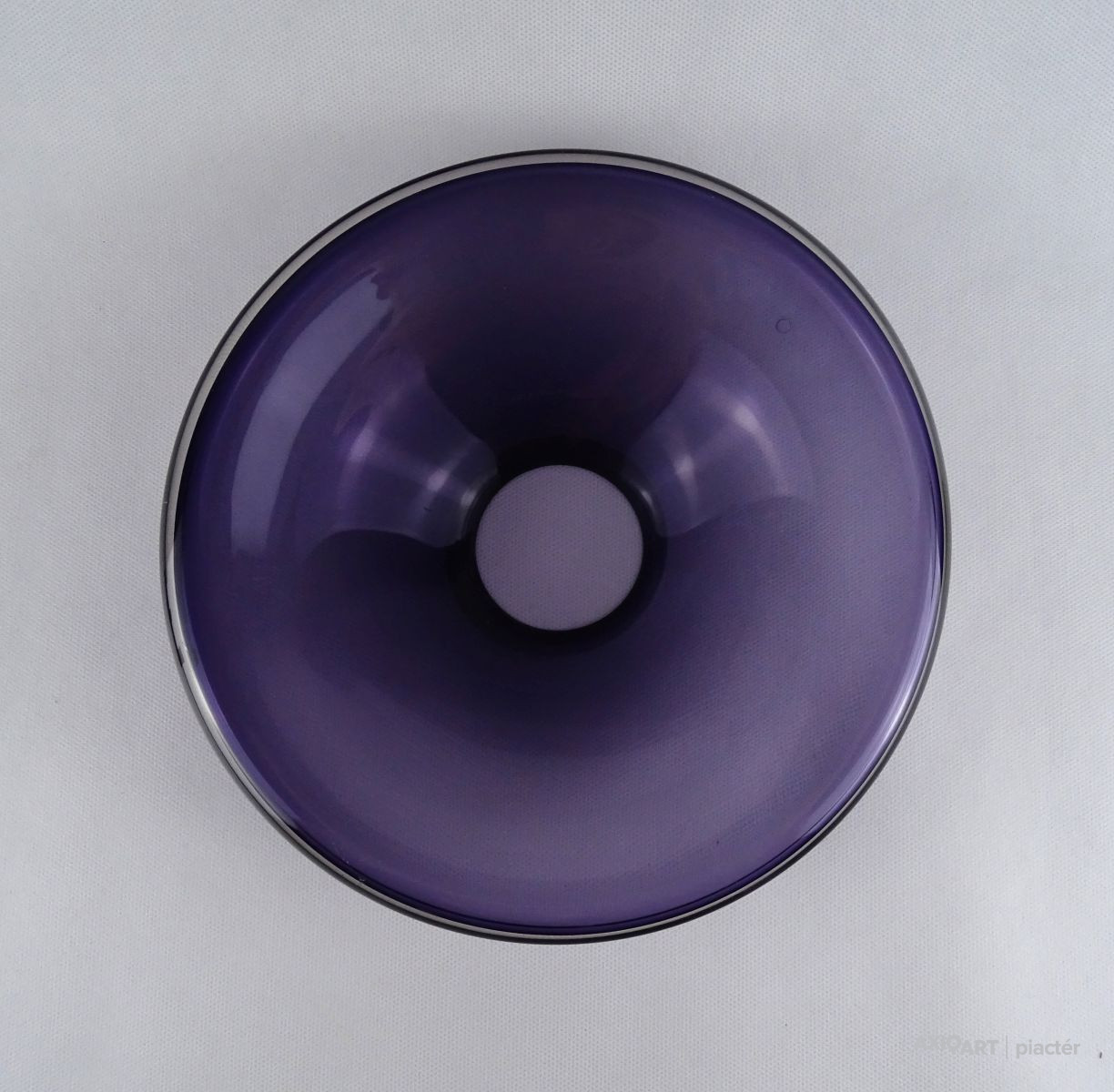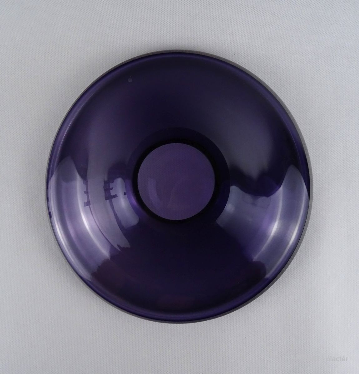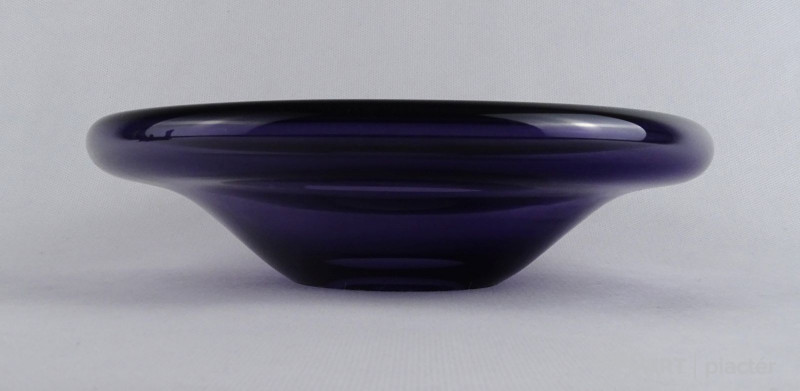Hibátlan állapotú, különleges, lila színű, vastag falú, üreges testű, művészi fújtüveg tál, tányér, kínáló. Skandináv design.