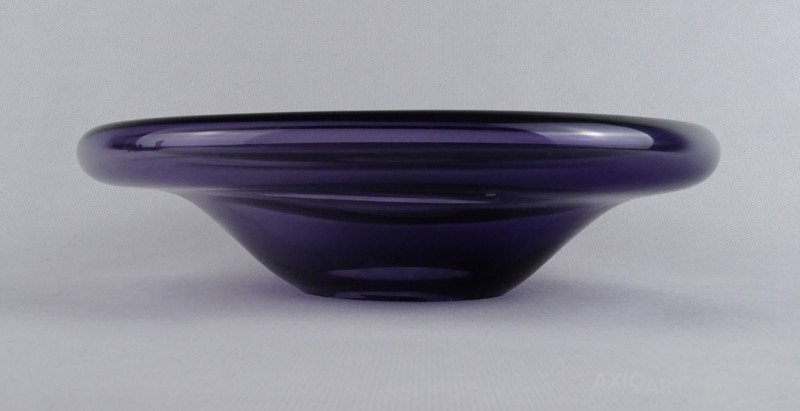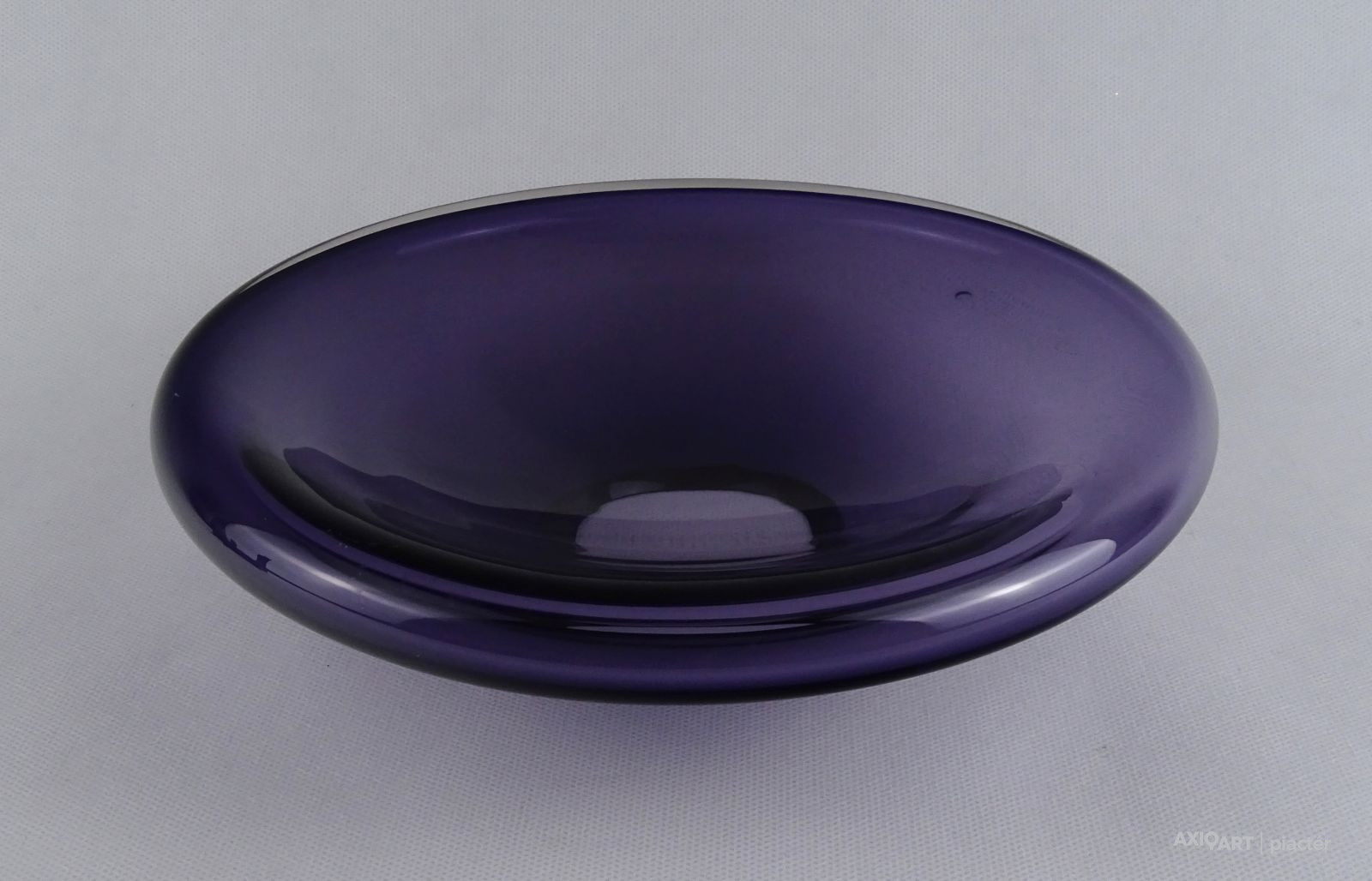 [1T559/Z259] Hibátlan állapotú, különleges, lila színű, vastag falú, üreges testű, művészi fújtüveg tál, tányér, kínáló. Skandináv design. Magasság: 6 cm Szélesség: 23.5 cm Súly: 1.36 kg