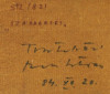 [1Y029/Z018] Olaj farost festmény, üveglap mögött, hibátlan képcsarnokos keretben. Hátoldalán Képcsarnok Vállalat papír címkéje: A művész neve: SCHÉNER MIHÁLY A kép címe: TÁJ Magasság: 66.5 cm Szélesség: 86 cm Súly: 6.54 kg Schéner Mihály festő, grafikus, szobrász, keramikus, bábtervező Medgyesegyháza, 1923-01-9 Elhalálozott: Budapest, 2009. május 11. Honlap: http://www.kormendigaleria.hu/kiadvany.html 1942-1947: Magyar Képzőművészeti Főiskola, tanára: Rudnay Gyula. 1978: Munkácsy-díj; 1984: érdemes művész; 1989: kiváló művész; 1995: Kossuth-díj. 1992-től a Magyar Művészeti Akadémia, 1993-tól a Széchenyi Irodalmi és Művészeti Akadémia tagja. 1956-ig tanított. 1982: Nagyatádi Faszobrász Alkotótelep, 1985: Nemzetközi Acélszobrász Alkotótelep, Dunaújváros. A stílusában felismerhető, mégis sokféle műtárgyat létrehozó ~ gazdag, állandóan alakuló életműve a folyton változó világban helyét kereső, az alkotói szabadságot megvalósító XX. századi képzőművész példázata lehetne. Magát expresszív-szürrealista alkotónak nevezi. Egyaránt dolgozik festékkel, textillel, fával, fémmel. Rajzol, szerkeszt, farag, épít, gyúr, varr és ragaszt, felhasználja a mézesbábok öntőformáit. Festő, rajzoló, textilszobor- és bábkészítő, fazekas, asztalos, esztergályos. Háromlépcsős folyamatban gondolkozik: rajzban tervez, majd fest, szobrot készít, “formába önt”, mindig a végső plasztikai megoldást keresi. Ami állandó és mégis játékosan változékony megjelenésű Schéner művészetében, az a gyermekkori emlékek által meghatározott népi mesterségek iránti tiszteletet kifejező motívumkincs, a tárgyi folklór formakészlete, amely már-már kézjegyként ismétlődik munkáin. Mitologikussá nőtt képzelete új lényeket teremt, pl: a Pigulát, amely disznótestű, emberfejű teremtmény. Schéner festményein a szürrealista motívumokat konstruktív szerkezetbe rendezi, a geometriát és az organikus természeti motívumokat egyaránt beépíti műveibe. A népi, népművészeti formakincsből merített lovas huszárok, betyárok, szegénylegények cifra szűr mentéje, piros csákója, fekete csizmája, az önálló életet élő zsinórdíszek és mézeskalács bábok, a kiskocsik a gyermekkori vásárok, búcsúk színes forgatagába vezet. A primér motívumokat aztán felváltják a vastagon felhordott felületbe karcolt jelek, vonalhálózatok, amelyek a játszó gyermek homokba rajzolt ábráit, a pásztorember fába vésett üzeneteit, az ősember barlang falába rótt mágikus jeleneteit idézik meg. A művész pillanatnyi érdeklődésének megfelelően a színek búvópatakként tűnnek el és jelennek meg ismét. A 60-as években leginkább a formákkal való játék érdekelte, a festmények felülete egyre gazdagodott: a táblaképek felületén applikációk jelentek meg, vagy lemállasztott rétegek hagyták maguk után hiányukat, motívumok nélküli ősformák, archetipikus képzetek bukkantak fel művészetében. A véletlenszerűnek látszó rétegekkel való játék azonban tudatos komponálás eredménye, amely később nyilvánvaló ritmusnak és formai szerkesztettségnek adja át a helyét, mint a Törvénytáblák c. sorozaton. A különböző művészi kifejezési formák egymásra termékenyítő hatással vannak, át- meg áthatják egymást. Textilszobrai, amelyekkel új műfajt teremtett, ugyanazzal az automatikus, expresszív-szürrealista módszerrel készülnek, mint festményei. A hagyományosan a népművészetben alkalmazott anyag, a filc lehetőséget ad a népi formakincs felelevenítésére, amely azonban a művész különös szürrealista átiratában jelenik meg. A szívekkel kivarrt, zsinórdíszes Posztókotlós c. művén mézesbábok lógnak, hátán huszárok lovagolnak. Egész sor textilből készült kéz-plasztikát alkot, amelyeket az ujjakra rávarrt díszekkel öltöztet, személyesít meg. A színes-különös világból aztán ~ újra puritán képi és formai rendbe juttatja el a nézőt, majd nemsokára tépett, gyűrt, vágott, csorgatott, repedezni hagyott szenvedélyesen vonagló képi felületeket hagy hátra. Schéner készített apró gyermekjátékokat, térstruktúra-tereket, mászókákat is. A magyar népi formák mellett szürreális játékaiban gyakran alkalmaz görög mitológiai alakokat, “elkentaurosodott” lovakat, Gorgó-fejeket, sellőket, hárpiákat, Pán-ábrázolásokat. Schéner nemcsak saját művészetéről publikál, hanem művésztársairól is számos írása jelenik meg, elsősorban az Új Auróra c. folyóiratban, amelynek egy ideig főmunkatársa volt. Irodalom kiállítása, Magyar Építőművészet, 1962/4. Húsz év után, Művészet, 1965/4. BOZÓKY M.: ~, Tiszatáj, 1968/5. PERNECZKY G.: Nincs uborkaszezon, Élet és Irodalom, 1969. augusztus 8. BARÁNSZKY-JÓB L.: ~, Művészet, 1969/9. LÁSZLÓ GY.: ~ kaposvári kiállítása, Jelenkor, 1969/4. MAJOR M.: Pásztorok, betyárok, huszárok - kezek, Tükör, 1970. szeptember 15. FRANK J.: Bemutatjuk ~t, Élet és Irodalom, 1972. május 6. ról kiállítása ürügyén, Képzőművészeti Almanach, Budapest, 1972 Sötétkék kokasok, Élet és Irodalom, 1973. szeptember 9. MAJOR M.: ~ játékai, Élet és Irodalom, 1974. július 27. BARTA J.: Egy különös művész, Alföld, 1974/6. VADAS J.: Szárnykészítők, Élet és Irodalom, 1975. október 4. JUHÁSZ F.: A halál ellen játszani, Élet és Irodalom, 1975. május 17. PAP G.: Kincsek és műkincsek, Művészet, 1975/6. P. SZŰCS J.: Az utak kettéválnak, Művészet, 1978/3. Békési művészet, Művészet, 1978/7. SZAMOSI F.: ~ [kismonográfia], Budapest, 1978 VADAS J.: Játék a játékkal, Élet és Irodalom, 1979. augusztus 18. NÉMETH L.: ~ műveiről, Művészet, 1979/4. MIKLÓS P.: Mit akar ez a múzeum?, Művésze