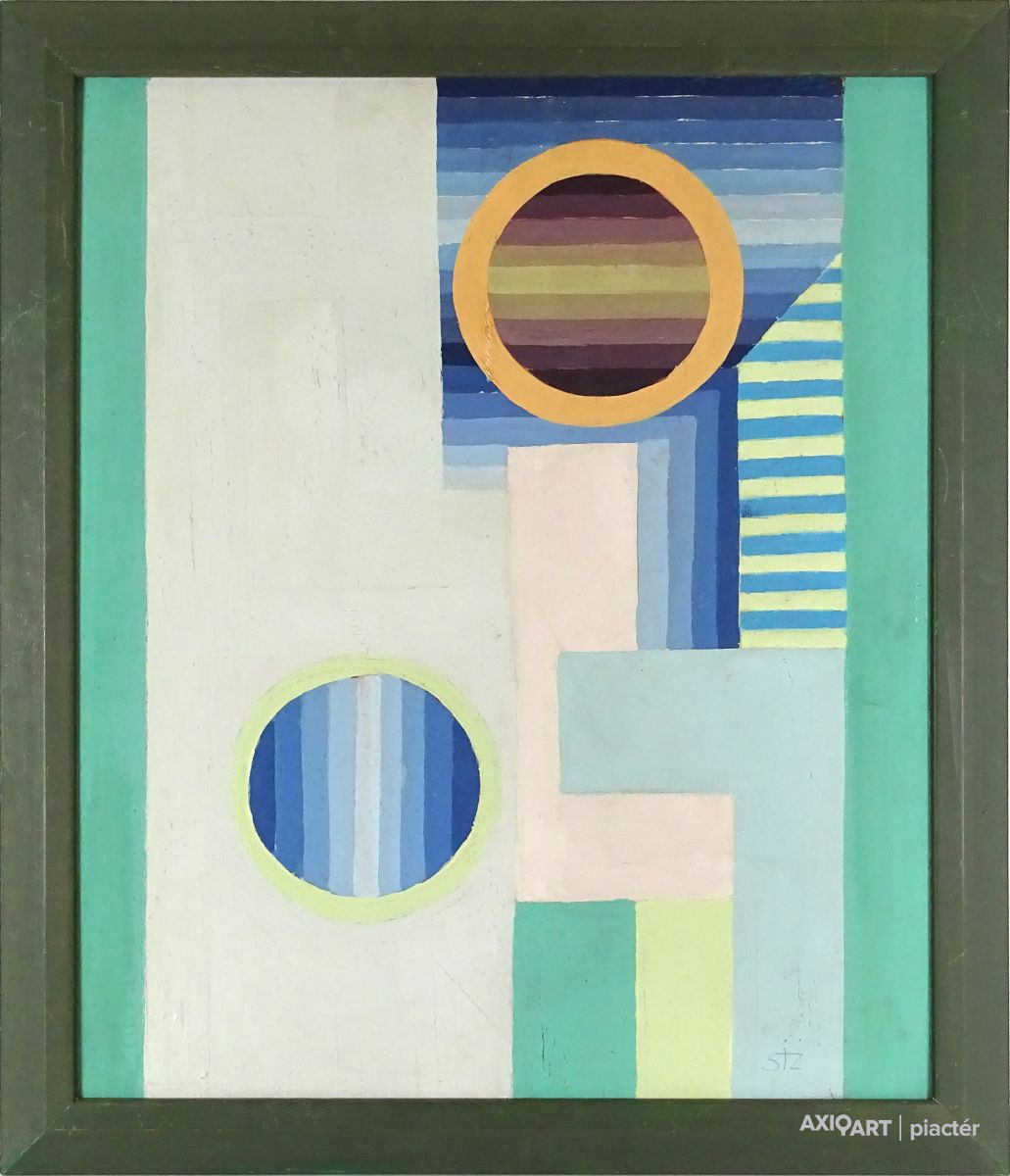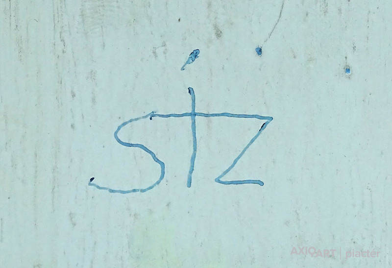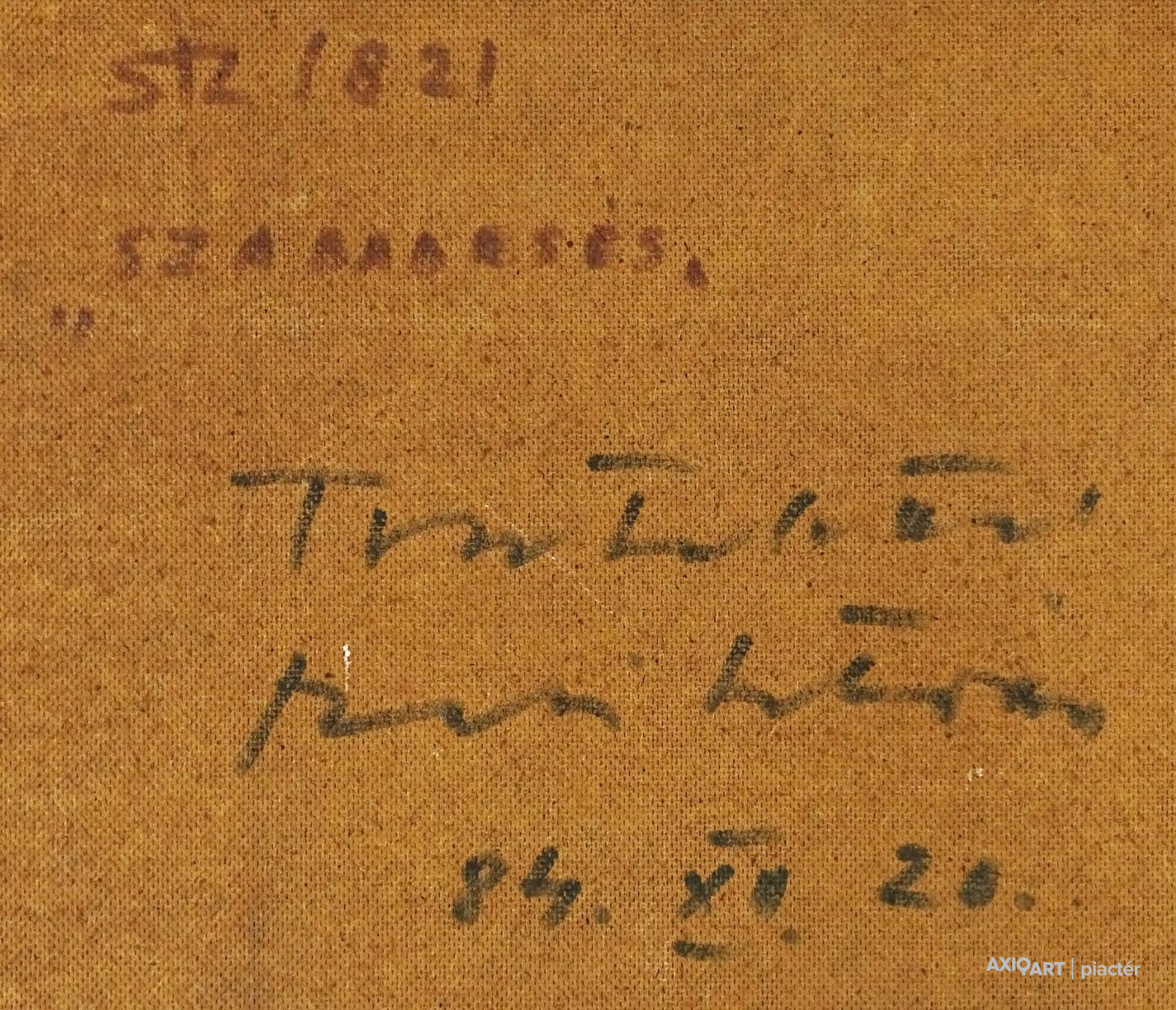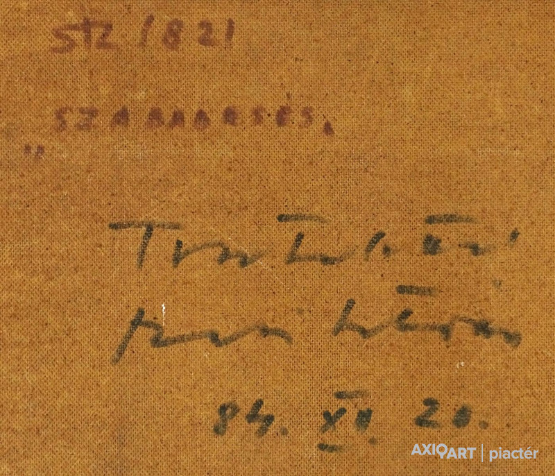 [FK0037/Z018] A kép mérete: 50 x 70 cm keret nélkül. Készült: Olaj, Vászon A kép Paizs László (Szentpéterúr, 1935) alkotása. Jelezve Jobbra lent "P. L." A festmény jó állapotban van. Keret: Ép A festmény hátoldalán a Képcsarnokvállalat címkéje található. Magyar festők és grafikusok életrajzi lexikona I-II. Festő. Tanulmányait a budapesti Iparművészeti Főiskolán végezte 1959-ben. Z. Gács György, Rákosy Zoltán és Szentiványi Lajos növendéke volt. A '60-as évek első felében hagyományosabb felfogású olajképeket festett, mozaikokat, freskókat, utóbb a pop-art körébe tartozó, a francia Arman munkáival rokon műveket alkotott. 1961 óta kiállító művész. Egyéni (Fényes Adolf Terem, Csók Galéria, Műcsarnok, Magyar Nemzeti Galéria, Halászbástya, Bástya Galéria, Vigadó Galéria, Budapest Galéria, Győr, Szombathely, Szeged, Zalaegerszeg, Duisburg, Aix-en-Provence, stb). és vegyes (Ernst Múzeum, Műcsarnok, Óbuda Galéria, Magyar Nemzeti Galéria, Csók Galéria, Vigadó Galéria, Székesfehérvár, Kaposvár, Pécs, Hódmezővásárhely, Firenze, Milano, Padova, Nápoly, Velence, Düsseldorf, Aachen, Genf, stb) tárlatokon vett részt. 1980-ban Munkácsy-díjjal jutalmazták, 1988-ban Érdemes Művész kitüntető elismerésben részesült. Munkáit őrzi a Magyar Nemzeti Galéria, a Fővárosi Képtár, a szombathelyi képtár, a pécsi Janus P. Múzeum, a székesfehérvári István Király Múzeum és a dunaszerdahelyi Kortárs Magyar Galéria. (H.B.: Műv, 1972/4, K.Gy.: Műv. 1977/2, K.G.: Műv. 1978/10, M.L.: Műv, 1983/5, R.G.: Műv, 1987/9, Sz.Gy.: Új Műv. 1995/4, MK) Magyar festők és grafikusok életrajzi lexikona I-II. Műgyűjtők és kereskedők kézikönyve Festő. Tanulmányait a bp.-i Iparművészeti Főiskolán végezte. Mozaikokat ferskókat, utóbb a pop-art körébe tartozó, a francia Arman műveivel rokon műveket alkotott. Mozaikok: a Szegedi Megyei Tanács, a Pécsi Óvoda, a Gödöllői Agrártudományi Egyetem. Freskók: Budapest - Csatárka úti Gyermekotthon. 1971-ben a Fényes Adolf Teremben volt kiállítása, 1983-ban pedig a szegedi Móra Ferenc Múzeumban nagyszabású tárlatokon mutatta be munkáit. 1988-ban érdemes művész kitüntető elismerésben részesült. (MK) Magyar festők és grafikusok adattára Az Iparművészeti Főiskolán végzett 1959-ben. Mozaikokat (Szeged, Megyei Tanács; Pécs, Óvoda; Gödöllő, Agrártudományi Egyetem), freskókat (Budapest, Csatárka úti Gyermekotthon), újabban a pop art körébe tartozó, a francia Arman műveivel rokon műveket alkotott. 1971-ben a Fényes Adolf Teremben nyílt kiállítása. 1983 februárjában a szegedi Móra Ferenc Múzeumban megrendezett nagyszabású tárlaton mutatta be alkotásait. 1988-ban érdemes művész kitüntető elismerésben részesült. - MK Művészeti lexikon I-IV. (Szentpéterur, 1935. dec. 26.- ): festő. Az Iparművészeti Főiskolán 1959-ben végzett Rákosy Zoltán, Z. Gách György és Szentiványi Lajos növendékeként. Épületdiszítő mozaikokat, (Szeged, Megyei Tanács, 1961; Pécs, Óvoda, 1964), műanyagfreskókat (Bp., Csatárka úti Gyermekotthon, 1964) és gobelinterveket készít. Kortárs magyar művészeti lexikon I-III. Festő, szobrász, grafikus. 1959: MIF, mesterei: Z. Gács György, Rákosy Zoltán, Szentiványi Lajos. 1980: Munkácsy-díj; 1988: érdemes művész. Főiskolás éveinek második felében, majd azt követően számos murális munka kivitelezésében vett részt, Fónyi Géza, Konecsni György, Z. Gács György, Rákosi Zoltán és Domanovszky Endre mellett dolgozva. A 60-as évek első felének hagyományosabb fölfogású olajképeket festett. 1964-ben a Velencei B.-n megismerkedett az amerikai pavilonban a pop art Európában akkor még újnak számító törekvésével, és részben ez inspirálta, hogy 1967-ben textil, fém, bőr anyagú "varrottas" képeket küldjön az FKS éves tárlatára; a megnyitó előtt többek között az ő munkáit is eltávolították a falról. A 70-es években pop art-os objekteket (A trónörököspár politikai gyilkosság áldozata lett, 1970, plexiüveg, újság, szarvasbogarak), majd konstruktív, átlátszó plexiüveg plasztikákat készített belső fénytörő határfelületekkel. A 80-as években készültek az anyagában színezett, konstruktív, nagyméretű poliészter szobrai, majd színes poliészter táblaképeket alkotott, mesterségesen roncsolt felületekkel, mintha régészeti leletek vagy atomtámadás utáni festmény-szurrogátumok lennének. Ekkor kezdett organikus plaszikájú bronzszobrokat is mintázni. A 90-es években, a táblaképek és szobrok mellett nagyméretű, egyedi grafikákat készített, formavilágában némileg a roncsolt táblaképekből kiindulva, de szinte kizárólag az emberi alakból elvonatkoztatott torzókat megjelenítve. Ek: 1966: Művészklub, Győr; 1971: Fényes A. T.; 1972: Bercsényi 28-30 G.; 1973: BME B-épület; 1976: Csók G.; 1977: G. Hildebrandt, Duisburg (NSZK); 1979: Bástya G., Halászbástya; Helyőrségi Műv. H., Nagyatád; József A. Műv. Közp., Szeged; Göcsej M., Zalaegerszeg; 1982: Bezzegh G., Küsnacht (CH); 1983: Móra F. M., Szeged; 1987: Műcsarnok (kat.); MNG; 1988: Pandora G., Badacsonytomaj; 1989: Parktheatter, Iserlohn (NSZK); Qualitas G.; Hevesi S. Színház, Zalaegerszeg; 1990: Vasarely Fondation (Ferdinánd Judittal, Fóth Ernővel), Aix-en-Provence (FR); 1994: Vigadó G.; 1997: Pest Center G.; 1998: Budapest G. (kat.); 1999: Pest Center G. (kat); G. Arcis, Sárvár; MMA, Bp.; 2001: SZK, Szhely; Ernst M. (kat.) Vcsk: 1961, 1964, 1966: FKS, Ernst M.; 1962: 9. Magyar Képzőműv. kiállítás, Műcsarnok; 1967: Mai magyar festészet, Új-Delhi; 1969: Vas megyei művészek, Savaria M., Szhely; V. Orsz. Grafikai B., Miskolc; 1971: Új művek, Műcsarnok; 1972: Fiatal művészek Budapestről. Likovni Salon, Újvidék (YU); 1972, 1973: Balatonboglár