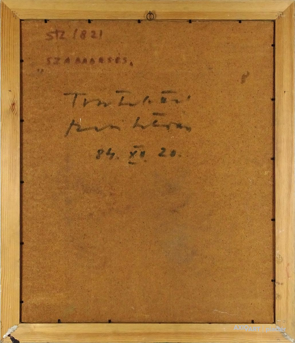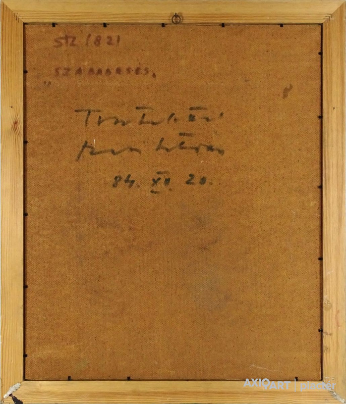[FK2668/Bp301/4] A kép mérete: 50,5 x 80,5 cm keret nélkül. Készült: Olaj, Vászon A kép Moldován István (Kolozsvár, 1911) alkotása. Jelezve Jobbra lent "Moldován István" A festmény jó állapotban van. Keret: Ép A festmény hátoldalán a Képcsarnokvállalat raglapja láltható. Magyar festők és grafikusok életrajzi lexikona I-II. Festő. Tanulmányait Kolozsvárott, a Szépművészeti Főiskolán kezdte 1930-ban. A következő esztendőben a nagybányai Szépművészeti Iskolában Thorma János és Krizsán János korrektúráján képezte magát. 1931-ben a budapesti Képzőművészeti Főiskola hallgatója lett. Réti István, később Szőnyi István volt a mestere. Már mint főiskolás sok díjat és kitüntetést nyert. 1948-ban megkapta a római ösztöndíjat, de lemondva róla, Erdélybe ment. 1948-1950 között Erdélyben élt, és népművészetben gazdag vidékein festett. 1943-ban Kolozsvárott, 1946-ban Gyöngyösön, 1955-ben, 1959-ben és 1962-ben a Kulturális Kapcsolatok Intézetében, illetve a Csók Galériában rendezett egyéni bemutatókat. Ezen kívül több Európai országban, az USA-ban, Kanadában és Indiában is bemutatta munkáit. Eleinte sajátos atmoszférájú, lírai tájképeket, eleven színvilágú képmásokat festett, később mondernebb, erőteljesebben szerkesztett művekkel jelentkezett. A Pécsi Tanárképző Főiskola számára mozaikot készített. Erdély szerelmese volt. A székely népművészet gazdag formavilágának hatása döntő jelentőségűvé vált sokoldalú művészetében. Műv. díjak: a Szinyei Társaság elismerő oklevele, a Főváros festészeti-díja, "Kolozsvár a képzőművészetben" II. díj, állami ösztöndíj, római ösztöndíj, a Képzőművészek Szövetsége Észak-Magyarországi festészeti díja, SZOT festészeti díj. Több murális művet (mozaik) alkotott. A Magyar Nemzeti Galéria több alkotását őrzi. (M. L.: Műv. 1967/6, RI-NM) Magyar festők és grafikusok életrajzi lexikona I-II. Műgyűjtők és kereskedők kézikönyve Festő. Tanulmányait a kolozsvári Szépművészeti Főiskolán kezdte 1930-ban. A nagybányai szabadiskolában is megfordult. Itt Thorma János és Krizsán János korrektúráján képezte magát. 1931-ben Budapesten a Képzőművészeti Főiskola hallgatója lett. Réti István, később Szőnyi István volt a mestere. Már mint főiskolás sok díjat nyert. 1948-ban megkapta a római ösztöndíjat, de lemondva róla, Erdélybe ment. 1948-1950 k. Erdélyben élt, és népművészetben gazdag vidékein festett. 1943-ban Kolozsváron, 1946-ban Gyöngyösön, 1955-ben, 1959-ben és 1962-ben a Kulturális Kapcsolatok Intézetében, illetve a Csók Galériában rendezett önálló kiállítást. Ezen kívül több Európai országban, az USA-ban, Kanadában és Indiában is bemutatta műveit. Eleinte sajátos atmoszférájú, lírai tájképeket, eleven színvilágú képmásokat festett, később mondernebb, erőteljesebben szerkesztett művekkel jelentkezett. A Pécsi Tanárképző Főiskola számára mozaikot készített. Erdély szerelmese volt. A székely népművészet gazdag formavilágának hatása döntő jelentőségűvé vált sokoldalú művészetében. 1942-ben megkapta a Szinyei Társaság elismerését, és a Főváros festészeti-díjat,1943-ban elnyerte a "Kolozsvár a képzőművészetben" c. díjat. 1947-ben állami ösztöndíjat,1948-ban a római ösztöndíjat, 1972-ben a Képzőművészek Szövetsége Észak-Magyarországi festészeti díját kapta meg. A MNG több művét őrzi. (M. L.: Műv.-1976/6) Magyar festők és grafikusok adattára Tanulmányait Kolozsvárott a Képzőművészeti Főiskolán, majd Nagybányán Thorma János és Krizsán János irányítása mellett kezdte, 1931-től Budapesten megszakításokkal a Képzőművészeti Főiskolán Réti István és Szőnyi István növendékeként fejezte be. 1949-ben és 1950-ben ösztöndíjjal dolgozott Erdélyben, majd hosszú tanulmányutakra indult Nyugat-Európába, az Egyesült Államokba, s a Szovjetunióba. Először Kolozsvárott lépett a nyilvánosság elé 1943-ban, majd 1946-ban Egerben és Gyöngyösön, 1947-ben Miskolcon, 1948-ban Hatvanban, 1955, 1961 és 1981-ben a Csók Galériában, 1959-ben a KKI-ben, 1960-ban Nagykanizsán, 1963-ban Kiskunfélegyházán, 1966-ban Debrecenben, 1969 és 1975-ben Békéscsabán, 1971-ben a Mednyánszky Teremben, 1973-ban Gyöngyösön és Debrecenben, 1977-ben Egerben, 1979-ben Veszprémben, 1983-ban Miskolcon, 1984-ben Csepelen, 1986-ban a Vigadó Galériában rendezett önálló kiállítást. Külföldi kiállításai: Moszkva, Varsó, India, Szófia, Párizs, Bukarest, Belgrád, New York, Montreál és Toronto. Eddig közel kétezer színes táblaképet festett, de szívesen foglalkozik mozaikkészítéssel is. 1964-ben a Pécsi Pedagógiai Főiskola, 1968-ban a Salgótarjáni Kórház, 1969-ben a názáreti templom és 1970-ben a Videoton Vállalat díszterme részére mozaikot készített. - Erdély szerelmese. A székely népművészet gazdag formavilágának hatása döntő jelentőségűvé vált festészetében. Olyan formanyelvet alakított ki magának, amely színvilágában és summázó formaalakításában sajátos erdélyi zamat érződik, ugyanakkor korszerűen modern is konstruktivista stílusa. Munkásságát 1942-ben a Szinyei Társaság elismerésével és a Fővárosi festészeti-díjjal, 1943-ben Római-ösztöndíjjal, 1947-ben Állam ösztöndíjjal (Románai), 1963-ben a SZOT festészeti-díjával, 1972-ben a Képzőművészek Szövetsége Észak-Magyarországi festészeti-díjával tüntették ki. - Irod.: Bíró Béla: Kolozsváry Moldován István. Erdélyi Helikon, 1943.; Felvinczi Takács Zoltán: Kolozsváry Moldován István. Kolozsvár, 1943.; Dutka Mária: Magyar Nemzet, 1961.; Maksay László: Moldován István. Művészet, 1965.; D. Fehér Zsuzsa. Moldován István, Bp. 1971.; Theisler G