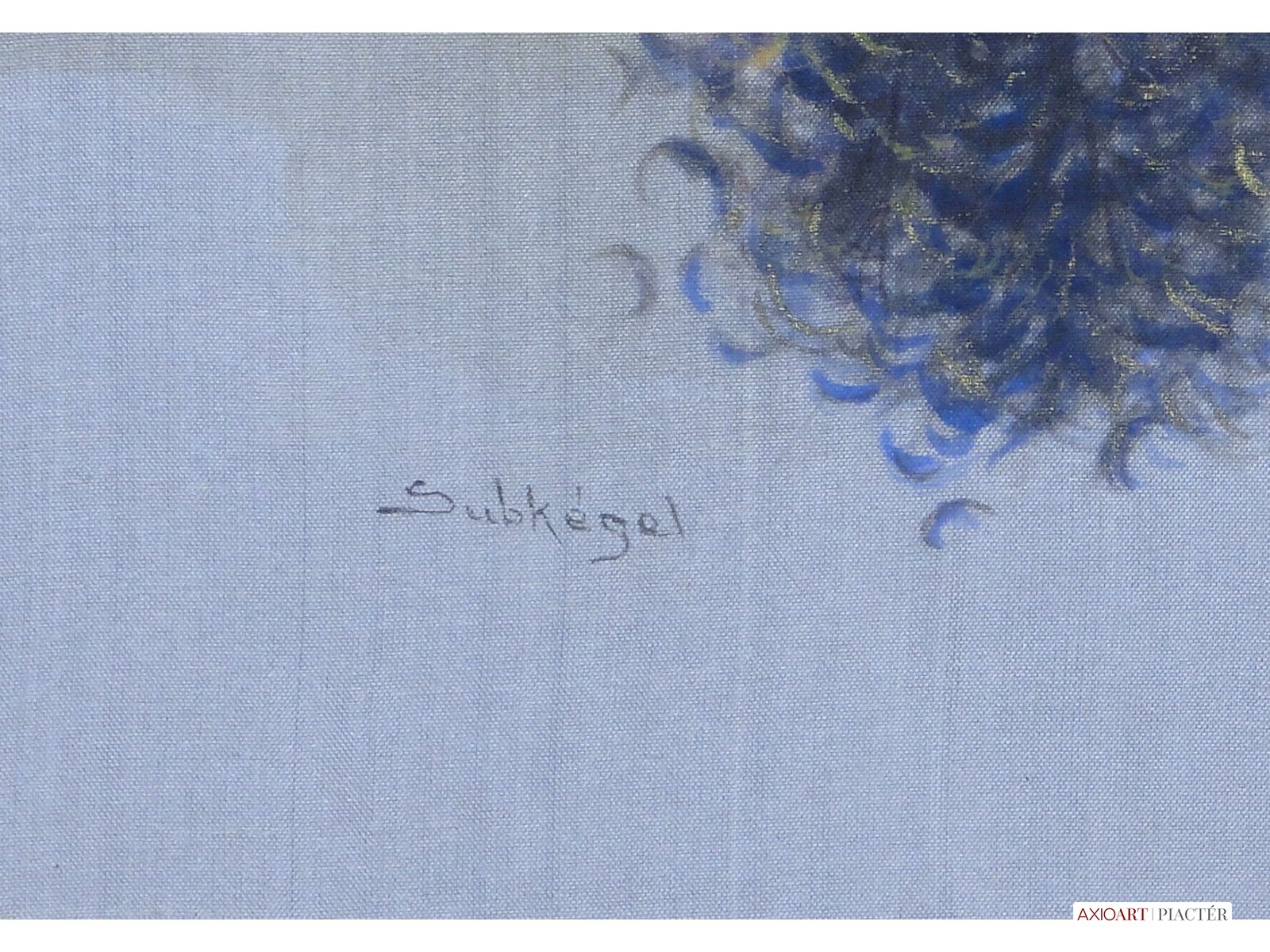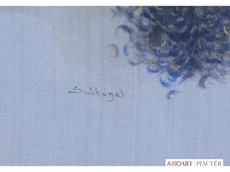 [FK0037/Z018] A kép mérete: 50 x 70 cm keret nélkül. Készült: Olaj, Vászon A kép Paizs László (Szentpéterúr, 1935) alkotása. Jelezve Jobbra lent "P. L." A festmény jó állapotban van. Keret: Ép A festmény hátoldalán a Képcsarnokvállalat címkéje található. Magyar festők és grafikusok életrajzi lexikona I-II. Festő. Tanulmányait a budapesti Iparművészeti Főiskolán végezte 1959-ben. Z. Gács György, Rákosy Zoltán és Szentiványi Lajos növendéke volt. A '60-as évek első felében hagyományosabb felfogású olajképeket festett, mozaikokat, freskókat, utóbb a pop-art körébe tartozó, a francia Arman munkáival rokon műveket alkotott. 1961 óta kiállító művész. Egyéni (Fényes Adolf Terem, Csók Galéria, Műcsarnok, Magyar Nemzeti Galéria, Halászbástya, Bástya Galéria, Vigadó Galéria, Budapest Galéria, Győr, Szombathely, Szeged, Zalaegerszeg, Duisburg, Aix-en-Provence, stb). és vegyes (Ernst Múzeum, Műcsarnok, Óbuda Galéria, Magyar Nemzeti Galéria, Csók Galéria, Vigadó Galéria, Székesfehérvár, Kaposvár, Pécs, Hódmezővásárhely, Firenze, Milano, Padova, Nápoly, Velence, Düsseldorf, Aachen, Genf, stb) tárlatokon vett részt. 1980-ban Munkácsy-díjjal jutalmazták, 1988-ban Érdemes Művész kitüntető elismerésben részesült. Munkáit őrzi a Magyar Nemzeti Galéria, a Fővárosi Képtár, a szombathelyi képtár, a pécsi Janus P. Múzeum, a székesfehérvári István Király Múzeum és a dunaszerdahelyi Kortárs Magyar Galéria. (H.B.: Műv, 1972/4, K.Gy.: Műv. 1977/2, K.G.: Műv. 1978/10, M.L.: Műv, 1983/5, R.G.: Műv, 1987/9, Sz.Gy.: Új Műv. 1995/4, MK) Magyar festők és grafikusok életrajzi lexikona I-II. Műgyűjtők és kereskedők kézikönyve Festő. Tanulmányait a bp.-i Iparművészeti Főiskolán végezte. Mozaikokat ferskókat, utóbb a pop-art körébe tartozó, a francia Arman műveivel rokon műveket alkotott. Mozaikok: a Szegedi Megyei Tanács, a Pécsi Óvoda, a Gödöllői Agrártudományi Egyetem. Freskók: Budapest - Csatárka úti Gyermekotthon. 1971-ben a Fényes Adolf Teremben volt kiállítása, 1983-ban pedig a szegedi Móra Ferenc Múzeumban nagyszabású tárlatokon mutatta be munkáit. 1988-ban érdemes művész kitüntető elismerésben részesült. (MK) Magyar festők és grafikusok adattára Az Iparművészeti Főiskolán végzett 1959-ben. Mozaikokat (Szeged, Megyei Tanács; Pécs, Óvoda; Gödöllő, Agrártudományi Egyetem), freskókat (Budapest, Csatárka úti Gyermekotthon), újabban a pop art körébe tartozó, a francia Arman műveivel rokon műveket alkotott. 1971-ben a Fényes Adolf Teremben nyílt kiállítása. 1983 februárjában a szegedi Móra Ferenc Múzeumban megrendezett nagyszabású tárlaton mutatta be alkotásait. 1988-ban érdemes művész kitüntető elismerésben részesült. - MK Művészeti lexikon I-IV. (Szentpéterur, 1935. dec. 26.- ): festő. Az Iparművészeti Főiskolán 1959-ben végzett Rákosy Zoltán, Z. Gách György és Szentiványi Lajos növendékeként. Épületdiszítő mozaikokat, (Szeged, Megyei Tanács, 1961; Pécs, Óvoda, 1964), műanyagfreskókat (Bp., Csatárka úti Gyermekotthon, 1964) és gobelinterveket készít. Kortárs magyar művészeti lexikon I-III. Festő, szobrász, grafikus. 1959: MIF, mesterei: Z. Gács György, Rákosy Zoltán, Szentiványi Lajos. 1980: Munkácsy-díj; 1988: érdemes művész. Főiskolás éveinek második felében, majd azt követően számos murális munka kivitelezésében vett részt, Fónyi Géza, Konecsni György, Z. Gács György, Rákosi Zoltán és Domanovszky Endre mellett dolgozva. A 60-as évek első felének hagyományosabb fölfogású olajképeket festett. 1964-ben a Velencei B.-n megismerkedett az amerikai pavilonban a pop art Európában akkor még újnak számító törekvésével, és részben ez inspirálta, hogy 1967-ben textil, fém, bőr anyagú "varrottas" képeket küldjön az FKS éves tárlatára; a megnyitó előtt többek között az ő munkáit is eltávolították a falról. A 70-es években pop art-os objekteket (A trónörököspár politikai gyilkosság áldozata lett, 1970, plexiüveg, újság, szarvasbogarak), majd konstruktív, átlátszó plexiüveg plasztikákat készített belső fénytörő határfelületekkel. A 80-as években készültek az anyagában színezett, konstruktív, nagyméretű poliészter szobrai, majd színes poliészter táblaképeket alkotott, mesterségesen roncsolt felületekkel, mintha régészeti leletek vagy atomtámadás utáni festmény-szurrogátumok lennének. Ekkor kezdett organikus plaszikájú bronzszobrokat is mintázni. A 90-es években, a táblaképek és szobrok mellett nagyméretű, egyedi grafikákat készített, formavilágában némileg a roncsolt táblaképekből kiindulva, de szinte kizárólag az emberi alakból elvonatkoztatott torzókat megjelenítve. Ek: 1966: Művészklub, Győr; 1971: Fényes A. T.; 1972: Bercsényi 28-30 G.; 1973: BME B-épület; 1976: Csók G.; 1977: G. Hildebrandt, Duisburg (NSZK); 1979: Bástya G., Halászbástya; Helyőrségi Műv. H., Nagyatád; József A. Műv. Közp., Szeged; Göcsej M., Zalaegerszeg; 1982: Bezzegh G., Küsnacht (CH); 1983: Móra F. M., Szeged; 1987: Műcsarnok (kat.); MNG; 1988: Pandora G., Badacsonytomaj; 1989: Parktheatter, Iserlohn (NSZK); Qualitas G.; Hevesi S. Színház, Zalaegerszeg; 1990: Vasarely Fondation (Ferdinánd Judittal, Fóth Ernővel), Aix-en-Provence (FR); 1994: Vigadó G.; 1997: Pest Center G.; 1998: Budapest G. (kat.); 1999: Pest Center G. (kat); G. Arcis, Sárvár; MMA, Bp.; 2001: SZK, Szhely; Ernst M. (kat.) Vcsk: 1961, 1964, 1966: FKS, Ernst M.; 1962: 9. Magyar Képzőműv. kiállítás, Műcsarnok; 1967: Mai magyar festészet, Új-Delhi; 1969: Vas megyei művészek, Savaria M., Szhely; V. Orsz. Grafikai B., Miskolc; 1971: Új művek, Műcsarnok; 1972: Fiatal művészek Budapestről. Likovni Salon, Újvidék (YU); 1972, 1973: Balatonboglár