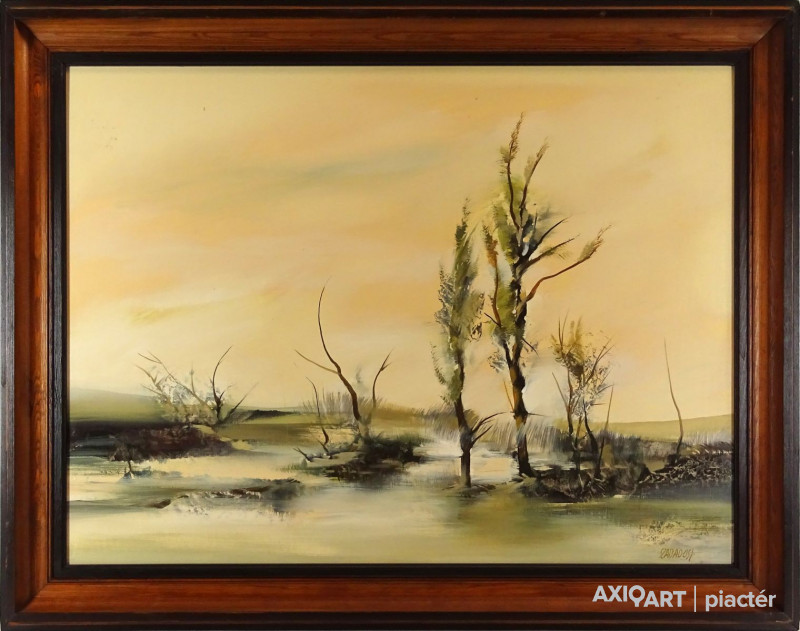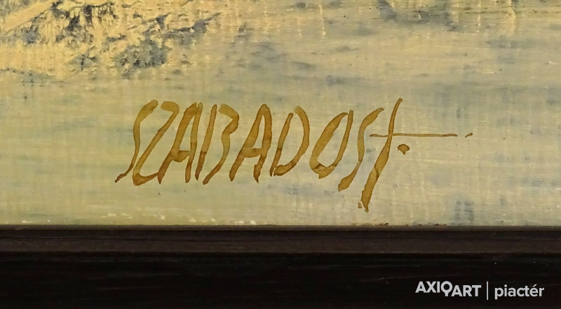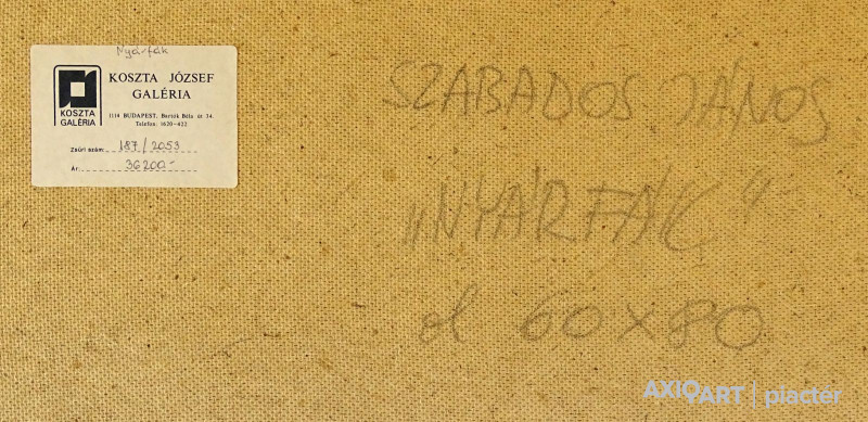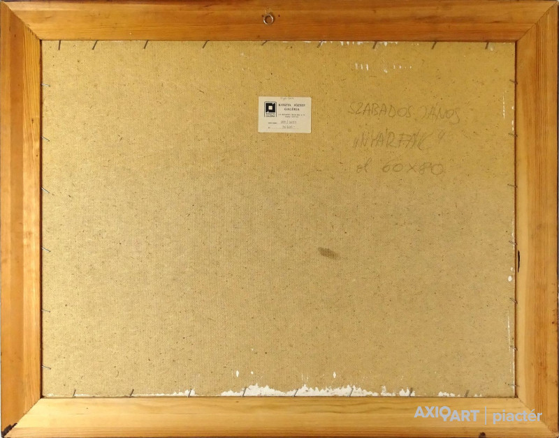 [1F143/039] Olaj farost festmény, szép állapotú barna keretben. Jelzés jobbra lent: SZABADOS Hátoldalán felirat: SZABADOS JÁNOS "NYÁRFÁK" OL. 60 x 80 Címkén felirat: KOSZTA JÓZSEF GALÉRIA ZSŰRISZÁM: 187/2053 Magasság: 74 cm Szélesség: 94 cm Súly: 3.83 kg Szabados János festő Kaposvár, 1937-02-28 Szerző: Tasnádi András 1962-ben végzett a Magyar Iparművészeti Főiskolán, mesterei: Miháltz Pál és Z. Gács György. 1966: Stúdió grafikai pályázat, III. díj; 1967-70: Derkovits-ösztöndíj; 1967: Medgyessy-plakett; 1970: Vaszary-díj; 1971: Rippl-Rónai-díj; 1980: Munkácsy-díj; 1977, 1997: Somogy megye művészeti díja. Tanulmányait követően több kelet- és nyugat-európai országban járt. Magyarország több művésztelepén, valamint jugoszláviai művésztelepeken alkotott. 1962 óta kiállító művész, festészetét a modern formatörekvések és a közérthetőség szintézise jellemzi. A 70-es években a népművészet szellemi-formai világának feldolgozása, a 80-as és a 90-es években az emberi viszonylatok megjelenítése határozza meg munkásságát. Muráliák tervezésével és kivitelezésével is foglalkozik. 1973-89 között a fonyódi Alkotóház vezetője volt. Irodalom FRANK J.: ~ és Szekeres Emil kiállítása, Élet és Irodalom, 1964/10. KOVÁCS GY.: Négy festő Somogyban, Művészet, 1975/10. kiállítása elé (kat. bev., Műcsarnok, Budapest, 1977) SZ. N.: Időrétegek, Új Művészet, 1994/7. Egyéni kiállítások Egyéni kiállítások 1964 • Mednyánszky Terem, Budapest 1974 • Szanatórium, Mosdós 1976 • DÉLVIÉP V., Kaposvár • Művelődési Központ, Nagyatád 1981 • Művelődési Központ Nagyatád • Grožnjan (YU) • Kék kápolna, Boglárlelle 1985 • Szőnyi Terem, Miskolc • Egyetemi Galéria, Debrecen 1988 • Kápolna, Sitke • Művelődési Központ, Nagyatád 1993 • Rippl-Rónai József Múzeum, Kaposvár 1995 • Műhelygaléria, Pécs Válogatott csoportos kiállítások Válogatott csoportos kiállítások 1960 • Őszi Tárlat, Rippl-Rónai József Múzeum, Kaposvár Somogyi képzőművészek kiállítása, Rippl-Rónai József Múzeum, Kaposvár 1966 • Fiatal Képzőművészek Stúdiója Grafikai pályázati kiállítás, Mednyánszky Terem, Budapest • Dél-dunántúli Területi Szervezet kiállítása, Osijek (YU) 1967 • Siklósi Művésztelep kiállítása, Vár, Siklós • Nyári Tárlat, Debrecen 1967, 1969, 1971 • Tavaszi Tárlat, Rippl-Rónai József Múzeum, Kaposvár 1968 • Pécsi és kaposvári grafika, Rippl-Rónai József Múzeum, Kaposvár 1974 • Somogyi képzőművészek kiállítása, Gdański Múzeum, Bjelovar • Vaszary Terem, Kaposvár 1975 • Budapest Festménypályázat, Csontváry Terem, Budapest • I. Képzőművészeti Triennálé, Szolnoki Galéria, Szolnok • A népművészet szellemében, Katona József Múzeum, Kecskemét • Kopernicus Centrum, Olstyn (PL) • Felszabadulási Tárlat, Somogyi Képtár, Kaposvár 1977 • Kaposvár 1945-1977, Vaszary Terem, Kaposvár 1979 • Magyar festészet, Prága 1981 • Bartók-pályázat, Pécsi Galéria, Pécs • Somogyi Képtár, Kaposvár • Szekszárd • Nagykanizsa • Zalaegerszeg 1982 • Országos Képzőművészeti kiállítás, Műcsarnok, Budapest • I. Országos Rajzbiennálé, Nógrádi Sándor Múzeum, Salgótarján • Vallomások Kaposvárról, vallomások Kodályról…, Somogyi Képtár, Kaposvár 1983 • Midiatúra, Csontváry Terem, Budapest • Mai magyar festők, Párizs 1984 • Dél-dunántúli képzőművészek kiállítása, Kunst im Agra Park Halle, Leipzig • Dél-balatoni képzőművészek szellemében, Tóparti Galéria, Boglárlelle 1985 • A népművészet szellemében, Katona József Múzeum, Kecskemét 1987 • Dunántúli Tárlatok, Somogyi Képtár, Kaposvár 1989 • Intergraf Nemzetközi Grafikai Biennálé 1991 • A kaposvári Iparművészeti Szakközépiskola tanárainak kiállítása, Rippl-Rónai József Múzeum, Kaposvár • Somogyi Műhelyek, Rippl-Rónai József Múzeum, Kaposvár 1994 • Tavaszi Tárlat, Rippl-Rónai József Múzeum, Kaposvár. Forrás: artportal.hu