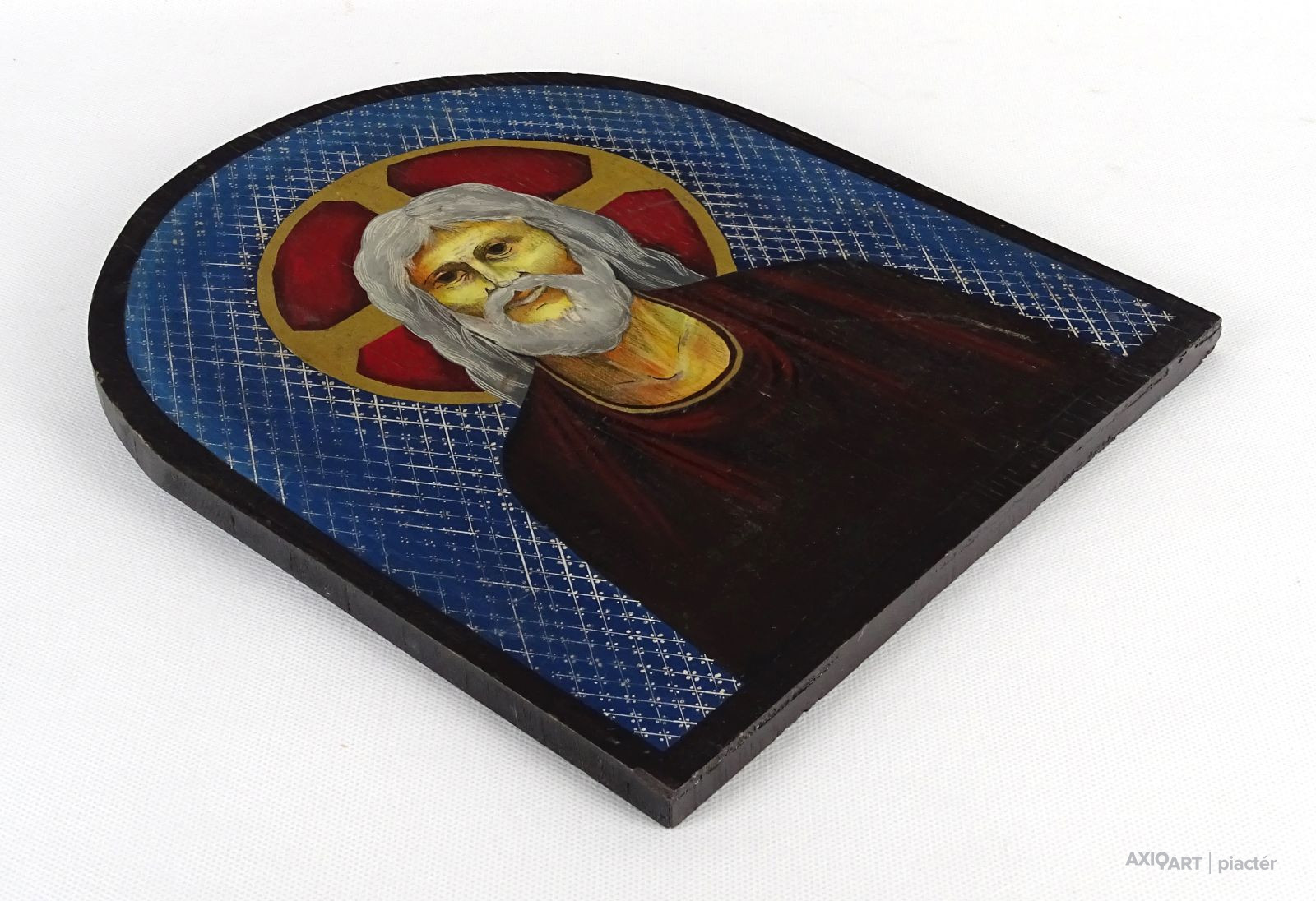 Boltíves fa táblára festett, akasztási lehetőséggel rendelkező ikon. Rajta Szent Szerafim ősz hajú portréja látható.