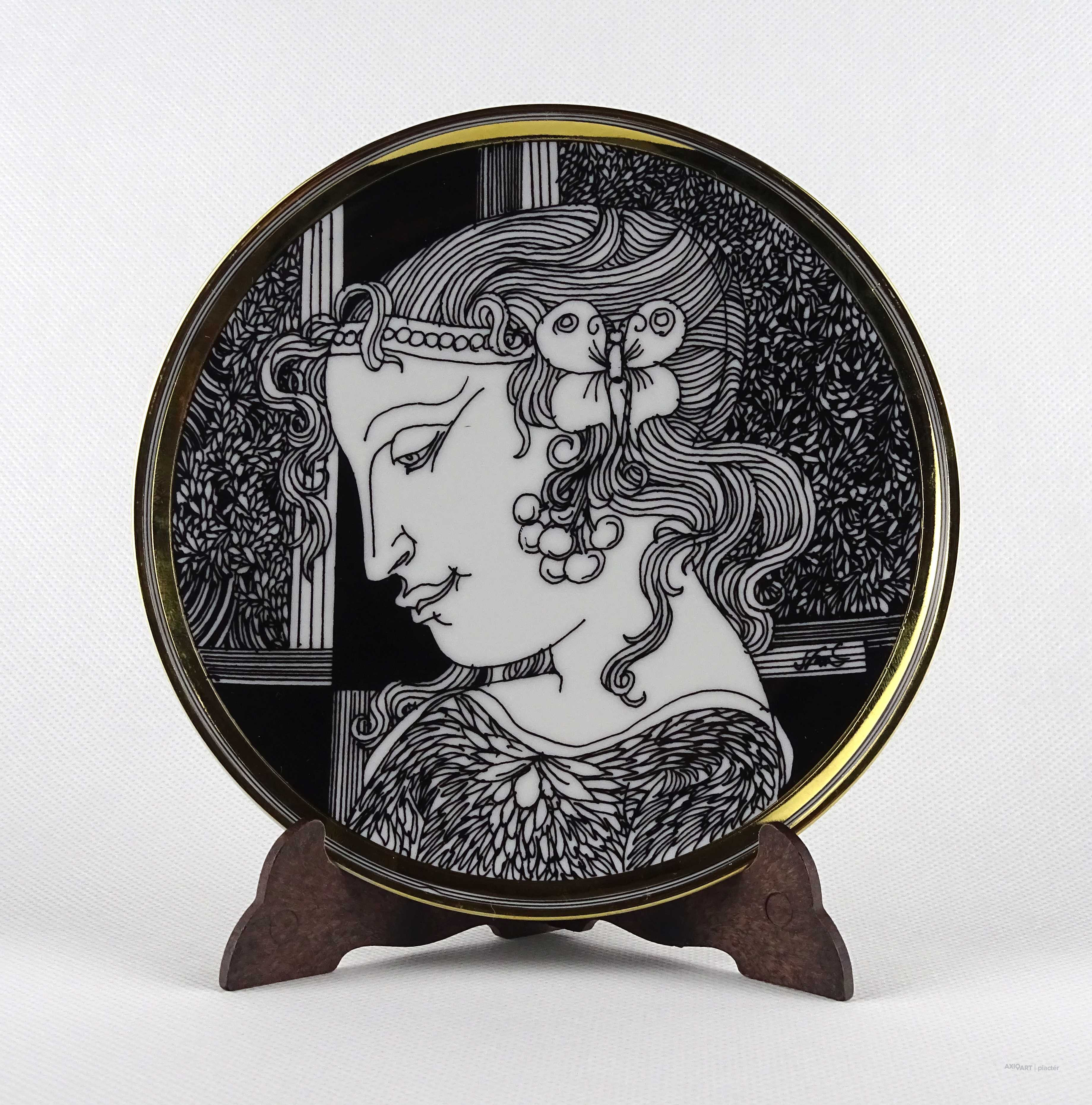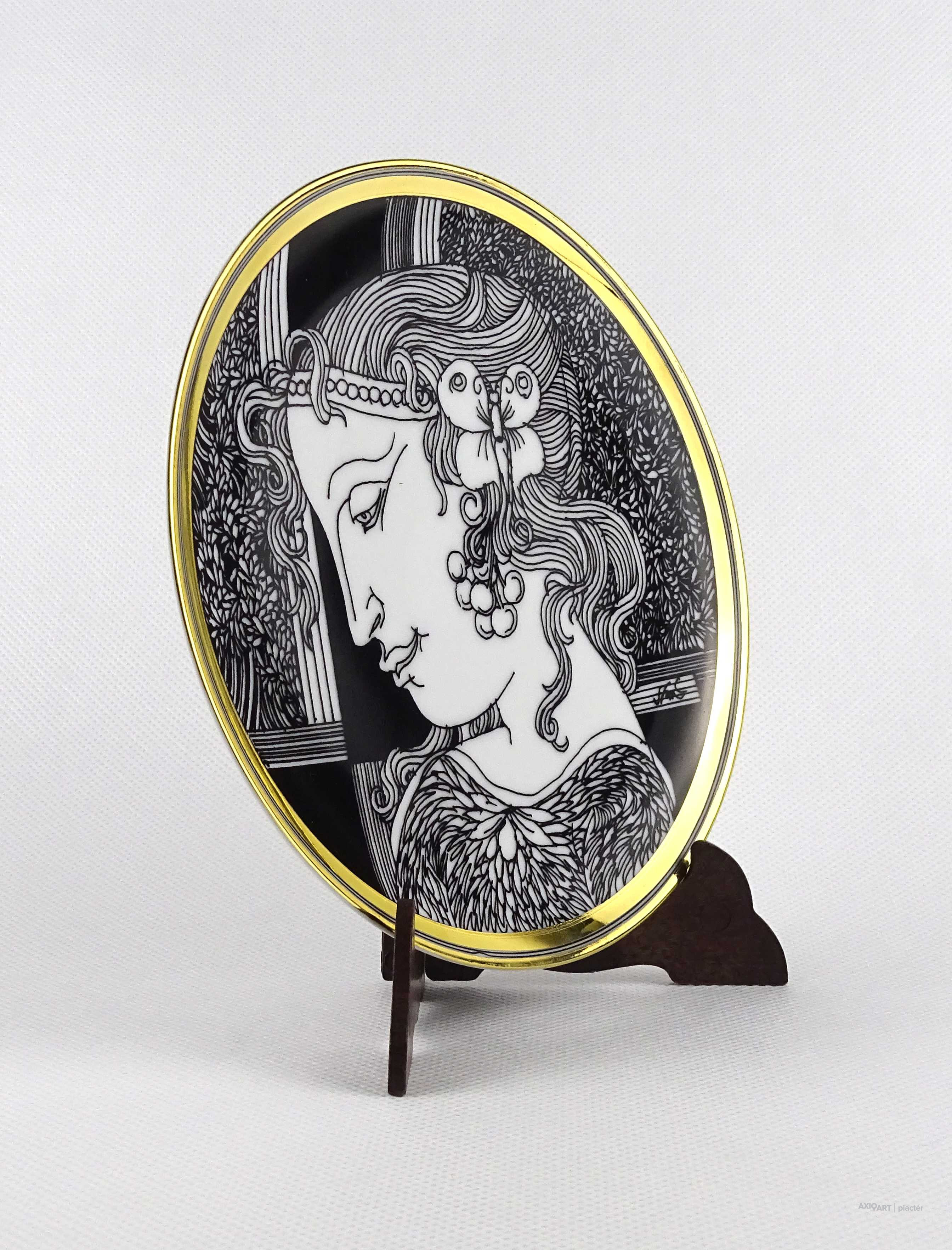 Hibátlan állapotú, jelzett, falra akasztási lehetőséggel rendelkező Hollóházi fali dísz tányér, dísz tál. Rajta pillangó díszes női portré.