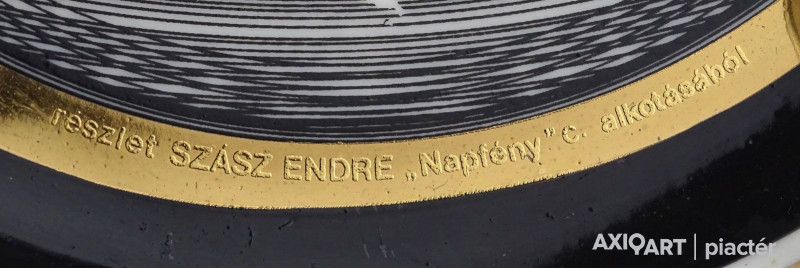 [1L596/UZ-N] Hibátlan állapotú, vastagon aranyozott, falra akasztási lehetőséggel rendelkező, Hollóházi fali dísz tányér, dísz tál. Hátoldalán jelzés: HOLLÓHÁZA HUNGARY 1831 A belső arany díszcsíkon felirat: RÉSZLET SZÁSZ ENDRE "NAPFÉNY" C. ALKOTÁSÁBÓL Szélesség: 20 cm Súly: 0.35 kg