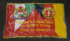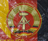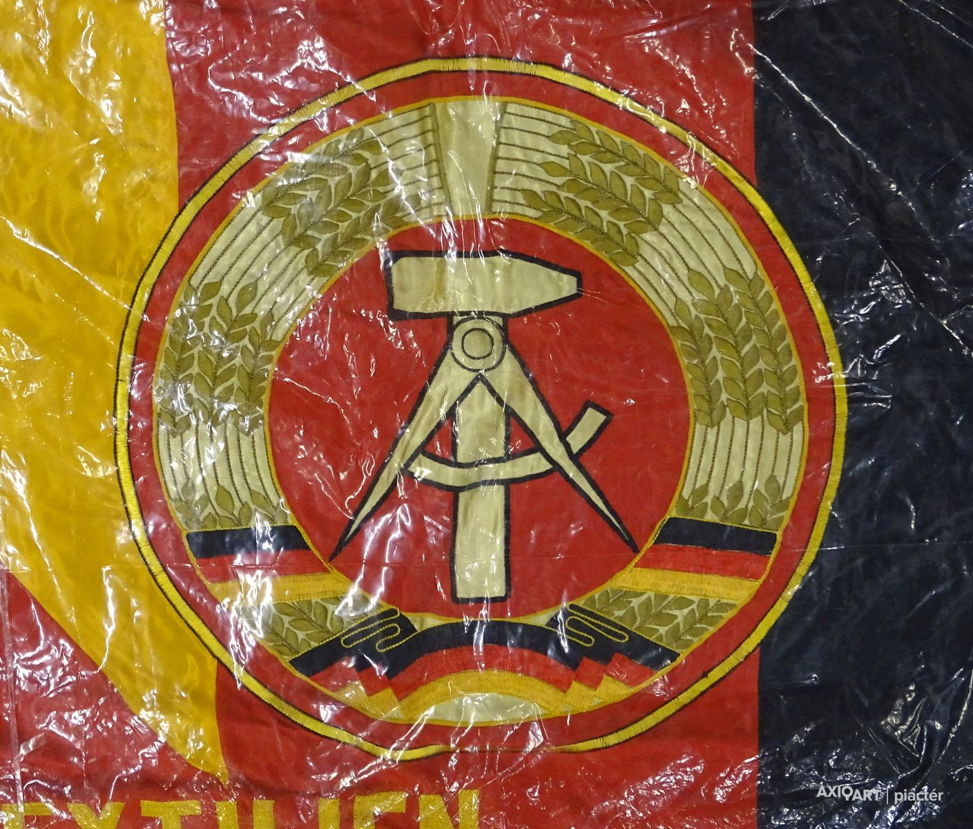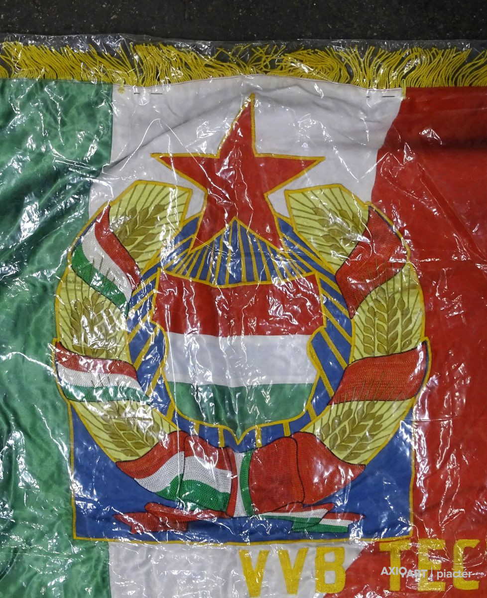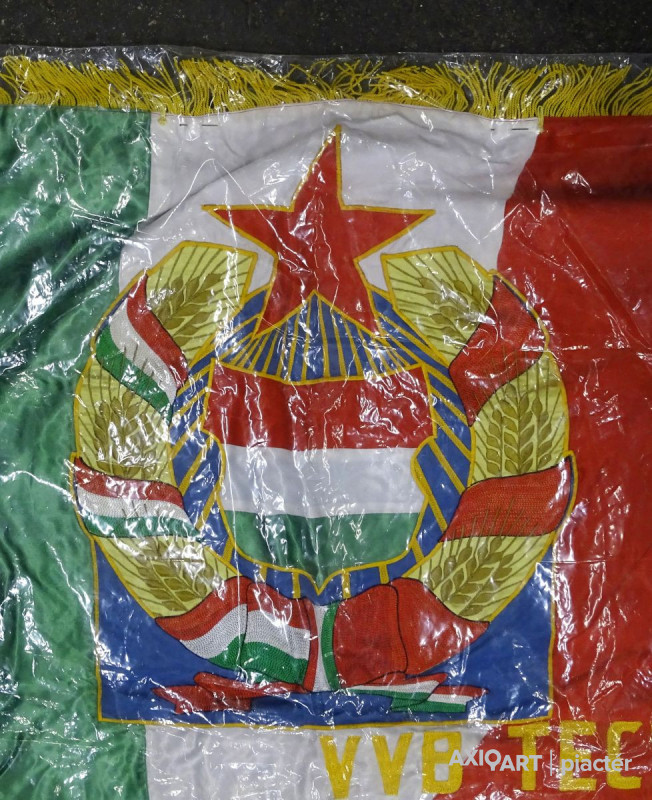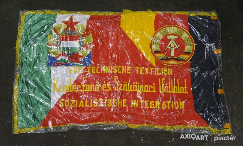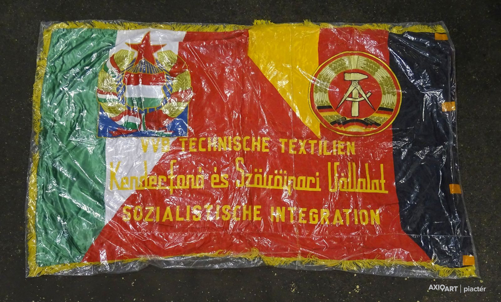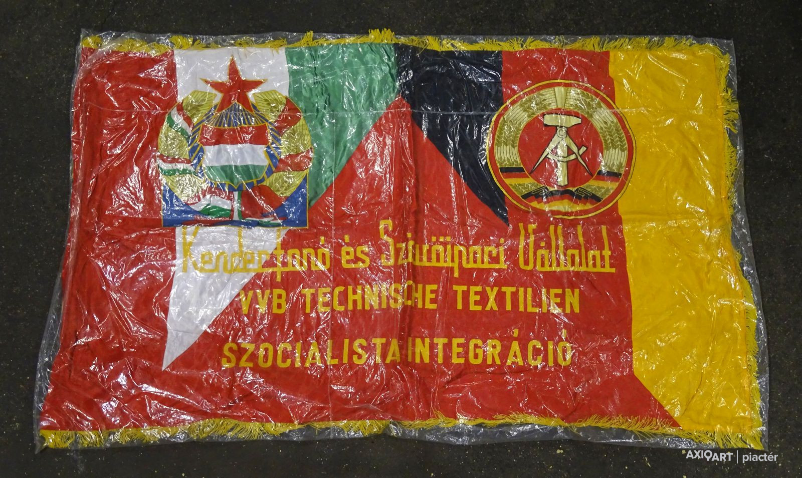 Eredeti csomagolásában található, hatalmas méretű, selyemre hímzett, sárga rojtokkal díszített kétoldalas zászló a szocialista korszakból. Rajta magyar és NDK címerek láthatók.