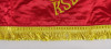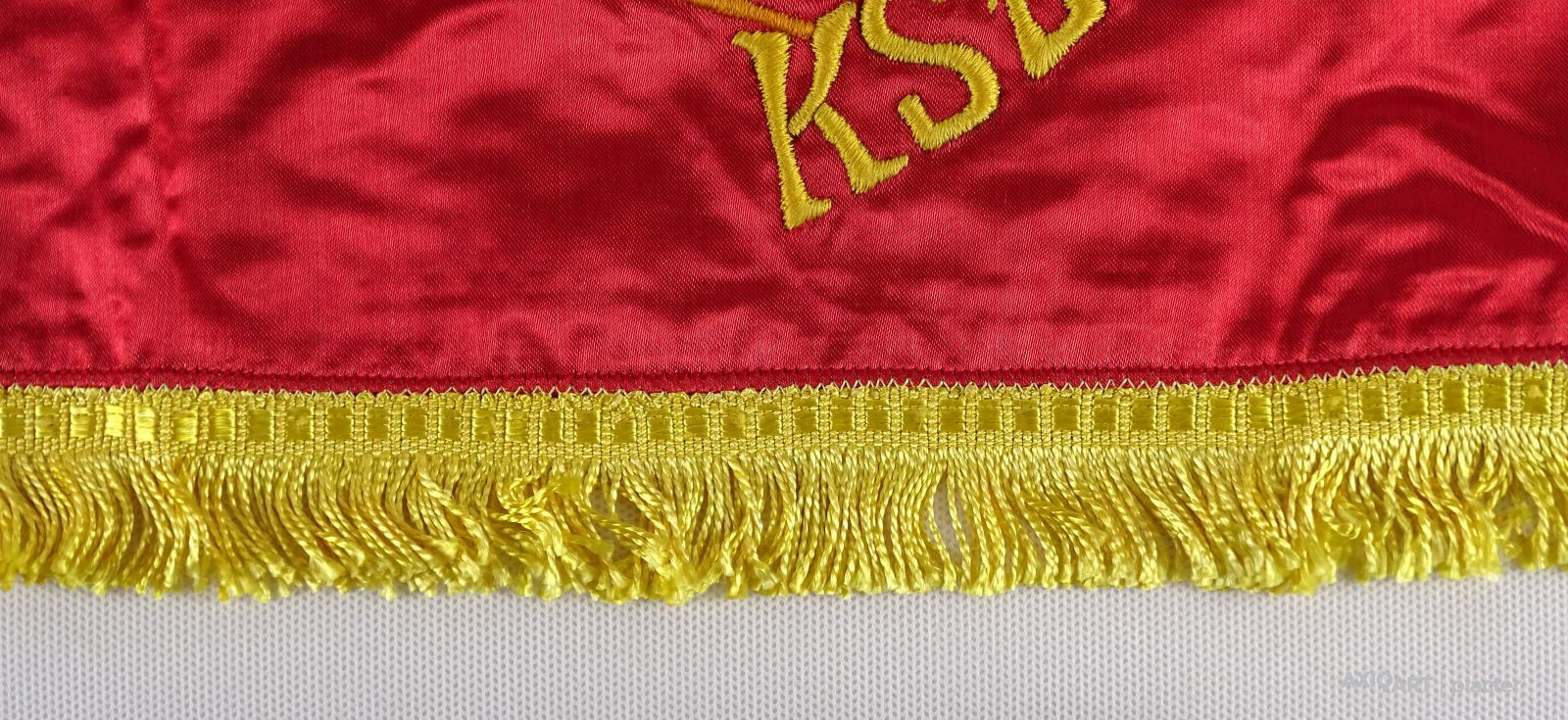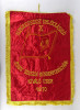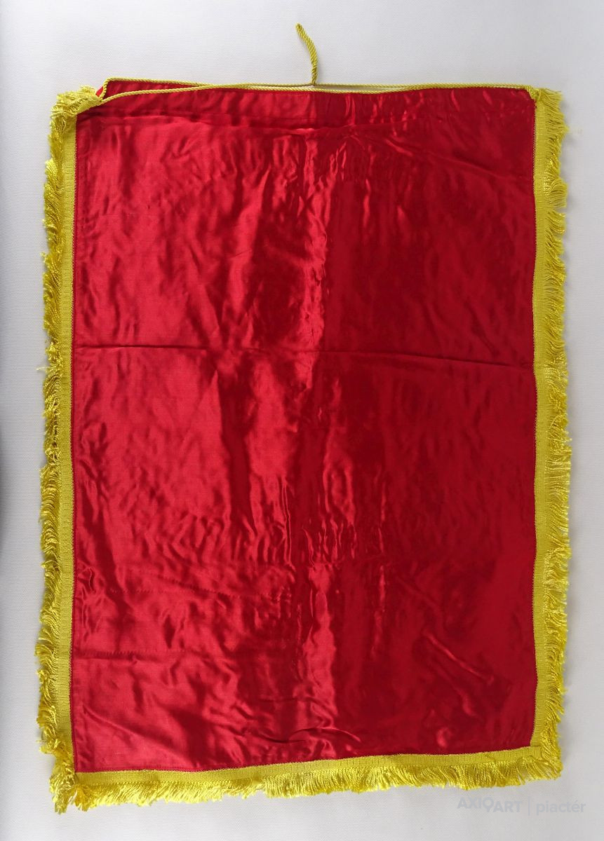Régi vörös selyemre hímzett, sárga rojtokkal díszített zászló a szocialista korszakból. Rajta Lenin hímzés is látható.