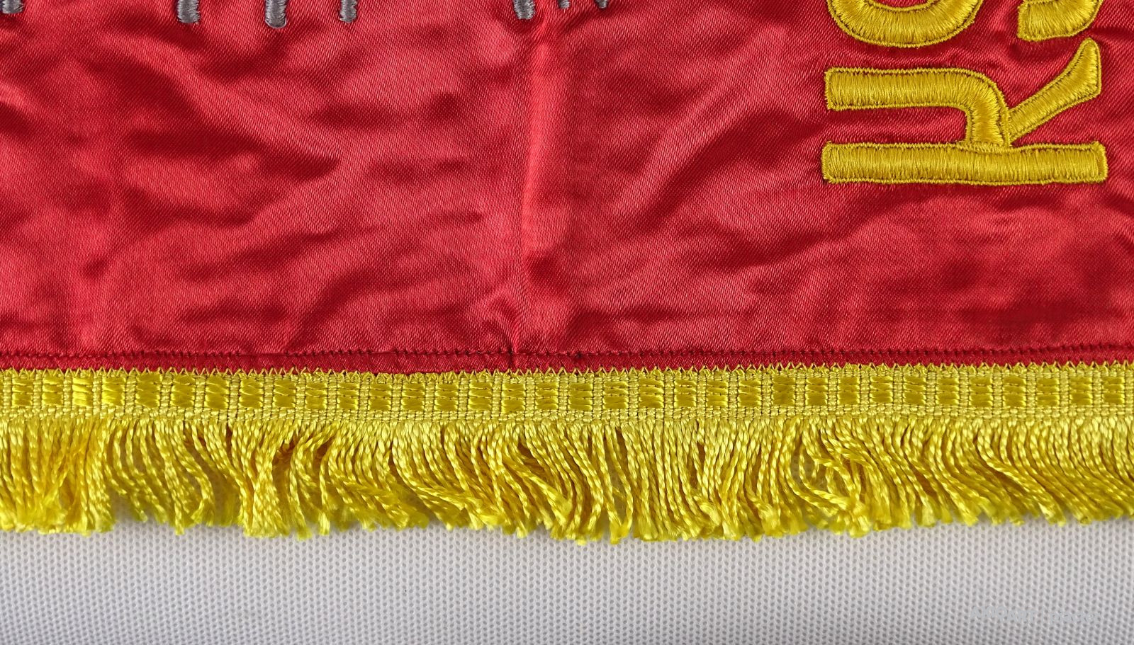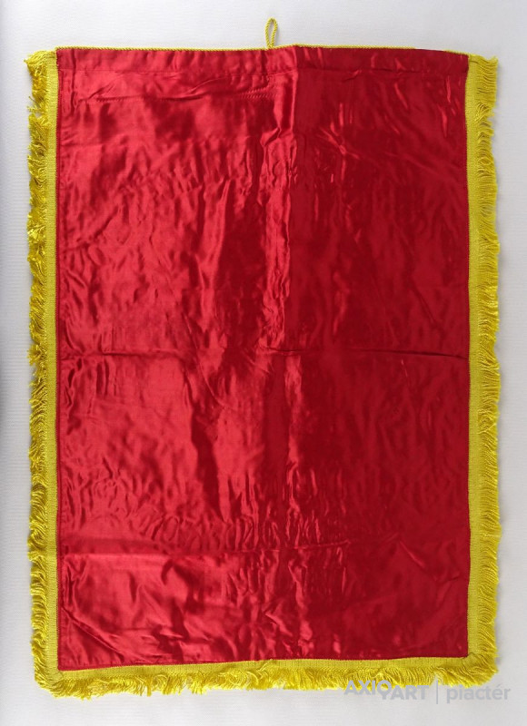 Régi vörös selyemre hímzett, sárga rojtokkal díszített zászló a szocialista korszakból.