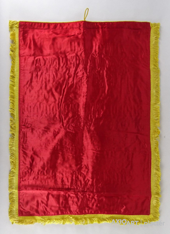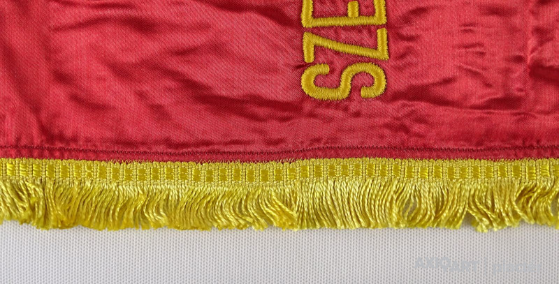 Régi vörös selyemre hímzett, sárga rojtokkal díszített zászló a szocialista korszakból.