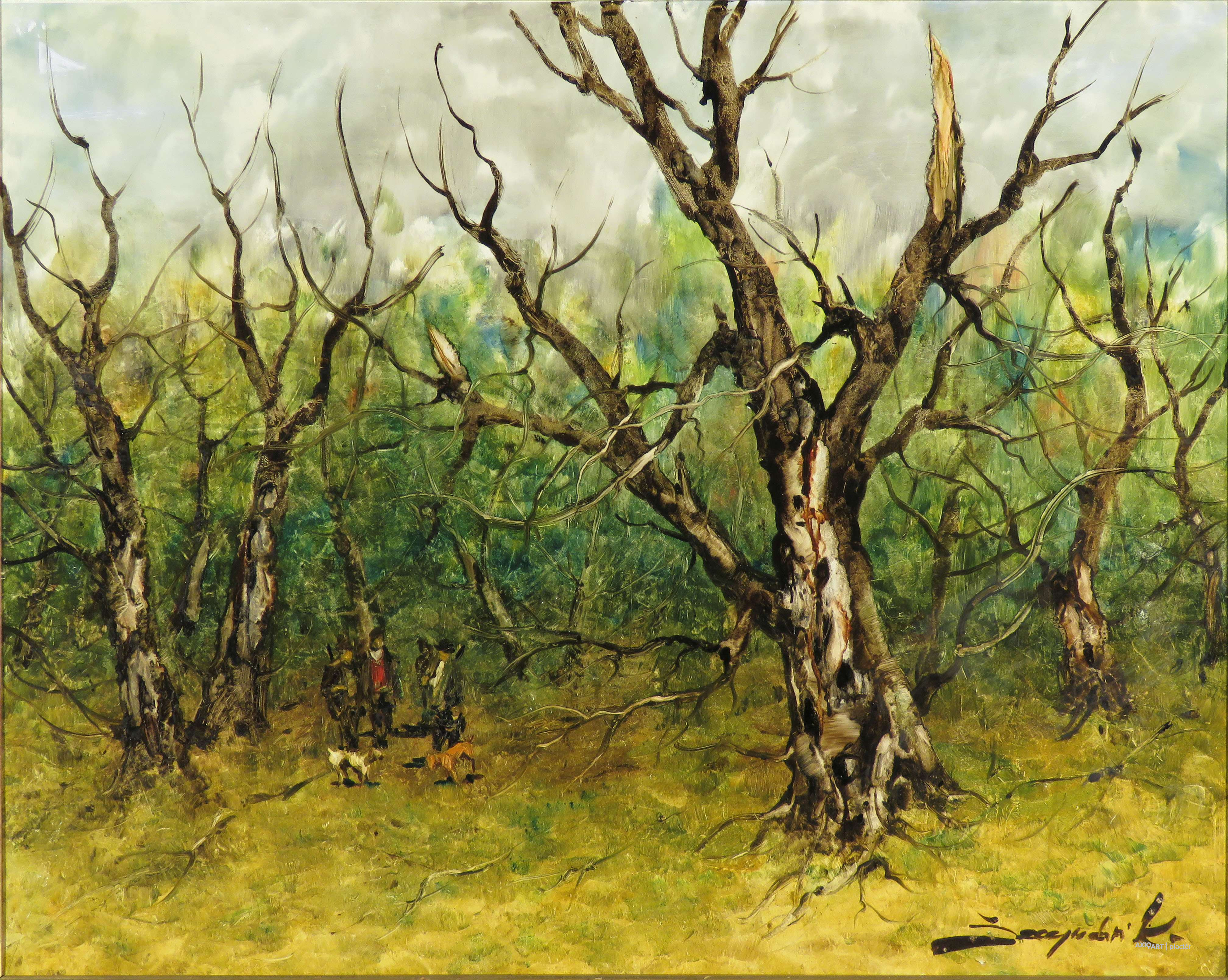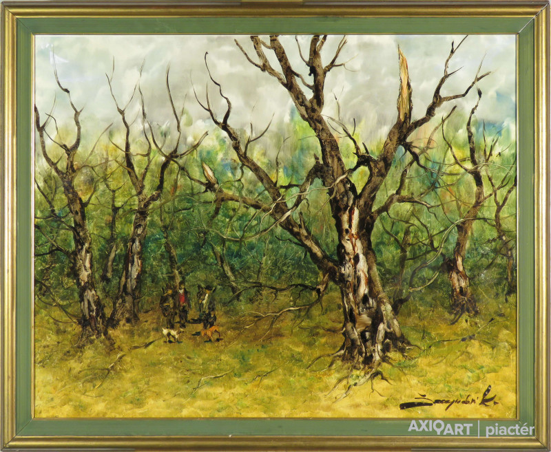 [FKD046/Bp201/40] A kép mérete: 80 x 106 cm keret nélkül. Készült: Olaj, Farostlemez A kép Szegvári Károly (Tószeg, 1920, Budapest, 2002) alkotása. Jelezve jobbra lent "Szegvári K." A festmény jó állapotban van. Keret: Ép Magyar festők és grafikusok életrajzi lexikona I-II. Festő. Tanulmányait Krivátsy Szücs György magániskolájában kezdte. A fővárosi Képzőművészeti Főiskolán Bencze László és Burghardt Rezső növendéke volt. 1942-ben ösztöndíjjal Olaszországba utazott, majd éveken át Párizsban és különböző olasz városokban élt. Külföldi sikerei a Rómában 1968-ban megrendezett egyéni tárlatával kezdődtek, amikor Róma város polgármestere aranyéremmel tüntette ki. 1976-ban a Cziffra György zongoraművész által megvásárolt franciaországi selisi gótikus kápolnájában, amely jelenleg Liszt-Bartók Zenei Művészképzőként működik, megfestette a Chapelle Royale táblaképeit. Számos hazai és külföldi tárlaton szerepelt alkotásaival. Egyéni bemutatók: Csók Galéria, Nyíregyháza, Martfű, Nyírbátor, Pécs, Veszprém, Debrecen, Kisújszállás, stb. Tájképei megörökítik az elhagyott erdőt, a zsombékos mezők, a múltba merülő, pusztuló tanyák világát. Szívesen festett virágcsendéleteket, portrékat, aktokat és falusi népéletképeket is. Megfestette Puskás Öcsi, Simándy József, stb. arcképét. "Terra di Madre" című alkotásával I. díjat nyert Fermoban, 2000-ben köztársasági aranyérmet kapott. Munkái helyet kaptak a Petőfi Irodalmi Múzeumban, a debreceni Déri Múzeumban, Rómában a M. Vaticanoban, a londoni National Galeryben és a brüsszeli Royaux Múzeumban. (LÁ, MFGA) Magyar festők és grafikusok adattára Művészeti tanulmányait Krivátsy Szűcs György magániskolájában kezdte, majd a Képzőművészeti Főiskolán fejezte be, ahol Bencze László és Burghardt Rezső növendéke volt. Hosszú időn keresztül élt Párizsban és különböző olasz városokban. Külföldi sikerei a Rómában 1968-ban megrendezet önálló kiállításával kezdődtek, amikor művészetéért Róma polgármestere aranyéremmel tüntette ki. Cziffra György, a világhírű zongoraművész megvásárolta a francia királyok Senlis-i gótikus kápolnáját, amelyet átalakíttatott Liszt-Bartók zenei művészképzővé. E művészképző részére 1977-ben Szegvárit bízta meg egy hatalmas táblakép, triptichon megfestésével. Számos hazai és külföldi kiállításon szerepelt. Önálló tárlata volt Bécsben, Prágában, Bukarestben, Sokolovban, Fellbachban (NSZK 1986). Tájképei megörökítik az elhagyott erdők, a zsombékos mezők, a múltba merülő, pusztuló tanyák világát. Szívesen fest virágcsöndéleteket, portrékat, aktokat is. Hatalmas gyűjteménnyel rendelkezik, amelynek féltett darabja egy Lotz Károly emlékalbum 143 művész aláírásával. Hortobágyon magánmúzeumot rendezett be. - Irod.: Szombathy Viktor: Festőművész, erdők szerelmese. Turista, 1976. feb. 10.; Tóth Ervin: A kiérlelt látomás. Szegvári Károly kiállításáról. Kelet-Magyarország. 1979. okt. 11.; Bakó Endre: Tószegtől Párizsig. Hajdú-Bihari Napló. 1980. márc. 11. Magyar festők és grafikusok életrajzi lexikona I-II. Műgyűjtők és kereskedők kézikönyve Festő. Tanulmányait Krivátsy Szücs György magániskolájában kezdte. A fővárosi Képzőművészeti Főiskolán Bencze László és Burghardt Rezső tanítványa volt. Éveken keresztül Párizsban és különböző olasz városokban élt. Külföldi sikerei a Rómában 1968-ban megrendezett egyéni tárlatával kezdődtek, amikor Róma polgármestere aranyéremmel tüntette ki. A Cziffra György által megvásárolt Senlis-i gótikus kápolnában, amely Liszt-Bartók Zenei Művészképzőként működik, egy triptichont festett. Számos hazai és külföldi tárlaton szerepelt alkotásaival. Tájképei megörökítik az elhagyott erdőt, a zsombékos mezők, a múltba merülő, pusztuló tanyák világát. Szívesen festett virágcsendéleteket, portrékat, aktokat is. (MFGA) Művészeti lexikon I-IV. A Képzőművészeti Főiskolán Burghardt Rezső volt a mestere. Széles ecsetkezelésű, hangulatos tájképeivel rendszeresen szerepel kiállításokon. 1955-ben a Csók Galériában gyűjt. kiállításon mutatta be festményeit. Művész életrajzok kortárs magyar képzőművészek Krivátsy Szűcs György magániskolájában kezdte, majd a Képzőművészeti Főiskolán folytatta tanulmányait Burghardt Rezső mellett. 1943-ban többedmagával ösztöndíjat kapott Firenzében, de a háborús viszonyok miatt már nem vehette igénybe. Számos hazai és külföldi kiállításon szerepelt. Önálló tárlata volt Bécsben, Prágában, Bukarestben, Sokolovban, Budapesten a Csók Galériában, és Veszprémben. Rómában 1968-ban rendezett önálló kiállítást, ahol Róma polgármestere aranyéremmel tüntette ki. - 1977-ben Cziffra György őt bízta meg a Liszt-Bartók zenei művészképzővé alakított Senlis-i kápolna, a francia királyok kápolnájának kifestésével. Ugyanott önálló kiállítást is rendezett. Világa a természeté: az erdők öreg fái, az omladozó tanyák világa képein mélységes emberi fájdalmak hordozói. Egy letűnő világot forrósít át a lélek melegével és egyéni stílussal.