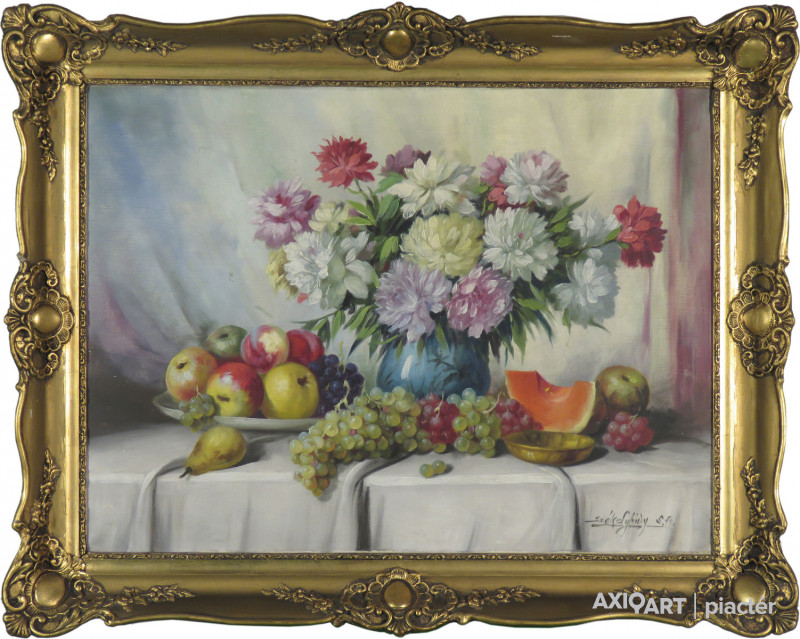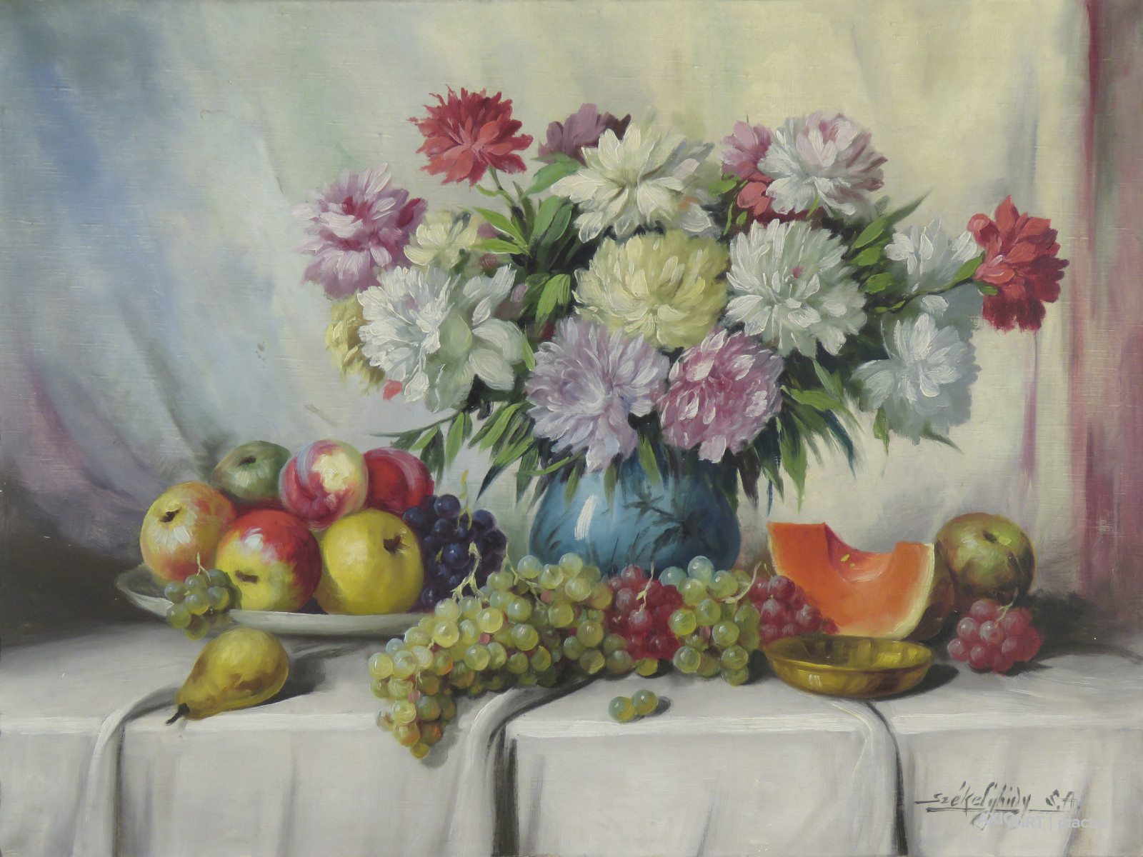 [FKC694/Bp9/39] A kép mérete: 60 x 80 cm keret nélkül. Készült: Olaj, Vászon A kép Székelyhidy Stark András (1900, 1940) alkotása. Jelezve jobbra lent "Székelyhidy S. A." A festmény jó állapotban van. Keret: Ép Egyéb Magyar Festőművész. Elsősorban naturalista virág és gyümülcs csendéleteket festett.