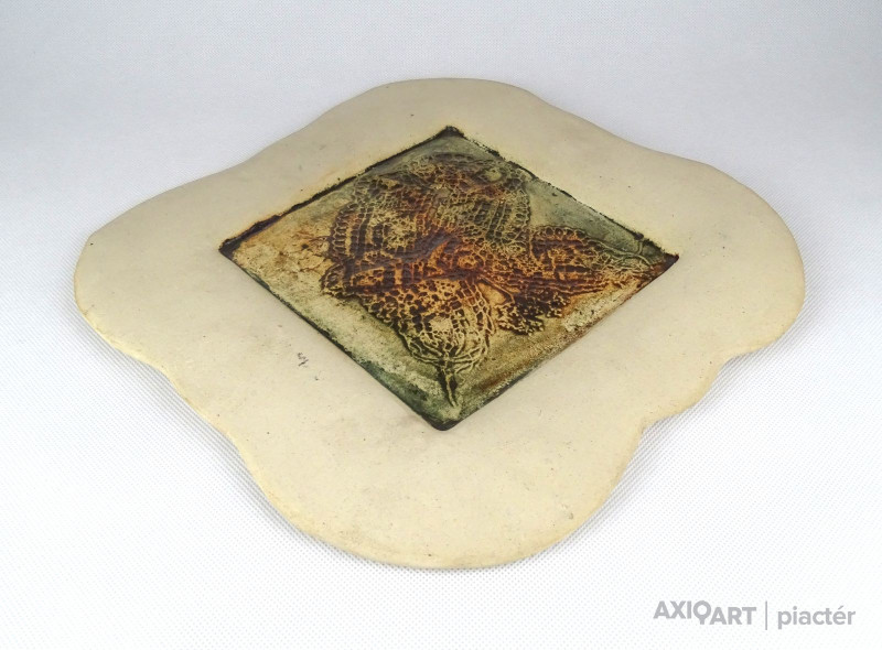 [1D345/Z064] Hibátlan állapotú, falra akasztási lehetőséggel rendelkező művészi kerámia fali dísz. Hátoldalán mázba nyomott pecsét: SZT (Szemereki Teréz keramikus) Magasság: 28 cm Szélesség: 27 cm Súly: 0.96 kg   Szemereki Teréz keramikus Tata, 1947-09-11   Szerző: Laczkó Ibolya 1966: Képző- és Iparművészeti Gimnázium, Budapest; 1967-től Dési Huber Képzőművész Kör, mestere: Laborcz Ferenc, 1972: Magyar Iparművészeti Főiskola, kerámia szak, mesterei: Csekovszky Árpád, Schrammel Imre, Jánossy György, Kovács Ferenc, Litkei József. 1973: Club Design-pályázat, Szolnok, II. díj; 1975: IDEA-pályázat, I. és II. díj; Ösztöndíjasként Kerámia Szimpozion, Siklós (1978, 1994, 1997); Nemzetközi Kerámia Stúdió, Kecskemét (1980, 1994, 1997); ARÁBIA, Finnország (1989, 1994); A szín szerepe a kerámiában, Siklós (1991); Béke és harmónia, Goa-Bicholim (IN) (1994); Tokoname (JP) (1995) alkotótelepein dolgozott. 1978-tól az MKT tagja. Funkcionális tárgyak mellett egyedi plasztikát is készít. Munkáinak fő forrása a természet, anyaga a samott, a kőedény és a kőcserép, ritkábban a porcelán. A növénylenyomatos, hajlított-gyűrt kerámiaplasztikákat követően, a 90-es évek elején művészetének fő motívuma a madár lett, majd ősi kultúrák formáit és motívumait megidéző, titokzatos tárgyakat (frigyláda, áldozati tál, szelence, rács) készít. Irodalom MINYA M.-~: I. Nemzetközi Kerámia Szimpozium Indiában, Symposion Újság, 1994/1. KOCZOGH Á.: Szép tárgyak dicsérete, Budapest, 1978 WEHNER T.: Tata Veduta, Tata, 1994 : A lélek madarai: ~ kerámia szobrai, Magyar Iparművészet, 1997/3. ERDŐSI K.: ~ kerámiái az ezredfordulón, Hidegkúti Hírek, 1999/12. BARDOS, C.: Earthen Wonders [USA] Lake House Books, 2000. Egyéni kiállítások Egyéni kiállítások 1979 • La Maison des Pays du Vancluse, Avignon 1984 • Szőnyi Terem [Polgár Csabával], Miskolc 1987 • [Gilyén Máriával] Képcsarnok, Sopron • Mednyánszky Terem, Budapest [Benes Ferenccel] 1989 • Rudnay Terem, Eger • Salgótarján 1993 • Mednyánszky Terem, Budapest • Végállomás Galéria 1995 • Hotel Ezüstpart, Siófok 1999 • Pogány portyák – kemény keresztek, Vigadó Galéria, Budapest • Titkok pecsétje, Rudnay Galéria 2000 • Múlt – jelen – Titkok pecsétje, Komárom • Városi Művészeti Múzeum, Győr • Magyar Intézet, Párizs Válogatott csoportos kiállítások Válogatott csoportos kiállítások 1973 • Club Design pályázat és kiállítás, Salgótarján 1975 • VIT-kiállítás, Budapest 1978, 1980 • Nemzetközi Kerámia Kiállítás, Faenza 1978-80, 1986-96 • V., VI., IX., XII-XIV. Országos Kerámia Biennálé, Pécs 1980 • A kéz intelligenciája, Műcsarnok, Budapest 1980 • Nemzetközi Kerámia Biennálé, Vallauris 1980 • Tárgyak-Alkotások, Vigadó Galéria, Budapest 1982 • Magyar Kézműves Kerámia, Várgaléria, Siklós 1983 • A tervezés értékteremtés. Országos Iparművészeti kiállítás, Műcsarnok, Budapest 1988 • Tavaszi Tárlat, Műcsarnok, Budapest 1989 • Téli Tárlat, Magyar Képzőművészek és Iparművészek Szövetsége, Műcsarnok, Budapest 1990 • Víz és élet, Agrártudományi Egyetem, Gödöllő 1992 • Nemzetközi Kerámia Verseny, Mino (JP) Magastűzön, A MKT kiállítása, Gödöllői Galéria, Gödöllő • Vármúzeum, Tata 1995 • Az agyag mesterei, Vigadó Galéria, Budapest • Fletcher Challenge, Auckland (UZ) • Kerámia workshop, Tokoname City (JP) 1996 • Kerámia Biennálé, Kairó 1996 • Őszi Kerámia Kiállítás. MKT kiállítása, Csók Galéria, Budapest 1998 • Őszi Kerámia Kiállítás. MKT kiállítása, Palme Ház, Budapest 2001 • Ipar-Művészet. Millenniumi iparművészeti kiállítás, Műcsarnok, Budapest 2000 • Híd 2000, Kecskeméti Képtár, Kecskemét. Művek közgyűjteményekben Művek közgyűjteményekben Forrás: artportal.hu  Méret: 30,5 x 41,5 cm Súlya: 1800