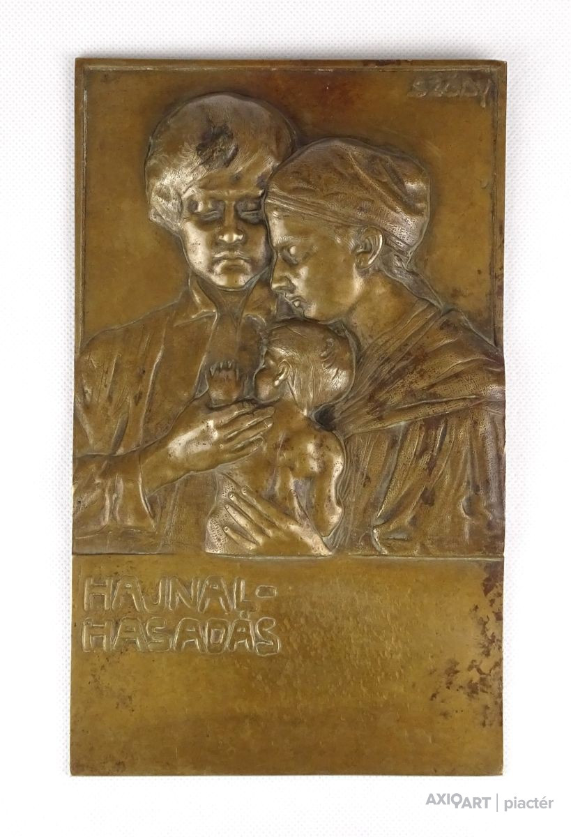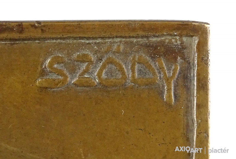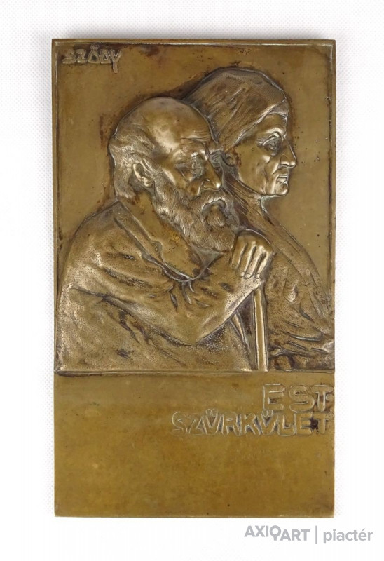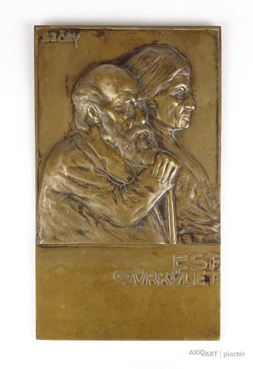 [1A634/Z059] Régi, kettő darab azonos méretű, jelzett, feliratos bronz relief. Falra akasztási lehetőségekkel rendelkeznek. - Nagyszülői házaspár látható. Felirat: EST-SZÜRKÜLET Jelezve balra fent: SZŐDY - Fiatal házaspár, gyermekkel. Felirat: HAJNAL-HASADÁS Jelezve jobbra fent: SZŐDY Magasság: 24 cm Szélesség: 14.5 cm Súly: 1.54 kg Sződy Szilárd (szobrász)     Sződy Szilárd Przemyśl-emlékmű Budán, a Margit hídnál Született 1878. április 27.[1] Nagykáta Elhunyt 1939. február 24. (60 évesen) Budapest Foglalkozása szobrász- és éremművész   Sződy Szilárd (Nagykáta, 1878. április 27. – Budapest, 1939. február 24.) magyar szobrász és éremművész.  Életpályája Az Iparművészeti Iskolában, majd Olaszországban tanult. 1918-ban és 1919-ben a Nemzeti Szalonban voltak kiállításai. Számos hősi emléket, síremléket, valamint érmet, plakettet készített. 1921-től tanár volt Budapesten, az Állami Polgári Iskola Tanárképző Főiskoláján. A Magyar Nemzeti Galéria több szobrát is őrzi.[2]  Művei A Népszálló lépcsősora melletti két munkást ábrázoló dombormű, 1911 Legismertebb munkája a Przemyśli 2-es tüzérezred hősi emlékműve (Budapest II. kerülete, a Margit híd budai hídfőjénél) Józef Piłsudski-emléktábla Charles Darwin, Puskás Tivadar (mérnök) és Puskás Ferenc (labdarúgóedző) emléktáblája Józsefvárosban A első világháború Zuglói kocsiszín halottainak két emléktáblája A Kerepesi temető több jelentős síremléke. Érmei közül ismertek a Dante-, Madách- és Martinovics-érmek. Emlékezete Az Új köztemetőben nyugszik (48/12-1-31/32).   Forrás: wikipedia