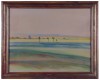 [1Y029/Z018] Olaj farost festmény, üveglap mögött, hibátlan képcsarnokos keretben. Hátoldalán Képcsarnok Vállalat papír címkéje: A művész neve: SCHÉNER MIHÁLY A kép címe: TÁJ Magasság: 66.5 cm Szélesség: 86 cm Súly: 6.54 kg Schéner Mihály festő, grafikus, szobrász, keramikus, bábtervező Medgyesegyháza, 1923-01-9 Elhalálozott: Budapest, 2009. május 11. Honlap: http://www.kormendigaleria.hu/kiadvany.html 1942-1947: Magyar Képzőművészeti Főiskola, tanára: Rudnay Gyula. 1978: Munkácsy-díj; 1984: érdemes művész; 1989: kiváló művész; 1995: Kossuth-díj. 1992-től a Magyar Művészeti Akadémia, 1993-tól a Széchenyi Irodalmi és Művészeti Akadémia tagja. 1956-ig tanított. 1982: Nagyatádi Faszobrász Alkotótelep, 1985: Nemzetközi Acélszobrász Alkotótelep, Dunaújváros. A stílusában felismerhető, mégis sokféle műtárgyat létrehozó ~ gazdag, állandóan alakuló életműve a folyton változó világban helyét kereső, az alkotói szabadságot megvalósító XX. századi képzőművész példázata lehetne. Magát expresszív-szürrealista alkotónak nevezi. Egyaránt dolgozik festékkel, textillel, fával, fémmel. Rajzol, szerkeszt, farag, épít, gyúr, varr és ragaszt, felhasználja a mézesbábok öntőformáit. Festő, rajzoló, textilszobor- és bábkészítő, fazekas, asztalos, esztergályos. Háromlépcsős folyamatban gondolkozik: rajzban tervez, majd fest, szobrot készít, “formába önt”, mindig a végső plasztikai megoldást keresi. Ami állandó és mégis játékosan változékony megjelenésű Schéner művészetében, az a gyermekkori emlékek által meghatározott népi mesterségek iránti tiszteletet kifejező motívumkincs, a tárgyi folklór formakészlete, amely már-már kézjegyként ismétlődik munkáin. Mitologikussá nőtt képzelete új lényeket teremt, pl: a Pigulát, amely disznótestű, emberfejű teremtmény. Schéner festményein a szürrealista motívumokat konstruktív szerkezetbe rendezi, a geometriát és az organikus természeti motívumokat egyaránt beépíti műveibe. A népi, népművészeti formakincsből merített lovas huszárok, betyárok, szegénylegények cifra szűr mentéje, piros csákója, fekete csizmája, az önálló életet élő zsinórdíszek és mézeskalács bábok, a kiskocsik a gyermekkori vásárok, búcsúk színes forgatagába vezet. A primér motívumokat aztán felváltják a vastagon felhordott felületbe karcolt jelek, vonalhálózatok, amelyek a játszó gyermek homokba rajzolt ábráit, a pásztorember fába vésett üzeneteit, az ősember barlang falába rótt mágikus jeleneteit idézik meg. A művész pillanatnyi érdeklődésének megfelelően a színek búvópatakként tűnnek el és jelennek meg ismét. A 60-as években leginkább a formákkal való játék érdekelte, a festmények felülete egyre gazdagodott: a táblaképek felületén applikációk jelentek meg, vagy lemállasztott rétegek hagyták maguk után hiányukat, motívumok nélküli ősformák, archetipikus képzetek bukkantak fel művészetében. A véletlenszerűnek látszó rétegekkel való játék azonban tudatos komponálás eredménye, amely később nyilvánvaló ritmusnak és formai szerkesztettségnek adja át a helyét, mint a Törvénytáblák c. sorozaton. A különböző művészi kifejezési formák egymásra termékenyítő hatással vannak, át- meg áthatják egymást. Textilszobrai, amelyekkel új műfajt teremtett, ugyanazzal az automatikus, expresszív-szürrealista módszerrel készülnek, mint festményei. A hagyományosan a népművészetben alkalmazott anyag, a filc lehetőséget ad a népi formakincs felelevenítésére, amely azonban a művész különös szürrealista átiratában jelenik meg. A szívekkel kivarrt, zsinórdíszes Posztókotlós c. művén mézesbábok lógnak, hátán huszárok lovagolnak. Egész sor textilből készült kéz-plasztikát alkot, amelyeket az ujjakra rávarrt díszekkel öltöztet, személyesít meg. A színes-különös világból aztán ~ újra puritán képi és formai rendbe juttatja el a nézőt, majd nemsokára tépett, gyűrt, vágott, csorgatott, repedezni hagyott szenvedélyesen vonagló képi felületeket hagy hátra. Schéner készített apró gyermekjátékokat, térstruktúra-tereket, mászókákat is. A magyar népi formák mellett szürreális játékaiban gyakran alkalmaz görög mitológiai alakokat, “elkentaurosodott” lovakat, Gorgó-fejeket, sellőket, hárpiákat, Pán-ábrázolásokat. Schéner nemcsak saját művészetéről publikál, hanem művésztársairól is számos írása jelenik meg, elsősorban az Új Auróra c. folyóiratban, amelynek egy ideig főmunkatársa volt. Irodalom kiállítása, Magyar Építőművészet, 1962/4. Húsz év után, Művészet, 1965/4. BOZÓKY M.: ~, Tiszatáj, 1968/5. PERNECZKY G.: Nincs uborkaszezon, Élet és Irodalom, 1969. augusztus 8. BARÁNSZKY-JÓB L.: ~, Művészet, 1969/9. LÁSZLÓ GY.: ~ kaposvári kiállítása, Jelenkor, 1969/4. MAJOR M.: Pásztorok, betyárok, huszárok - kezek, Tükör, 1970. szeptember 15. FRANK J.: Bemutatjuk ~t, Élet és Irodalom, 1972. május 6. ról kiállítása ürügyén, Képzőművészeti Almanach, Budapest, 1972 Sötétkék kokasok, Élet és Irodalom, 1973. szeptember 9. MAJOR M.: ~ játékai, Élet és Irodalom, 1974. július 27. BARTA J.: Egy különös művész, Alföld, 1974/6. VADAS J.: Szárnykészítők, Élet és Irodalom, 1975. október 4. JUHÁSZ F.: A halál ellen játszani, Élet és Irodalom, 1975. május 17. PAP G.: Kincsek és műkincsek, Művészet, 1975/6. P. SZŰCS J.: Az utak kettéválnak, Művészet, 1978/3. Békési művészet, Művészet, 1978/7. SZAMOSI F.: ~ [kismonográfia], Budapest, 1978 VADAS J.: Játék a játékkal, Élet és Irodalom, 1979. augusztus 18. NÉMETH L.: ~ műveiről, Művészet, 1979/4. MIKLÓS P.: Mit akar ez a múzeum?, Művésze