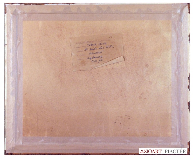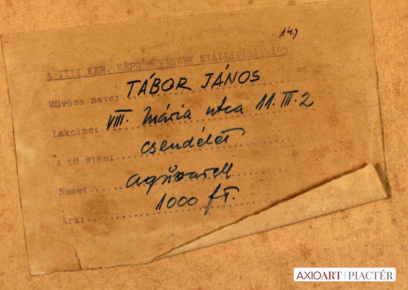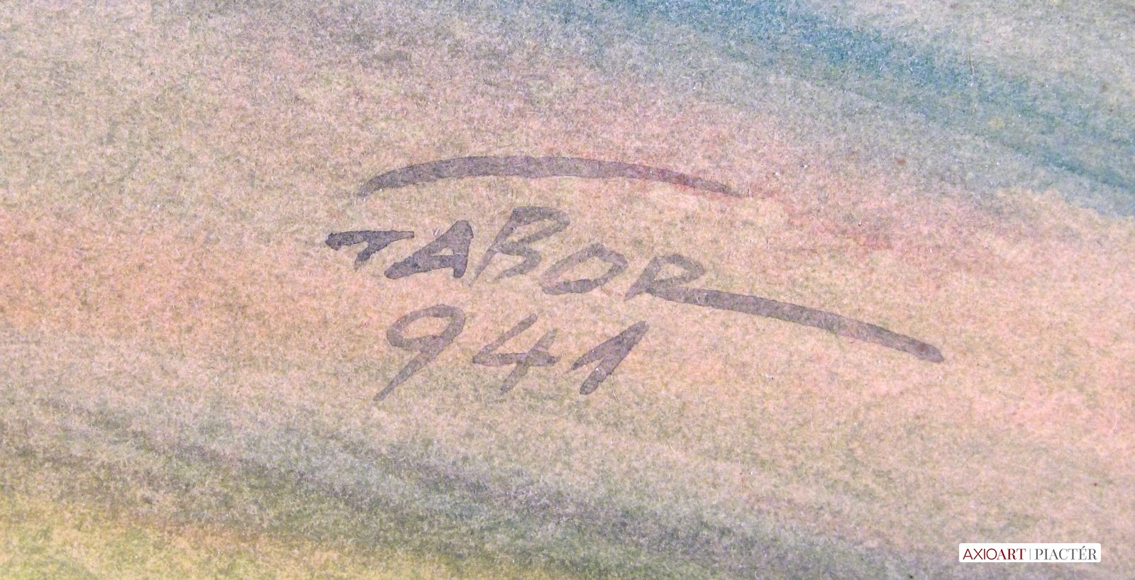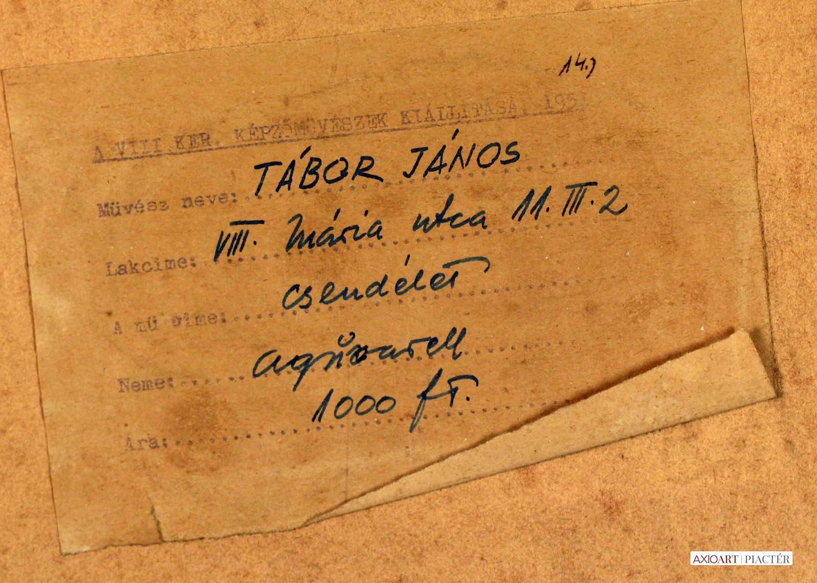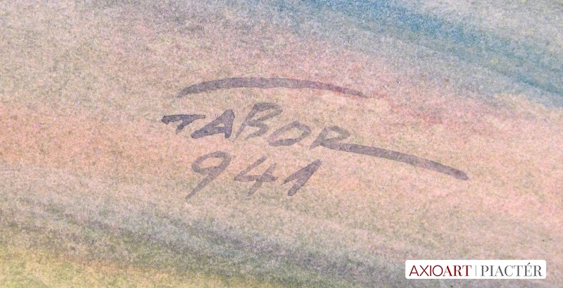 [FKA293/Bp64/16] A kép mérete: 40 x 50 cm keret nélkül. Készült: Akvarell, Papír A kép Tábor János alkotása. Jelezve jobbra lent "Tábor 941" A festmény jó állapotban van. Keret: Ép Magyar festők és grafikusok életrajzi lexikona I-II. Festő és grafikus. Budapesten végezte művészeti tanulmányait, itt is működött. 1913-tól állított ki alakos műveket, csendéleteket és grafikai műveket budapesti tárlatokon. 1924-től a Magyar Grafika című folyóirat munkatársaként dolgozott. Modern felfogású címlapokat és szedéspéldákat tervezett. Aktív tagja volt a Spirituális Művészek Szövetségének. (Éber) Magyar festők és grafikusok életrajzi lexikona I-II. Műgyűjtők és kereskedők kézikönyve Festő, grafikus. Budapesten végezte tanulmányait, itt is működött. 1913-tól állított ki figurális műveket, csendéleteket és grafikai munkákat fővárosi kiállításokon. 1924-től a Magyar Grafika c. folyóirat munkatársaként dolgozott. Modern felfogású címlapokat és szedéspéldákat tervezett. Tagja volt a Spirituális Művészek Szövetségének. (Éber) Magyar festők és grafikusok adattára Festő és grafikus Budapesten, ahol tanulmányait is végezte. 1913 óta állít ki figurális képeket, csöndéleteket és grafikai munkákat a fővárosi tárlatokon. 1924 óta évekig munkatársa a Magyar Grafika c. folyóiratnak, amelybe modern fölfogású címlapokat és szedéspéldákat tervezett. Tagja a Spirituális Művészek Szövetségének. – MTA