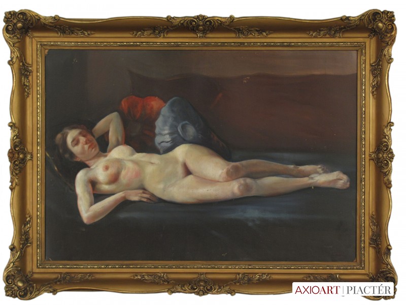 [1Y034/Z018] Olaj vászon festmény, üveglap mögött, szép állapotú képcsarnokos keretben. Akasztási lehetőséggel rendelkezik. Jelezve jobbra lent: Balog A. Hátoldalán a kereten Képcsarnok Vállalat címke töredék látható, rajta felirat: A művészeti alkotás címe: LEÁNY Magasság: 86 cm Szélesség: 66 cm Súly: 5.37 kg Balogh András (képei szignóján az 1960-as évektől Balog) (Budapest, 1919. március 14. — Budapest, 1992. március 18.) festőművész, kerttervező, művészeti szakíró, c. egyetemi tanár. Életpályája és munkássága Apai ágon a géresi Baloghok Szatmár megyéből a dél-erdélyi Alsó-Fehér megyébe származtak, anyai fölmenői a Székelyföldön: Csíkban, ill. Háromszéken éltek. Szülei az 1900-as évek elején költöztek Budapestre. A Képzőművészeti Főiskolán 1937-ben kezdte meg tanulmányait Burghardt Rezső tanítványaként. 1950-töl 1980-ig a Kertészeti Főiskolán (később Kertészeti Egyetem) tanított a kerttervezési tanszéken művészettörténetet, szabadkézi rajzot, ábrázoló geometriát és kertesztétikát. Az Iparművészeti Főiskolán óraadóként kertesztétikát adott elő. 1971-ben részt vett a firenzei Palazzo Strozziban rendezett biennálén, ahol aranyéremmel tüntették ki. Rendszeres önálló és csoportos kiállítások sora következett ezután nemcsak Magyarországon, hanem Olaszország és Németország számtalan városában, kiállított Finnországban, Kanadában is. Egyéni kiállításai gyakran katalógusokkal jelentek meg.[1][2][3] Nyaranként Tihanyban vagy Zsennyén alkotott. Festészetét poétikus realizmus jellemzi, dekoratív elrendezésű kompozíciói és lágy színvilága bensőséges hangulatot, szépséget, harmóniát árasztanak. (Lány egyszarvúval; Alvó, Emberpár és táj, stb.) Nagyon sok tájképet és portrét festett, történelmi személyiségekről is, 1978 és 1989 közt megfestette Mindszenty József bíboros portréját. Képei a Magyar Nemzeti Galériában, vidéki múzeumainkban, olasz, német, finn, észak-amerikai, kanadai, ausztráliai gyűjteményekben vannak.