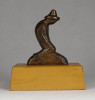 [1M110/X003] Szép állapotú bronz kisplasztika fa talapzaton. Felirat: 24. MISKOLCI TÉVÉ FESZTIVÁL 1984 Jelzés: SZZ Magasság: 8.5 cm Szélesség: 8.7 cm Súly: 0.275 kg Szentirmai Zoltán szobrász Budapest, 1941-12-4 Szerző: Kernács Gabriella-Wehner Tibor 1963-1967: Magyar Képzőművészeti Főiskola, mestere: Somogyi József. 1967-től a Kirakatrendező és Dekoratőr Szabadiskolában tanít rajzot és művészettörténetet. 1972: Fiatal Képzőművészek Stúdiója Egyesület kiállításának díja; 1978: a Szegedi Nyári Tárlat díja; 1981: a VII. Országos Kisplasztikai Biennálé díja; az V. Nemzetközi Kisplasztikai kiállítás megosztott fődíja; 1983: a IV. Országos Éremművészeti Biennálé díja; 1987: Munkácsy-díj; 1995: a Törley kisplasztika- és érempályázat fődíja; 1996: Nemzetközi Alkotótelep, Nyíregyháza, Pro Arte aranyérem; Millecentenáriumi Országos Nyári Tárlat, I. díj, Debrecen. 1979-től Szentendrén él. ~ intellektuális, tűnődő szobrászalkat, virtuóz módon bánik a kővel, agyaggal, bronzzal, a fával. Szobrászatának egyik alapkérdése a “bezártság-kibontakozás-kitörés” gondolatköre. Fa Prometheusa (a 70-es évek elejéről) fenyegető, sarkos, kemény formák közt vergődő lágy, organikus forma, Nikéjén egy talált, vízmosta fadarabot önt bronzba, s lesz belőle térbe úszó, lángként fellobbanó Győzelem-istennő. Vénusz születése c. munkáján hófehér gipszdrapériát szakít át – három fázisban – egy kibomló, előrelendülő női akt. A “bezártság-szabadság” témakörhöz korán megalkot egy alapjelet: egy térbe írt kockaélvázat, ebben – mint ketrecben – lebeg felfüggesztve Déry Tibor hevesen gesztikuláló gipsz portrészobra. Ez a kockakeret – mint az eleve elrendeltség, a végzet, a behatárolt sors jele – írja körül a fehér kőtömbökről felszárnyaló, azokra visszazuhanó Ikarusz bronzalakját, s mint rézkarám fogja be, szorítja össze a Vége a kalandozásoknak c. tömör kisplasztika bronzlovakon hánykolódó harcosait. ~ szobrászatának fontos jellemzője az időutazás. A pályáját szépen indító Művészettörténet c. bronz plakett-sorozaton tömör, statikus dór oszlopformával indul az időjáték, alig mozduló román toronnyal, kapubolttal, majd felszökkenő, szétboruló gótikus csúcsívekkel folytatódik, hogy a reneszánszban áttörjön, kinyíljon a plakett hátfala, s a levegőégen megjelenjen az emberalak. ~ fontos műfaja a plakett és az érem, jól érvényesül benne a finom, szellemes részmegoldások, a kevéssel sokat mondás iránti érzéke. A falakat megnyitó reneszánsz gondolata később míves, különös szépségű kő-bronz kisplasztika-sorozattá érik, amely műfaj ~nak szintén erőssége. Az “időutazások” egyik szép darabja az Üzenet az etruszkoknak c., meghasadt kerámiatorzó, rajta titokzatos időjelek, ruharedők, etruszk tombabejárat halvány rajza. ~ szívesen épít szobrot egy-egy frappáns ötletre: az agyonkoptatott Dózsa-témában is tudott újszerűt hozni az üszkös fatrónra ráolvadt bronz testlenyomat-darabokkal. Különösen érzékivé, mívessé, izgalmassá teszi szobrait a különböző anyagok alkalmazása, az egymásba ágyazott-telepített kő, bronz, fa ellentétének feszültsége. Ezzel él korai, félelmetes, rusztikus kő ősállat-bagoly szobrán, amelynek lábai bronz gépmarkolók, s a Magyar gályarab prédikátorok emlékszobrán, ahol a nevekkel teleírt sziklasír-kőtömb hajóból sírjelforma bronzárboc és bronzevezők nőnek. Köztéri munkáiban folytatja a magyar emlékműszobrászat hagyományait (Vitéz János kőpadon ülő bronzszobra Esztergomban), de él a XX. század számára kedves szobrászeszközével: a megmintázott vagy megfaragott tárgy szoborrá emelésével is (kő Szőlőprése Nagyrédén). Irodalom kiállítása, Művészet, 1971/9. [K. GY.]: ~, Művészet, 1983/8. Emlékterek. ~ szobrairól, Művészet, 1984 LÓSKA L. SZERK.: Pest megye képzőművészete. Művészettörténeti tanulmányok, Szentendre, 1990 KOVÁCS P.: A tegnap szobrai. Fejezetek a magyar szobrászat közelmúltjából, Szombathely, 1992 CHIKÁN B.: Érmek és majdnem érmek Szentendréről (kat., bev. tan., Szentendrei Képtár, Szentendre, 1994). Film KERNÁCS G.-B. FARKAS T.: A TV Galériája, MTV, 1974. Egyéni kiállítások Egyéni kiállítások 1977 • Fészek Klub, Budapest 1994 • Műhely Galéria, Szentendre. Válogatott csoportos kiállítások Válogatott csoportos kiállítások 1978 • Szegedi Nyári Tárlat 1981 • VII. Országos Kisplasztikai Biennálé, Pécs • V. Nemzetközi Kisplasztikai kiállítás, Műcsarnok, Budapest 1983, 1987 • IV., VI. Országos Éremművészeti Biennálé, Sopron Szentendrei művészek kiállításai, Műhely Galéria, Budapest • Ferenczy Múzeum, Szentendre • Szentendrei Képtár, Szentendre 1994 • Érmek és majdnem érmek, Szentendrei szobrászok kiállítása, Szentendrei Képtár, Szentendre 1995 • Törley kisplasztika és érempályázat 1996 • Nemzetközi Alkotótelep, Nyíregyháza • Millecentenáriumi Országos Nyári Tárlat, Debrecen 1997 • XI. Országos Kisplasztikai Biennálé, Pécs 2001 • Szobrászaton innen és túl, Műcsarnok. Művek közgyűjteményekben Művek közgyűjteményekben Magyar Nemzeti Galéria, Budapest Liszt Ferenc Múzeum, Sopron Forrás: artportal.hu