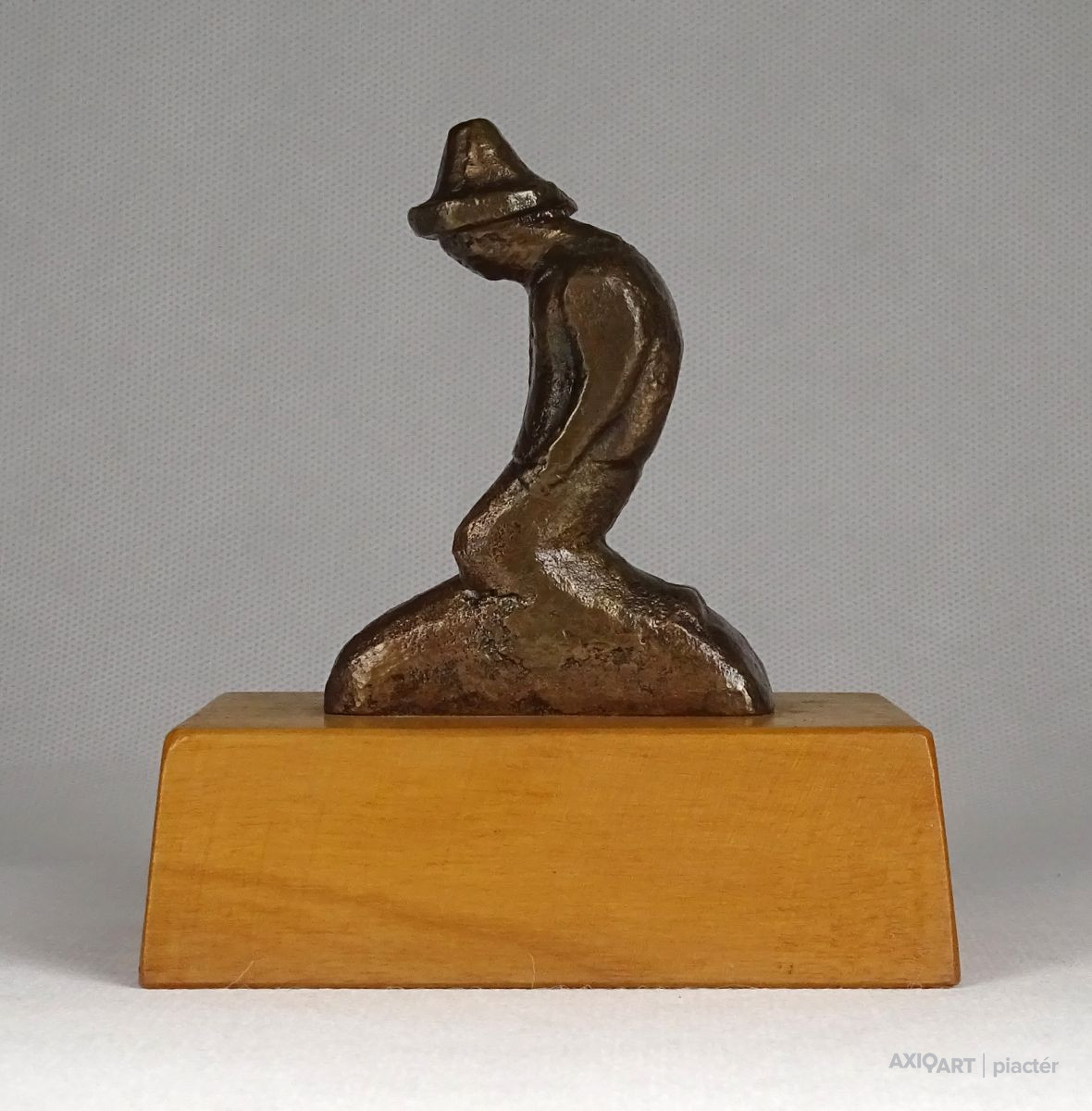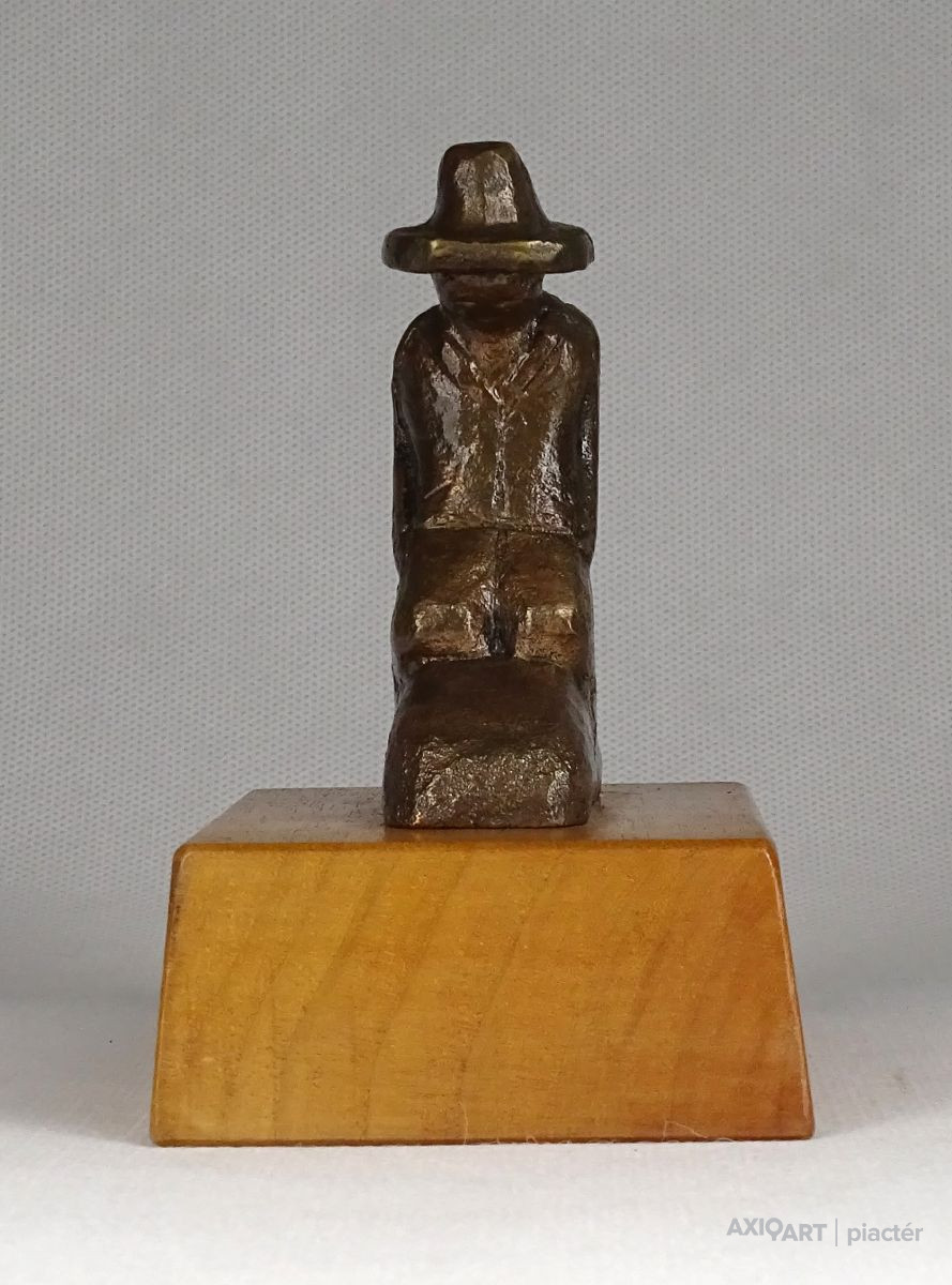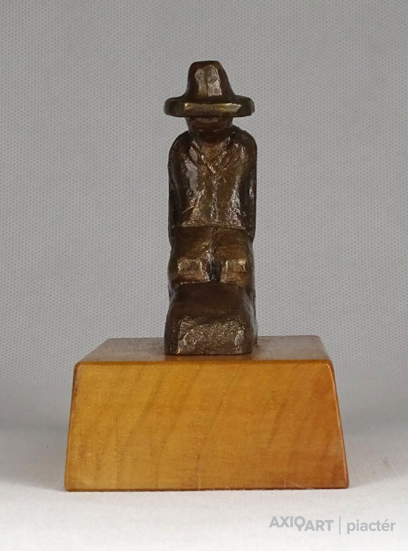 Vastag fa talapzaton kis méretű bronz szobor. Térdelő kalapos férfi.