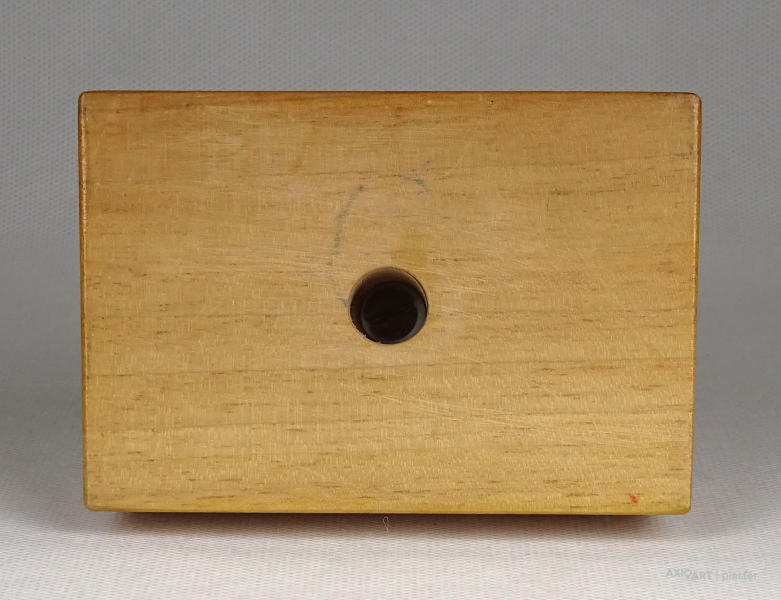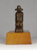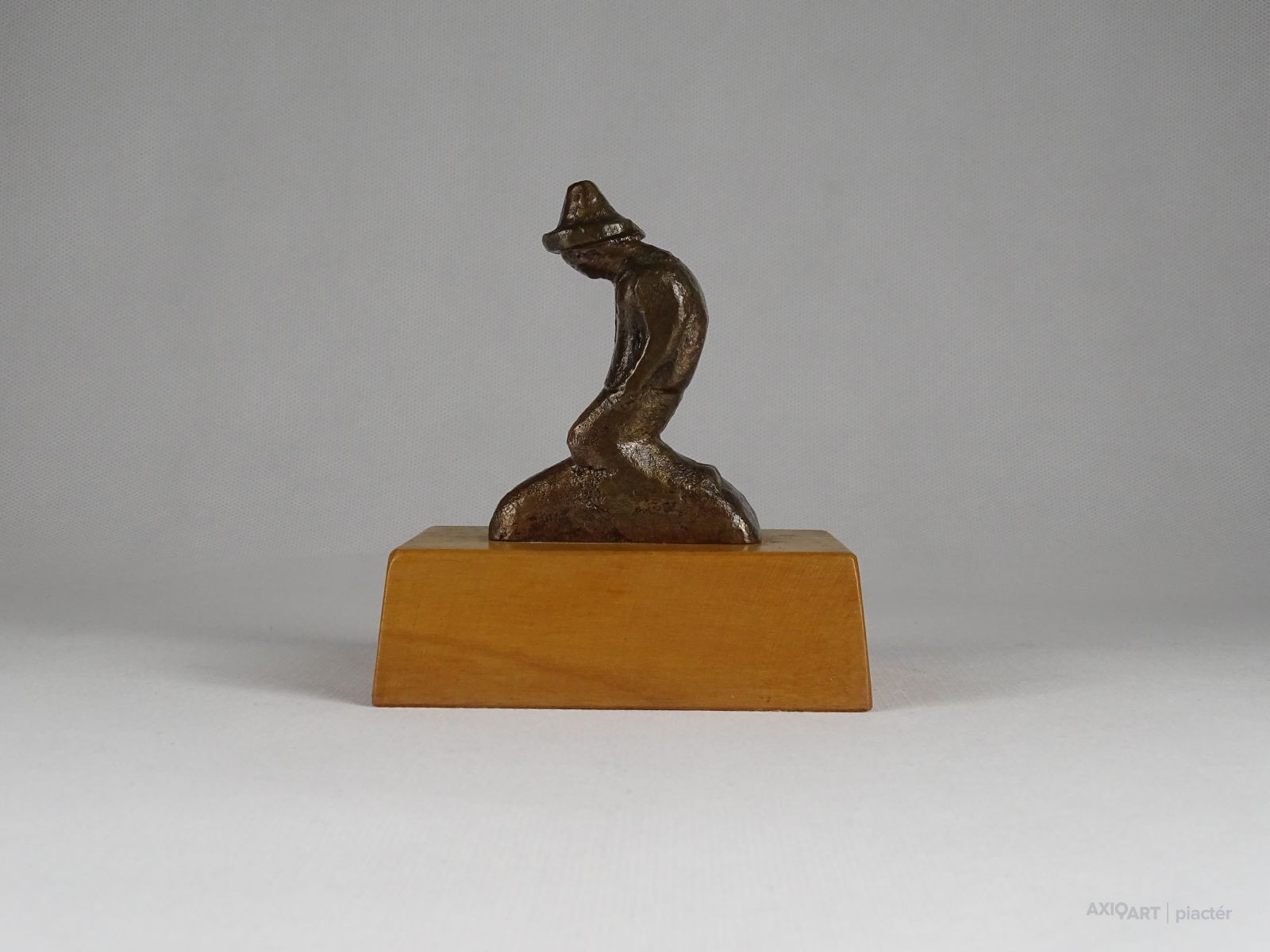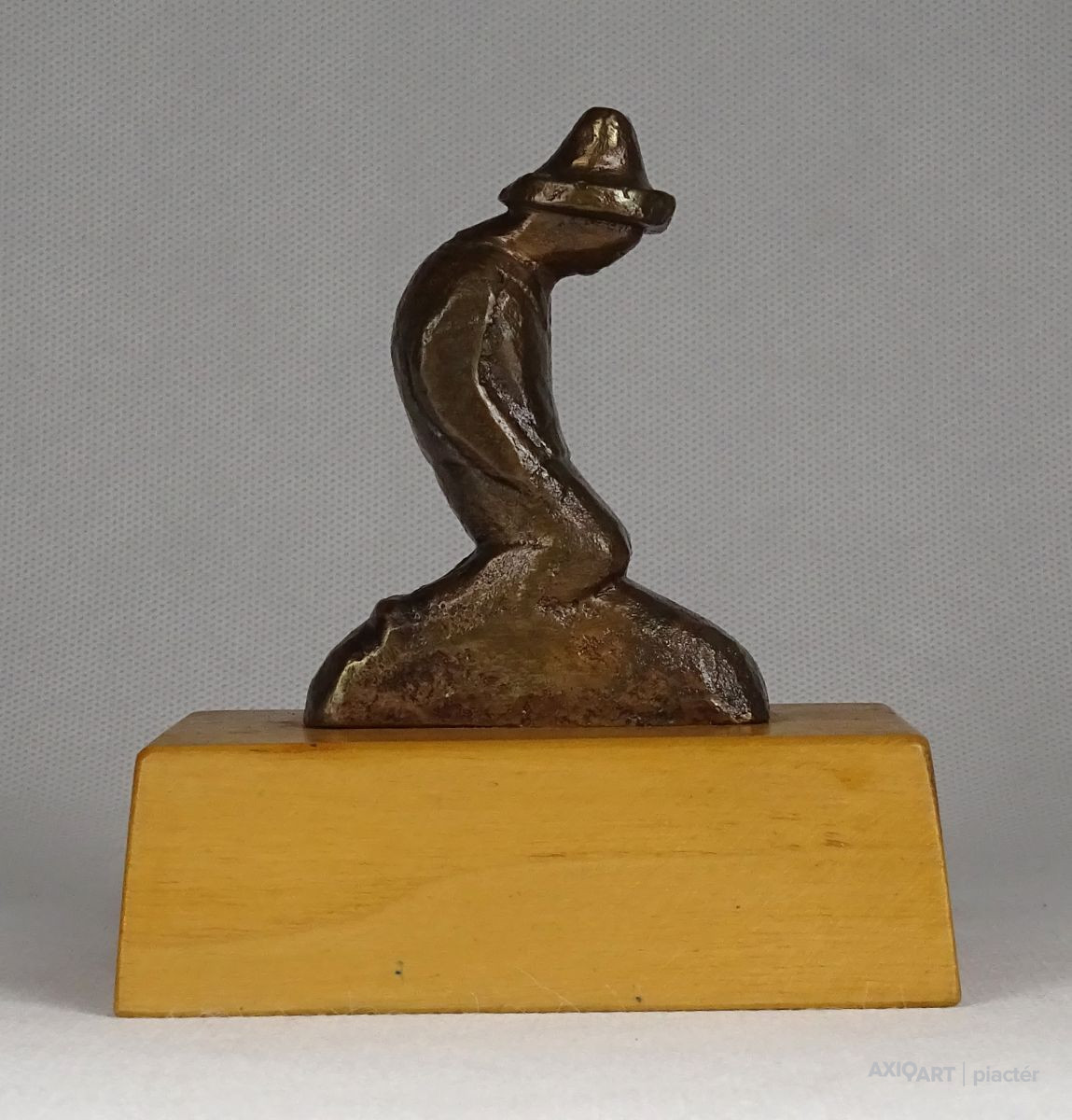Vastag fa talapzaton kis méretű bronz szobor. Térdelő kalapos férfi.