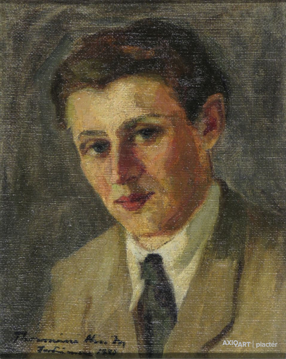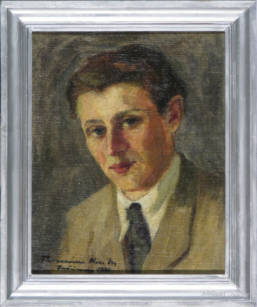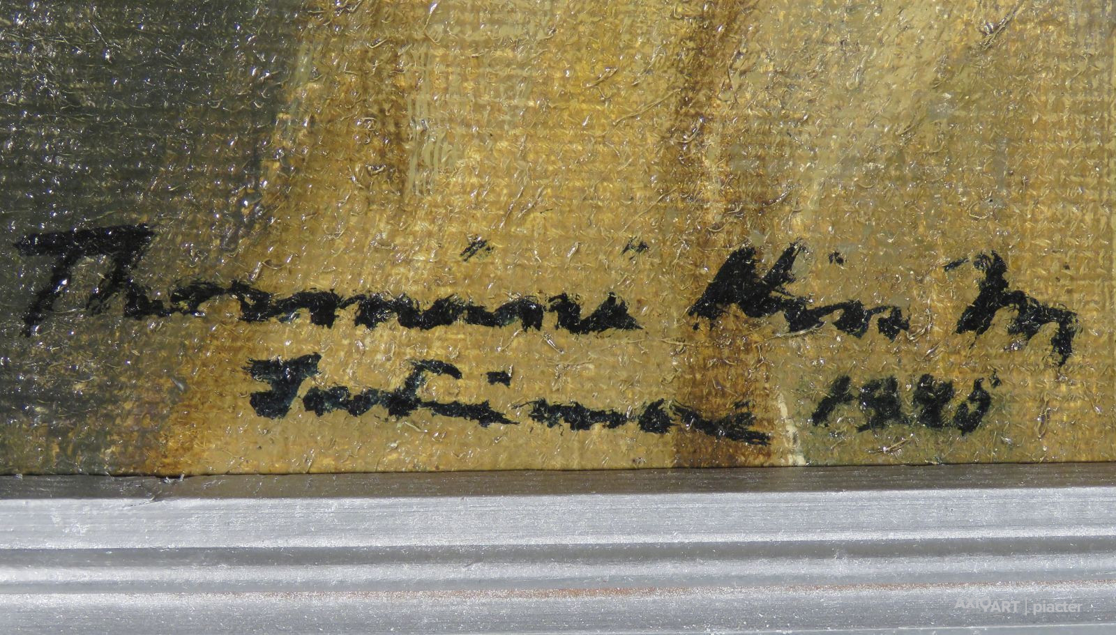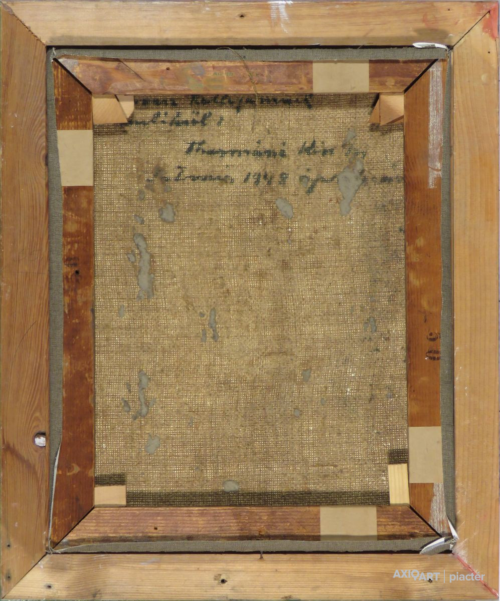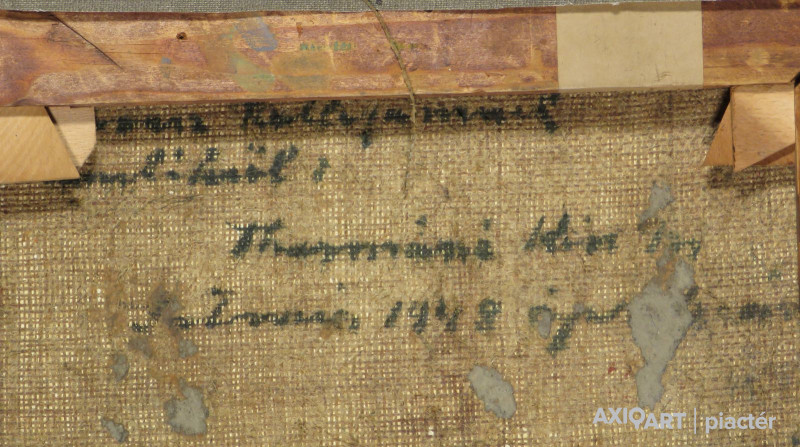[FKC197/Bp203/86] A kép mérete: 45,5 x 36,5 cm keret nélkül. Készült: Olaj, Vászon A kép Thorma Jánosné, Kiss Margit (Eger, 1901, Nagybánya, 1977) alkotása. Jelezve balra lent "Thormáné Kiss M. 1949" A festmény jó állapotban van. Keret: Ép A festmény hátoldalán autográf feljegyzés látható. Magyar festők és grafikusok életrajzi lexikona I-II. Festő. Thorma János hitvese. A nagyenyedi tanítóképzőt elvégezte, 1924-ben Nagybányára ment. Itt kezdett rajzolgatni, majd Thorma Jánostól tanult festeni a nagybányai festőiskolában. 1929-ben házasságot kötött mesterével, akihez rokoni szálak fűzték. Mikor feleségül ment hozzá (a 31 éves korkülönbség ellenére) a már ősz hajú mester közel járt a hatvanhoz. 1926-44 között megszakítás nélkül a festőkolónián tevékenykedett. Több nagybányai, erdélyi és budapesti kiállításon szerepelt naturalisztikus jellegű alkotásaival. 1927-ben, 1928-ban, 1932-ben, 1936-ban, 1937-ben vett részt nagybányai koll. kiállításokon. Rajztudása jobb volt, mint színérzéke, ezért fordult pályája kezdetén az alakos ábrázolás felé (Golgota, Utolsó vacsora, Aratók, Festőnő, stb.). Tájképeiben már több volt a felületesség, az utánérzés. Természetes, hogy Thorma közelében tanítómesterének stílusa, modora érződött munkáin. Eleinte teljesen mestere hatása alá került. Tehetségesen utánozta őt. A pasztellfestésben ért el méltathatóbb eredményeket, olajfestményei nehézkesebbek. Az utolsó időkben fokozottabban a portréra vetette magát, mely területen nyilvános eredményeket is elért. Nemcsak hatott rá Thorma, hanem férje munkáit később bravúrosan utánozni is tudta. Thorma kolóniabeli műtermében lakott mindvégig. A II. Világháború után egyre kevesebbet alkotott, kényszerképzetektől gyötörve, zavarodott elmével halt meg. 1941-ben egy nagybányai kollektív kiállítás alkalmával Szent István-díjjal jutalmazták. Alkotásai helyet kaptak több erdélyi és magyarországi közgyűjteményben, valamint jelentős hazai és külföldi magángyűjteményekben. (RI-NF ú.k., NF, Dr. Szabó Ákos) Magyar festők és grafikusok életrajzi lexikona I-II. Műgyűjtők és kereskedők kézikönyve Festő. Thorma János hitvese. A nagyenyedi tanítóképzőt elvégezve, 1924-ben Nagybányára ment. Itt kezdett rajzolgatni, majd Thorma Jánostól tanult festeni a nagybányai festőiskolában. 1929-ben házasságot kötött mesterével. 1926-44 k. megszakítás nélkül a festőkolónián tevékenykedett. Számos nagybányai, erdélyi és budapesti kiállításon vett részt naturalisztikus modorú munkáival. 1927-ben, 1928-ban, 1929-ben, 1932-ben, 1936-ban, 1937-ben vett részt nagybányai koll. kiállításokon. Pályája kezdetén az alakos ábrázolás felé fordult (Golgota, Utolsó vacsora, Arató, Festőnő, stb.). Tájképeiben már több volt a felületesség, az utánérzés. Természetes, hogy Thorma közelében tanítómesterének stílusa, modora érződött munkáin. Eleinte teljesen mestere hatása alá került. Tehetségesen utánozta őt. A pasztellfestésben ért el méltathatóbb eredményeket, olajképei nehézkesebbek. Az utolsó időkben fokozottabban az arcképre vetette magát, mely területen nyilvános eredményeket is ért el. 1941-ben, egy nagybányai koll. kiállítás alkalmával Szent István-díjjal jutalmazták. (RI-NF ú.k., NF)