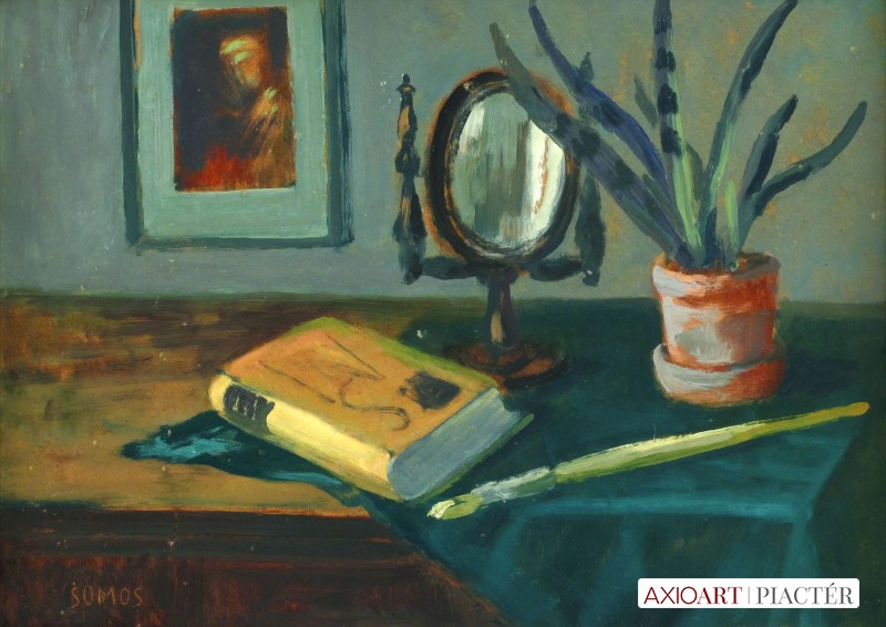 [FK2658/Z086] A kép mérete: 50 x 70 cm keret nélkül. Készült: Olaj, Farostlemez A kép Somos Miklós (Miskolc, 1933) alkotása. Jelezve Balra lent "Somos" A festmény jó állapotban van. Keret: Restaurált Magyar festők és grafikusok életrajzi lexikona I-II. Festő. 1951-57 között a budapesti Képzőművészeti Főiskolán Fónyi Géza tanítványa volt. A '60-as és a '70-es években rendszeresen dolgozott Zsenyén. 1997-től a Magyar Művészeti Akadémia tagja. Az 1950-es évektől vesz részt országos tárlatokon. Kortárs magyar művészet külföldi seregszemléin is bemutatták munkáit. Festészete a hódmezővásárhelyi iskolához kapcsolódik, de hatott rá a középkori művészet is, amelynek főleg ikonográfiai kérdései foglalkoztatják. Szimbolikus kifejezés, összefoglaló formaadás jellemzi műveit. Munkaábrázolásainál, tájképeinél, aktjainál, képmásainál túllép a valóság egyedi jelein. 1963-ban Hódmezővásárhelyen kerámiaképeket is készített. Az 1970-es évek elején művészete megújult. Komor jelenetek helyett, színesedő palettával kubo-szürrealisztikus tereket, csendéleteket festett, majd a '80-as évekre munkái még oldottabbá váltak. Választékos színvilága, látomásszerűen sejtelmes hangulatai lírai megfogalmazást nyernek. Továbbra is a világ összefüggéseit kutatja, festészete transzcendens elemekkel és allegóriákkal gazdagított. Vonzódik a bibliából kiinduló narratív jelenetek ábrázolásához. Egyházművészeti tevékenységét különböző templomokban lévő seccói jelzik. Nagyvonalúan dolgozza fel a korábbi korok művészi eredményeit, különösen vonzódik a román kor, a gótika és a reneszánsz mestereinek reminiszcenciáihoz. Számos díjjal jutalmazták munkásságát (Munkácsy-díj; Tornyai-plakett; Derkovits-ösztöndíj; Család pályázat II. díj; az egri I. Országos Akvarell Biennále; Művészeti Alap díja; Egry József-díj; a Szegedi Nyári Tárlat díja; a IV. Balatoni Nyári Tárlat festészeti díja, a miskolci Jubileium Tárlat III. díja; a Szegedi I. Táblaképfestészeti Biennále díja; SZOT-díj, a Hatvani XIV. Orsz. Tájképfestészeti tárlat ezüst diplomája; a Szent Miklós Érdemrend aranykeresztje; a Hatvani XIV. Orsz. Tájképfestészeti Biennále arany diplomája. A Magyar Nemzeti Galéria és több vidéki közgyűjtemény őrzi alkotásait. (S.I.: Műv. 1964/5. P.K.: Műv. 1965/10. ML, P.K.: Műv. 1966/4. S.R.: Műv. 1969/5. Cs.Gy.: Műv. 1972/2) Magyar festők és grafikusok életrajzi lexikona I-II. Műgyűjtők és kereskedők kézikönyve Festő. A bp.-i Képzőművészeti Főiskolán Fónyi Géza növendéke volt. Festészete a hódmezővásárhelyi iskolához kapcsolódik, de hatott rá a középkori művészet is, amelynek főleg ikonográfiai kérdései foglalkoztatják. Szimbólikus kifejezés, összefoglaló formaadás jellemzi munkáit. 1961 óta szerepel hazai és külföldi tárlatokon. 1968-ban Bécsben szerepelt egy csoport kiállításon. 1959-62 k. Derkovits-ösztöndíjat kapott. 1972-ben Egry-díjat, 1968-ban az Egri Akvarell Biennálé-díját, 1969-ben a Tornyai-platettet, 1973-ban Munkácsy-díjat nyert. (ML, S.R.: Műv.-1969/5) Magyar festők és grafikusok adattára A Képzőművészeti Főiskolán 1957-ben végzett, Fónyi Géza növendékeként. Festészete a hódmezővásárhelyi iskolához kapcsolódik, de hatott rá a középkori művészet is, melynek főleg ikonográfiai kérdései foglalkoztatják. Szimbolikus kifejezése, összefoglaló formaadás jellemzi munkáit. 1961 óta kiállító művész: tárlata 1965-ben és 1972-ben az Ernst Múzeumban, 1968-ban a Ferencvárosi Pincetárlat helyiségében, 1969-ben a Központi Fizikai Kutatóintézetben, 1971-ben a Fészek Klubban, 1976-ban Győrött és Szegeden volt. Ernst Múzeumbeli tárlati számos vidéki városban (Dunaújváros, Hódmezővásárhely, Eger, Miskolc stb.) bemutatták. 1965-ben szerepelt a Párizsi Ifjúsági Biennálén, 1968-ban kiállított Bécsben és Bolognában. 1959-1962-ben Derkovits-ösztöndíjat, 1972-ben Egry-díjat, 1973-ban Munkácsy-díjat kapott. 1969-ben elnyerte a Tornyai plakettet. 1968-ban az Egri Akvarell Biennálén, 1975-ben a Szolnoki Festészeti Triennálén díjazták. Könyve: Rousult. Bp. 1965. - Irod.: Szij Rezső: Somos Miklós. Alföld, 1964. 6. sz. - ML Művészeti lexikon I-IV. A Képzőművészeti Főiskolán (1951-57) Fónyi Géza növendéke volt. 1959 óta vesz részt kiállításokon. 1965-ben a Párizsi Ifjúsági Biennálén szerepelt és az Ernst Múzeumban volt első számottevő bemutatkozása. Figurális kompozíciót, tájképeket összefogott forma- és színvilág jellemzi. A hódmezővásárhelyi művésztelep hatására kerámiaképeket is készít. Könyve: Roualut, Bp., 1965. Művész életrajzok kortárs magyar képzőművészek 1957-ben fejezte be főiskolai tanulmányait Fónyi Géza növendékeként. Tanulmányutakat tett Olasz- és Franciaországban, Jugoszláviában, Norvégiában, Lengyelországban és Bulgáriában. 1961 óta kiállító művész, számos kisebb, vidéki bemutató mellett 1965-ben az Ernst Múzeumban, 1972-ben a Műcsarnokban, 1981-ben a Kulturális Kapcsolatok Intézetében jelentkezett gyűjteményes anyaggal. Nagyobb kollekcióval szerepelt Párizsban, Bécsben és Bolognában. 1959-1962-ben Derkovits-ösztöndíjat, 1972-ben Egry-díjat, 1973-ban Munkácsy-díjat kapott; 1969-ben elnyerte a Tornyai-plakettet, 1967-ben a szegedi nyári tárlaton, 1968-ban az egri akvarell-biennálén, 1975-ben a szolnoki festészeti triennálén díjazták. - Formanyelve sokban merít a középkori és a korareneszánsz művészet stílushagyományaiból; képeiből gyengédség, a tárgyi-figurális lényeglátás, kifejező szuggesztivitás sugárzik. Fest tájképeket, portrékat, figurális kompozíciókat, fő erőssége az intellektuális tartalmú csendélet és életkép. Jel