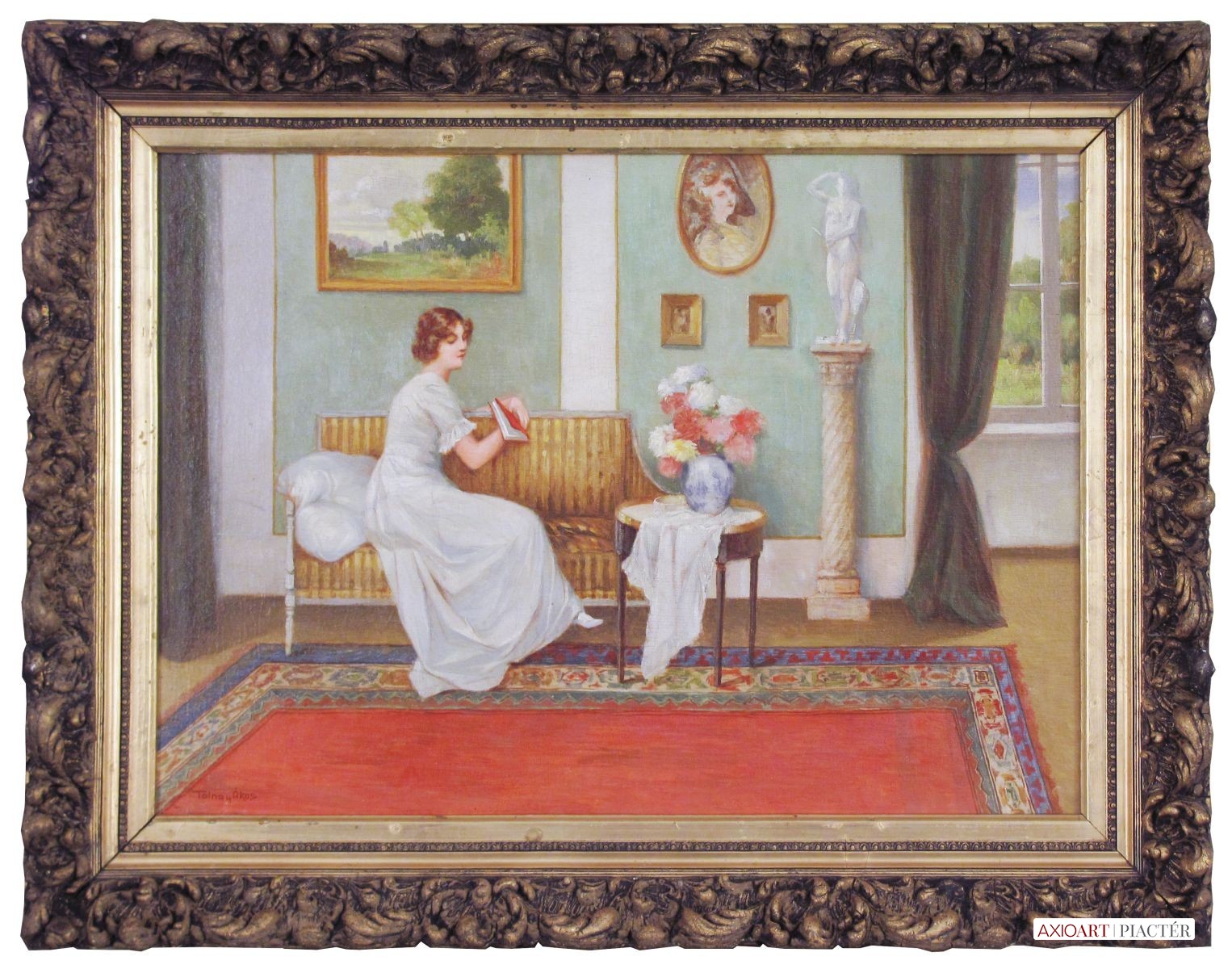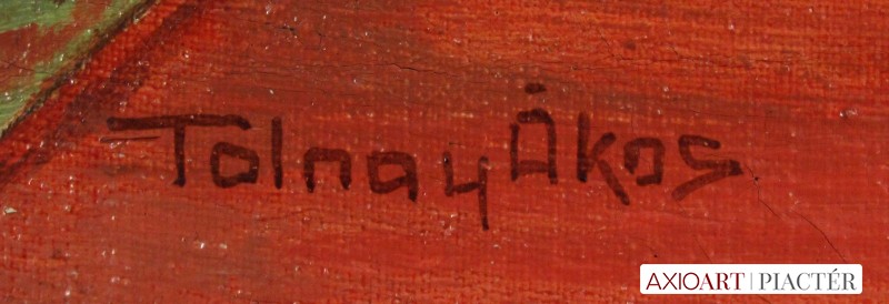[FKA088/075] A kép mérete: 50 x 70 cm keret nélkül. Készült: Olaj, Falemez A kép Tolnay Ákos (Pest, 1861) alkotása. Jelezve balra lent "Tolnay Ákos" A festmény jó állapotban van. Keret: Sérült Magyar festők és grafikusok életrajzi lexikona I-II. Pest, 1861 - ? Festő. A bécsi akadémiáról ment a müncheni Képzőművészeti Akadémiára, ahol 1884-ben akadémiai bronzéremmel jutalmazták. Félbehagyva müncheni tanulmányait ár ebben az évben a Benczúr-mesteriskolába sietett, és itt képezte magát. Leginkább arcképeket festett, de kisebb tájképekkel is szerepelt kiállításokon. 1907-ben Budapesten, Aradon, stb. volt tárlata. A Benczúr Társaság tagja volt. Egy arcképtanulmánya a Magyar Nemzeti Galériában, Knezics Zoltán arcképe a főváros, Pucher József építész arcképe a Budapesti Építőmesterek Ipartestületének tulajdonában van. (Éber, L-MMM) Magyar festők és grafikusok adattára (Pest, 1861 - ) Bécsben és Münchenben tanult és leginkább arcképeket festett (Wekerle, Radocza, Csillag Teréz stb.), azon kívül kisebb tájképekkel is szerepelt a kiállításokon. 1907-ben Budapesten, Aradon stb. volt kiállítása. Egy arcképtanulmánya a Magyar Nemzeti Galériában, Knézics Zoltán arcképe a főváros, Pucher József építész arcképe a budapesti építőmesterek ipartestületének tulajdonába került. A Benczúr Társaság tagja volt. - MTA Művészeti lexikon I-II. festő, szül. Budapest 1861. aug. 10. Budapesten tanult és leginkább arcképeket festett (Wekerle, Radocza, Csillag Teréz stb.), azonkívül kisebb tájképekkel is szerepelt a kiállításokon. Kortárs magyar művészeti lexikon I-III. Pest, 1861 – Festő. Bécsben és Münchenben tanult. Leginkább arcképeket festett, de kisebb tájképekkel is szerepelt kiállításokon. 1907-ben Budapesten, Aradon, stb. volt tárlata. A Benczúr Társaság tagja volt. Egy arcképtanulmánya a Magyar Nemzeti Galériában, Knezics Zoltán arcképe a főváros, Pucher József építész arcképe a Budapesti Építőmesterek Ipartestületének tulajdonában van (Éber)