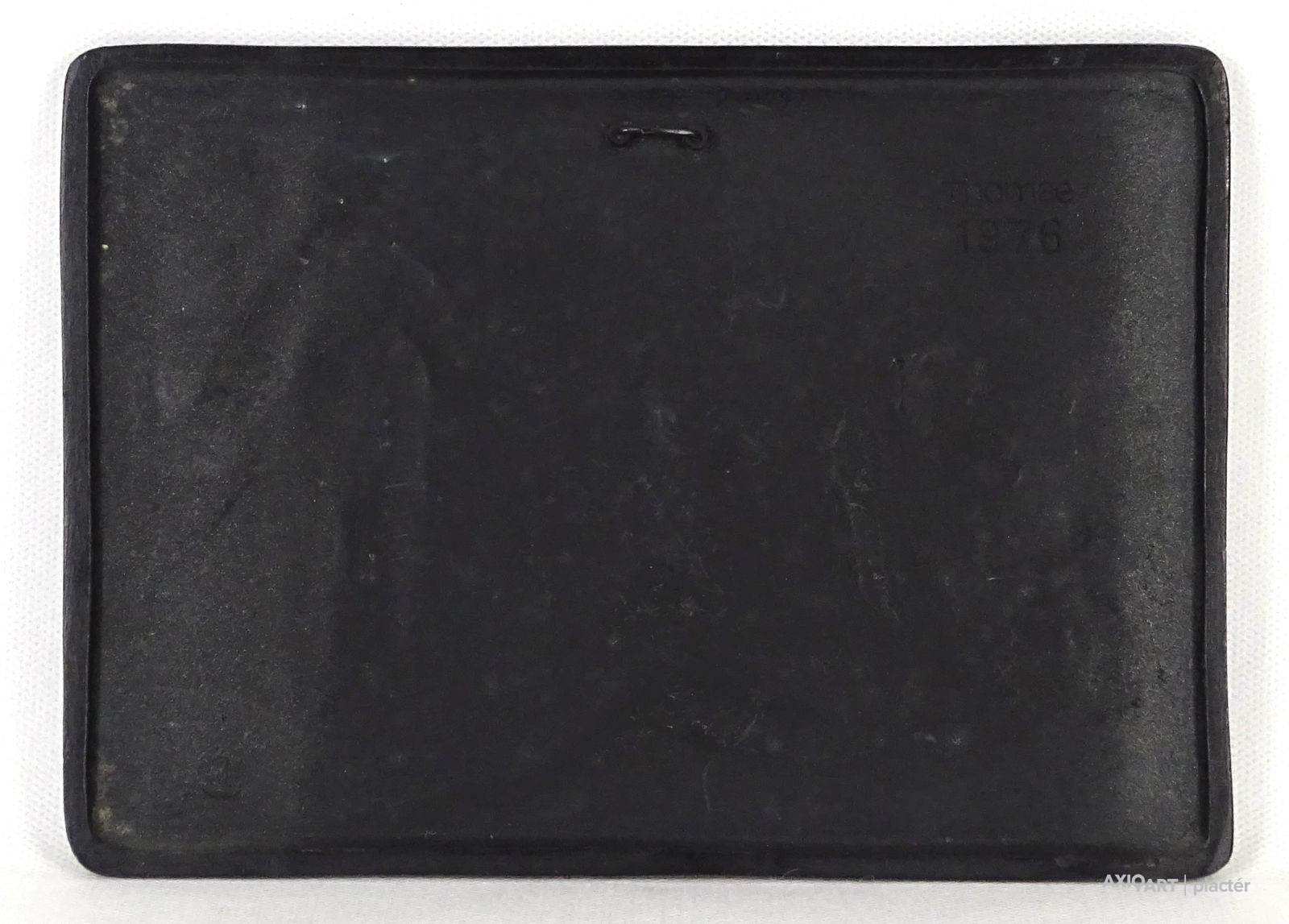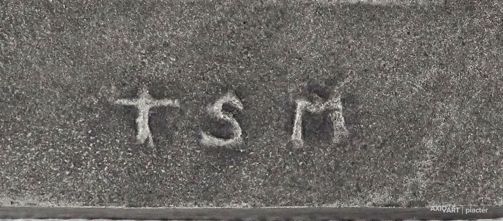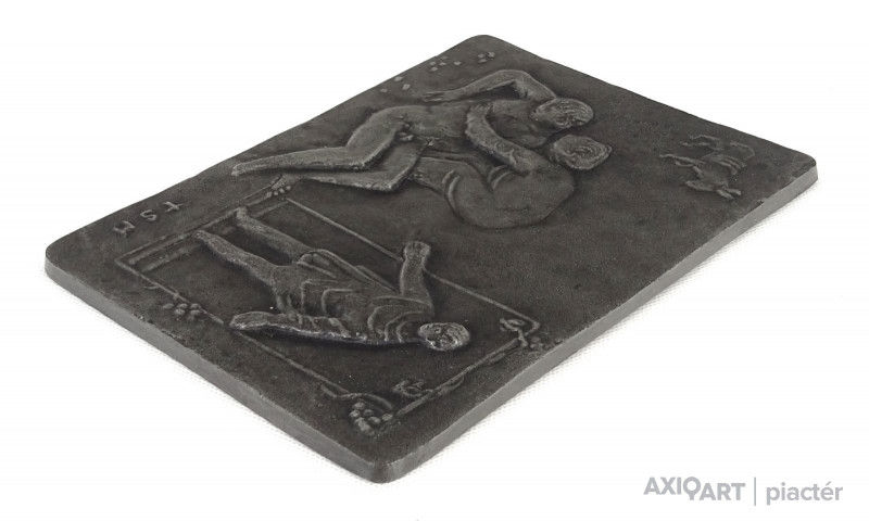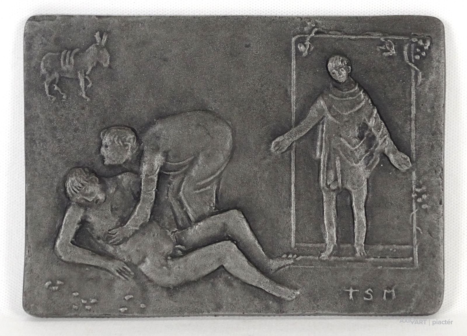 [1P478/X154] Régi jelzett öntöttvas relief. Akasztási lehetőséggel rendelkezik. Jobbra lent jelzés: TSM Hátoldalán datált jelzés, felirat: THOMAE 1976 (Buderus Thomae 1976) Magasság: 14.7 cm Szélesség: 20.8 cm Súly: 0.64 kg Toni Schneider-Manzell Ugrás a navigációhozUgrás a kereséshez Speyer katedrális , fő portál (részlet) Toni Schneider-Manzell ( 1911. február 22. , Manzell , Friedrichshafen mellett ; 1996. november 7. Rosenheim , Felső-Bajorország) német - osztrák szobrász . Életrajz  Toni Schneider, aki később születési helyének nevét is hozzáadta személyes nevéhez, a müncheni akadémiára járt, majd a svájci ticinoi Asconában dolgozott rajta . 1944-ben Ausztriába költözött, előbb a Salzburg melletti Weitwörthbe , majd 1955-ben magába Salzburgba, ahol megalkotta többek között a salzburgi székesegyház (hitkapuját), szószékét és keresztelőkútjának fedelét . Hans Conrad Fischer rendező és lánya, Nela korán elhunyt festőművész ismeretségi körébe tartozott , akikkel Salzburgban, különösen betegsége után, élénk művészeti eszmecserét folytatott. Schneider-Manzell az antik szobrok termesztéséről, a bronz érzékeny felületkezeléséről , a visszafogottság, az önvizsgálat, az álmodozás és az alázat kifejező tulajdonságairól volt ismert. Ez különösen jól látszik domborművein , kisplasztikáin és portréfejein , amelyek festői módon vázlatosak . Ugyanaz a nemes hagyománykezelés , amely a múlt tiszteletreméltó alkotásaival együtt élhet, Schneider-Manzellt a német nyelvterület vezető szakrális szobrászává predesztinálta. Legismertebb munkái közé tartoznak a székesegyház ajtói, valamint az esseni (1978–1980) és a speyeri keresztút.(1967-1971), Julius Raab emlékműve Bécsben (1967), Galen bíboros Münsterben (1978) és Graf Zeppelin ( 1985) , valamint a Trakl-kút (1957) és a "Vincentine Woman" (1986) Salzburgban . Díjak  1958: Osztrák Állami Képzőművészeti Nagydíj 1960: Felsősváb Művészeti Díj 1976: Szövetségi Érdemrend nagykeresztje 1981: Baden-Württemberg állam érdemérem  Művek (válogatás)  Szökőkútfigura OtterswangbanA "Kedves Ágoston" szobor Wasserburgban a Bodeni-tónál Portál („Hit kapuja”) és szószék a salzburgi katedrálisban Öntött bronz keresztút és domborművek a követeken a bécsi Liesing plébániatemplomban Trakl -kút a Salzburgi Egyetem központi rektorátusának és adminisztrációs épületének udvarán , Kapitelgasse 4–6, 1957 A salzburgi Nagy Fesztiválcsarnok 5 bronz kapuja (bejáratok a Hofstallgasse felől) Julius Raab emlékmű a Volksgarten Vienna-ban , 1967 a kultúrsétányon Stroblban Mozart anya-kút St. Gilgenben Szent Wolfgang kőszobra a templom bejáratánál és öntött kő dombormű a fuschi háborús emlékműnél a Glocknerstrasse-n Zeppelin emlékmű (13 méter magas) Friedrichshafenben, 1985 Szentségoszlop bronz tabernákulummal, Szent István domborművei. Leonhard (bejárat, kilincsek) a Salzburg melletti Szent Leonhard zarándoktemplomban Keresztút az augsburgi St. Thaddäus templomban A Speyer-székesegyház bronz főportálja A mannheim-neckaraui Szent Jakab-templom keresztoszlopa és húsvéti gyertyatartója , 1976/1986 Essen Minster bronzportáljai , 1978–1979 A keresztút fríze, Essen Minster 1976–1977 Falusi szökőkút, Bad Schussenried -Otterswang 1975-ben készült "DAPHNE" faszobor (magántulajdon Bécsben) "Kedves Augustin" bronzfigura 1974 (Gustl Sumser) Wasserburgban (Bodeni-tó)  Forrás: wikipédia