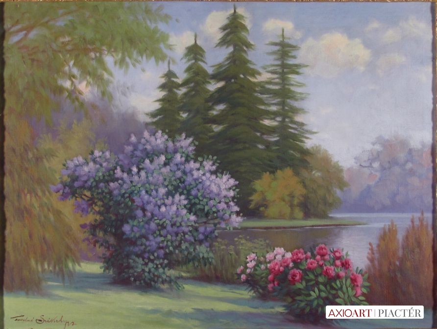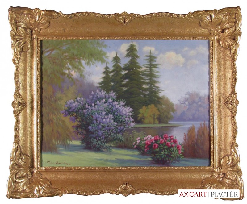 [FKC876/Bp92/46] A kép mérete: 100 x 81 cm keret nélkül. Készült: Olaj, Vászon A kép Ujváry Ignác (Pest, 1860, Kisoroszi, 1927) alkotása. Jelezve balra lent "Újváry I." A festmény jó állapotban van. Keret: Ép Magyar festők és grafikusok életrajzi lexikona I-II. Festő. Budapesten Lotz Károly mellett, a Benczúr-mesteriskolában, majd Münchenben és Párizsban tanult. Eleinte nagyobb kompozíciókkal szerepelt a fővárosi tárlatokon (Szent István szentté avatása), később visszavonulva Kisorosziba, erőteljes, friss tájfestményekkel lépett fel (virágos rét, Eresz alatt, stb.). 1928-ban a Műcsarnokban hagyatéki kiállítást rendeztek műveiből. Tanára volt a budapesti Iparművészeti Iskolának. Több díjat kapott. 1891-ben a Rökk-díjat, 1894-ben a Műbarátok-díját, 1895-ben pedig az Ipoly-díjat nyerte. Tagja volt a Magyar Képzőművészek Egyesületének. Néhány munkája a Magyar Nemzeti Galéria tulajdona. (Éber, ML, VNML) Magyar festők és grafikusok életrajzi lexikona I-II. Műgyűjtők és kereskedők kézikönyve Festő. Budapesten Lotz Károly mellett, a Benczúr-mesteriskolában, Münchenben és Párizsban tanult. Eleinte nagyobb kompozíciókkal szerepelt (Szent István szentté avatása), majd visszavonulván Kisorosziba, erőteljes, friss tájképekkel lépett fel. Tanára volt a fővárosi Iparművészeti Iskolának. 1891-ben Rökk-díjat, 1894-ben a Műbarátok díját, 1895-ben az Ipoly-díjat nyerte. Néhány képe a MNG tulajdona. (Éber) Művészeti lexikon I-II. Festő, szül. Budapest 1860. szept. 20. U. o. végezte tanulmányait s eleinte nagyobb kompozíciókkal szerepelt (Szent István szentté avatása), később visszavonulván Kisorosziba, erőteljes, friss tájképekkel lépett fel (Virágos rét, Eresz alatt). Tanára az Iparművészeti Iskolának. Művészeti lexikon I-IV. Festő. Bp.-en Lotz Károly tanítványaként, majd a Benczúr-mesteriskolában, később Münchenben és Párizsban végezte tanulmányait. Eleinte nagyobb kompozíciókkal szerepelt a bp.-i tárlatokon (Sz. István szentté avatása), később Kisorosziba visszavonulva erőteljes ecsetkezelésű, friss tájképeit állította ki. Több művésszel együtt részt vett a Feszty-körkép festésében. Az Iparművészeti Iskola tanára volt. Számos díjat nyert. Néhány képét a Nemz. Gal. őrzi. 1928-ban a Műcsarnok hagyatéki kiállítást rendezett műveiből. Magyar festők és grafikusok adattára Korai képei nagyobb történelmi kompozíciók, legjobb művei azonban Kisorosziban festett tájai. 1928-ban rendezték meg hagyatéki kiállítását a Műcsarnokban. Zsellérudvar, Őszi est, Hajóépítés a Dunaparton c. munkáit a Magyar Nemzeti Galéria őrzi. - Irod.: Lyka Károly: Ujváry Ignác, Magyar Művészet, 1927.