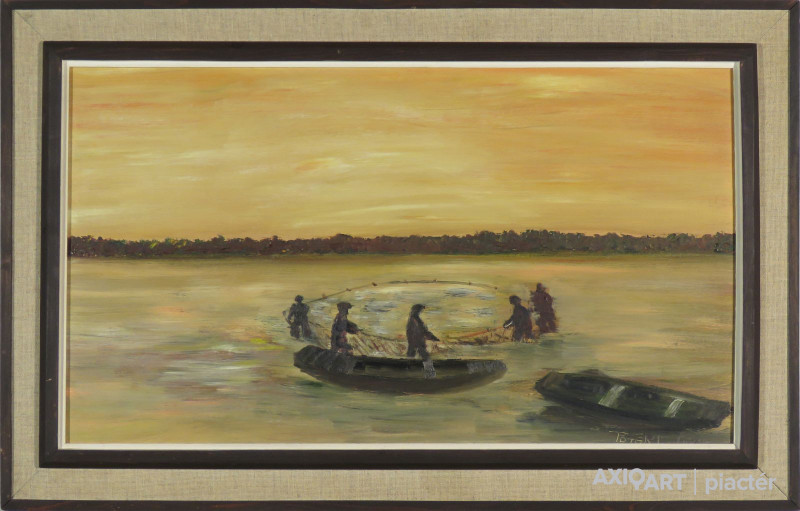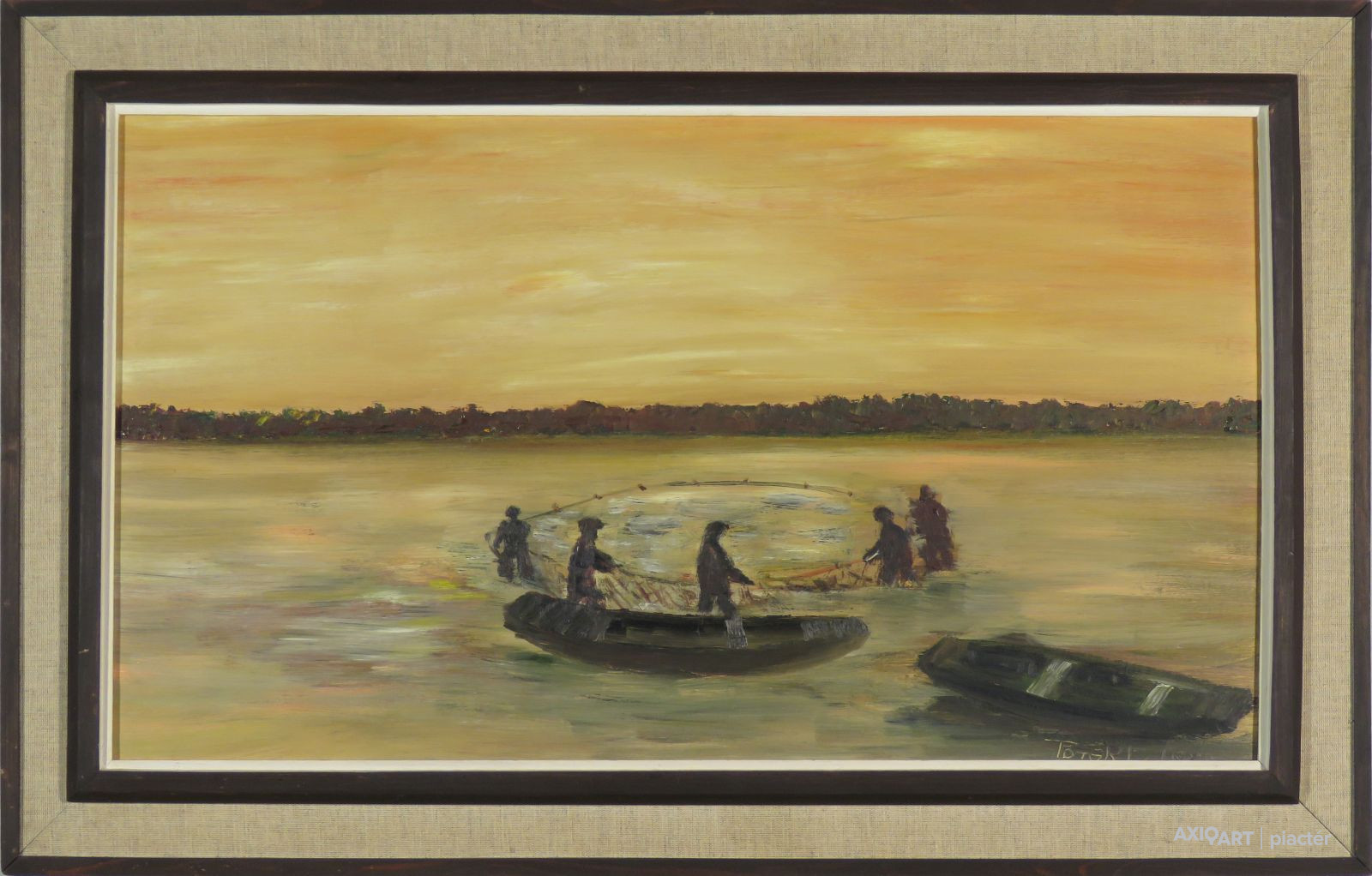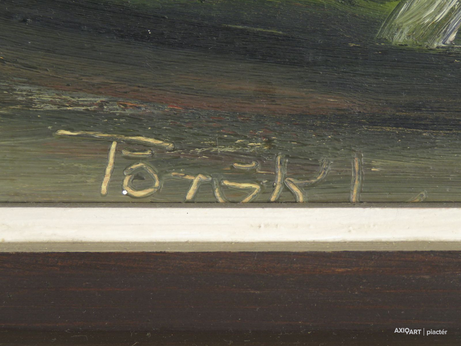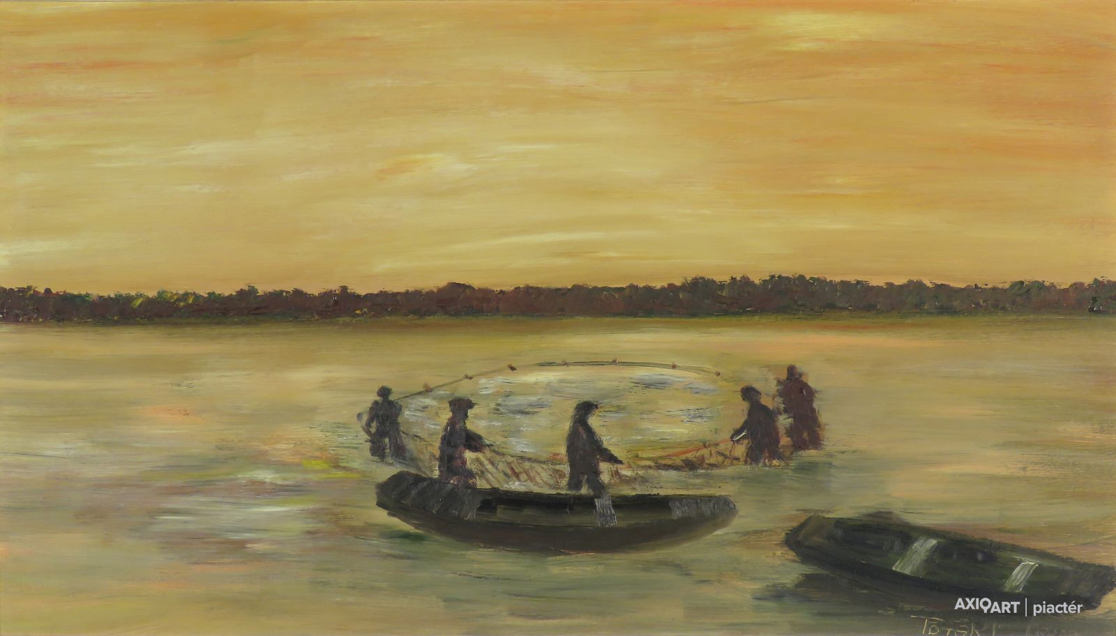 [FK3264/FL-4] A kép mérete: 31,5 x 70,5 cm keret nélkül. Készült: Olaj, tempera, Farostlemez A kép Kurucz D. István (Hódmezővásárhely, 1914, Budapest, 1996) alkotása. Jelezve Jobbra lent "Kurucz 977" A festmény jó állapotban van. Keret: Ép A festmény hátoldalán a Képcsarnokvállalat raglapja látható. Magyar festők és grafikusok életrajzi lexikona I-II. Festő, grafikus. Vásárhelyről, ahol Darvasy István festőművész figyelt fel tehetségére, került Szőnyi István magániskolájába. A fővárosi Képzőművészeti Főiskolának, ahol Rudnay Gyula, Réti István, Benkhard Ágost, Szőnyi István voltak a tanítómesterei 1940-ig volt a tanítványa. A monumentális festészetet Nagy Sándor tanította. Tanulmányúton járt több kelet- és nyugat-európai államban, Mongóliában, Japánban, Algériában. 1940-ben Hódmezővásárhelyen telepedett le, 1943-1947 között bekapcsolódott szülővárosa művészeti és közéletébe. A Vásárhely Népe c. lap munkatársa volt. 1949-59 között Szőnyi tanársegédjeként freskótechnikát tanított a főiskolán. 1951-52-ben megszervezte a Honvédségi Képzőművészeti Stúdiót, majd kinevezték a Honvéd Képzőművészeti Iskola igazgatójának. A vásárhelyi iskola reprezentáns egyéniségeként jelentős szerepe volt a Vásárhelyi Őszi Tárlatok elindításában. Megszervezete és vezette a Mednyánszky Társaságot, s haláláig művészeti vezetője volt a Hajdúböszörményi Nemzetközi Művésztelepnek. Évekig elnöke volt a Hortobágyi Alkotótábornak. Az alföldi parasztok életét megörökítő képei a falképek összefoglaló stílusában a népi realizmus és a dekoratív sommázás szellemében készültek. Számos falképet festett (Kossuth Akadémia, hódmezővásárhelyi iskola, stb.). 1941-től számos kisebb-nagyobb egyéni kiállítása volt, bemutatkozott több hazai és külhoni városban. 1941-től minden jelentősebb országos rendezvény és a magyar művészek külföldi bemutatóinak résztvevője. Rendszeresen szerepelt a Vásárhelyi Őszi Tárlatokon, a Hatvani Tájkép és Portrébiennálékon, a Szegedi Nyári Tárlatokon. Képei bemutatásra kerültek a vásárhelyi iskola jubileumi rendezvényein. 1962-ben több alkotásával szerepelt a Velencei Biennálén. Díjak: SZOT-díj, Munkácsy-díj, Érdemes és Kiváló Művész kitüntetés, Tornyai-plakett, római ösztöndíj, a Munka Érdemrend arany fokozata, Káplár Miklós-díj és emlékplakett, Kossuth-díj. Művei megtalálhatók minden jelentősebb hazai, több olasz és japán közgyűjteményben. (ML, D.J.: Műv. 1985/5, Tasnádi Attila adatközlése nyomán, L.L.: Műv. 1983/3) Magyar festők és grafikusok életrajzi lexikona I-II. Műgyűjtők és kereskedők kézikönyve Festő, grafikus. Vásárhelyről, ahol Darvasy István festőművész figyelt fel tehetségére, került Szőnyi István magániskolájába. A fővárosi Képzőművészeti Főiskolának, ahol Rudnay Gyula, Réti István, Benkhard Ágost, Szőnyi István voltak a tanítómesterei 1941-ig volt a növendéke. A monumentális festészetet Nagy Sándor tanította. Egy ideig tanársegédként működött Szőnyi mellett. Több ízben járt Itáliában tanulmányúton. Évekig művészeti vezetője volt a Hajdúböszörményi Nemzetközi Művésztelepnek. Az alföldi parasztok életét megörökítő képei a falképek összefoglaló stílusában a népi realizmus és a dekoratív sommázás szellemében készülnek. A II. világháború alatt szerepet vállalt a Szocialista Képzőművészek Csoportjának akcióiban. 1949-1960 k. a Képzőművészeti Főiskola falképtanszékének tanára volt. Több falképet festett (Kossuth Akadémia, hódmezővásárhelyi iskola, stb.). 1962-ben több alkotásával szerepelt a Velencei Biennálén, SZOT-díjas, Munkácsy-díjas, érdemes és kiváló művész kitüntető elismerésében részesült. (ML, D.J.: Műv.-1985/5, L.L: Műv.-1983/3) Magyar festők és grafikusok adattára Tanulmányait a Képzőművészeti Főiskolán végezte, ahol Rudnay Gyula és Réti István voltak a mesterei. 1941-1943-ban ösztöndíjas Rómában. 1943-1947 között Hódmezővásárhelyen dolgozik, egyidejűleg a Vásárhelyi Hétfő c. hetilap szerkesztője. 1949-1960 közötti években a budapesti Képzőművészeti Főiskola freskó tanszékének tanára. Az 1940-es évek eleje óta kiállító művész. 1962-ben a Velencei Biennálén állították ki műveit. 1970-ben Csók István Galériában volt kiállítása. A Vásárhelyi Őszi Tárlatok és a Szegedi Nyári Tárlatok rendszeres kiállító művésze. Az alföldi festészet egyéni hangú továbbfejlesztője. Táblaképeket, freskókat és kerámia falképeket alkot. Munkácsy-díjas, érdemes és kiváló művész kitüntető elismerésében részesült. A SZOT a legelső képzőművészek közt, 1962-ben tüntette ki díjával. A 70. születésnapját ünneplő művész 1984 decemberében életmű kiállítást rendezett műveiből a hódmezővásárhelyi Tornyai János Múzeumban. 1986-ban a budapesti Hollósy Galériában nyílt kiállítása. - Irod.: Szij Rezső: Kurucz Dezső István festőművész. Bp. 1967.; Kulcsár Ödön: SZOT-díjasok. Bp., 1981.; Lóska Lajos: Mindig freskót szerettem volna festeni. Beszélgetés Kurucz Dezső Istvánnal. Művészet, 1984. 3. Művészeti lexikon I-IV. Festő, Munkácsy-díjas. A Képzőművészeti Főiskolán Rudnay Gyula, Réti István, Benkhard Ágost, Szőnyi István növendéke volt 1934-40 között. Több ízben járt külföldi tanulmányúton. Az alföldi parasztok életét megörökítő képei a falképek összefoglaló stílusában a népi realizmus és a dekoratív sommázás szellemében készülnek. 1949-60 között a Képzőművészeti Főiskola falképtanszékének tanára volt. Több falképet festett (Kossuth Akadémia; Hódmezővásárhely, iskola, pápai pártház, 1965). Legutóbb 195