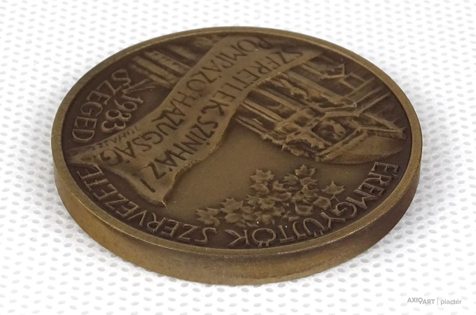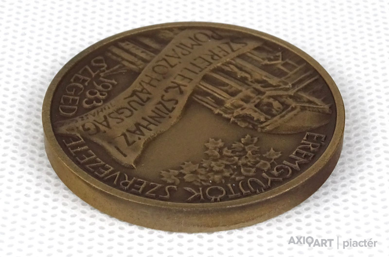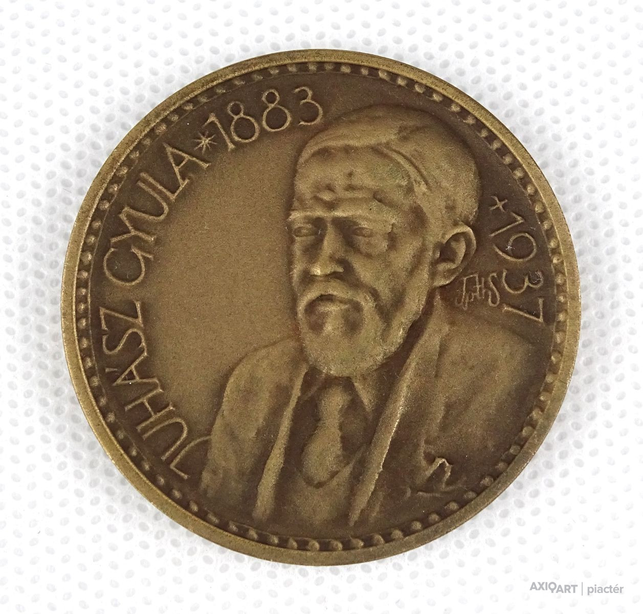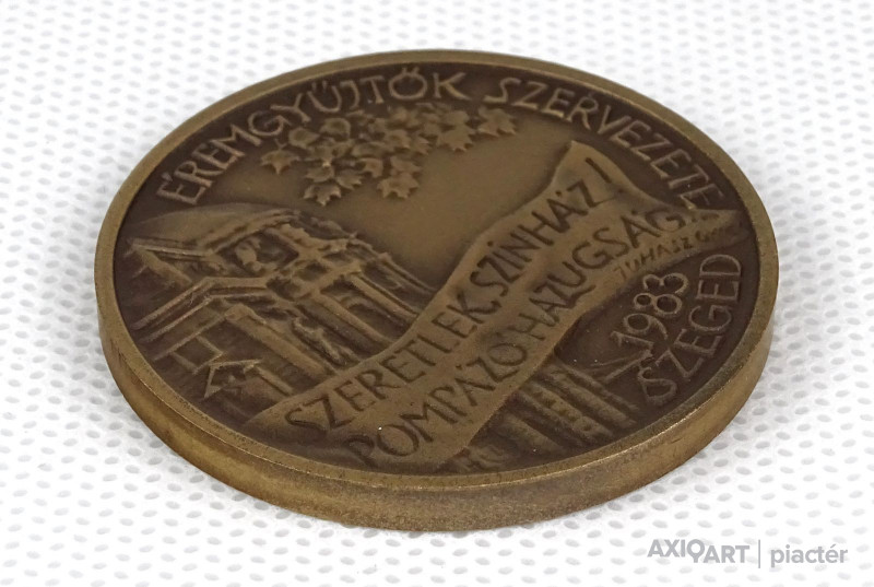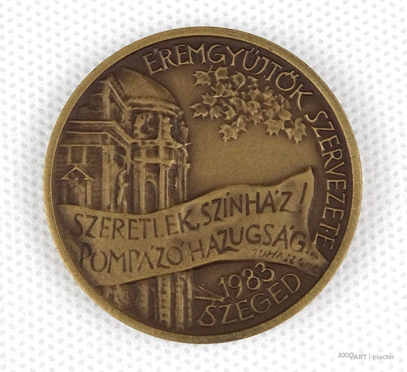 [1L408/FSZ] Kétoldalas bronz plakett, emlékplakett. Egyik oldalán Juhász Gyula portré, mellette felirat: JUHÁSZ GYULA 1883-1937 Jelzés: TÓTH S. Másik oldalán a színház épülete, mellette felirat: SZERETLEK, SZÍNHÁZ! POMPÁZÓ HAZUGSÁG... JUHÁSZ GYULA ÉREMGYŰJTŐK SZERVEZETE 1983 SZEGED Szélesség: 4.3 cm Súly: 0.04 kg Tóth Sándor (1933) szobrász szobrász Miskolc, 1933-03-19 Szerző: Matits Ferenc 1951-1959: Magyar Képzőművészeti Főiskola, mesterei: Hincz Gyula, Pap Gyula, Barcsay Jenő, Kisfaludi Strobl Zsigmond. 1959-ben a művészeti főiskolák Tanácsköztársasági Pályázatának nagydíját nyerte el. 1959-1960-ban a Művészeti Alap ösztöndíjával a hódmezővásárhelyi telepen alkotott. 1961-ben Szegeden telepedett le és 1974-ig a Művészeti Gimnázium tanára. Ezt követően Nyíregyházán kapott műtermet, ahol alkotótevékenysége mellett eredményes szakköröket vezetett. Egy évtizedig volt a szabolcsi művészek szervezetének titkára. Számos szegedi és nyíregyházi szobrászművészt indított el a pályán. 1977-ben kezdeményezte a Nyíregyháza-sóstói Nemzetközi Éremművészeti és Kisplasztikai Alkotótelep alapítását, az Alkotótelepi Tanácsnak indulástól fogva tagja. Főiskolás éveiben 1954-től nyaranta a hódmezővásárhelyi, 1969-ben a zsennyei, 1971-1975 között a villányi, 1973-ban a kecskeméti és oronskói (PL), 1974-1976 között, 1983-ban, 1985-ben, 1991-ben a nyíregyháza-sóstói, 1975-ben a burgaszi (BG), 1976-ban a potsdami (Német Demokratikus Köztársaság) és a zamosci (PL); 1977-ben a rzeszówi (PL), 1988-ban a palangai (Litvánia), a dzintari-i (Lettország) és a zsdennyevoni (UA), 1988-ban a körmöcbányai, 1992-ben a klaipédai (Litvánia) művésztelepen dolgozott. Eredményes munkásságát számos elismerés jelzi: 1962: Szegedi Nyári Tárlat III. díja; 1963: Szegedi Nyári Tárlat II. díja; 1964: Alföldi Tárlat díja, Gyula; 1968: Szegedi Nyári Tárlat díja; 1969: Szocialista Kultúráért; 1970: Békéscsabai Alföldi Tárlat Nívódíja; 1972: Szegedi Nyári Tárlat díja; Szabadka Város díja; 1973: Békéscsabai Alföldi Tárlat Munkácsy Emlékérme; 1974: Firenzei Giorgio Vasari Nemzetközi Éremverseny 3. díja; 1975: Felszabadulási Pályázat III. díja, Hódmezővásárhely; 1982: Munkácsy-díj; 1984: Szegedi Nyári Tárlat díja; 1986: a Magyar Éremgyűjtők Egyesülete az év legszebb egyesületi érme kitüntetése; 1989: Iserlohn Város díja; 1991: VI. Pál pápa ezüst Emlékérme; 1995: Ravenna Város Aranyérme; 1996: Hatvani Portré Biennálé díja; 1997: Hadtörténeti Múzem Kiállítási díja; Szeged Megyei Jogú Város Polgármesteri Hivatala díja. Az 1986-1987-es tanévben az Egri Tanárképző Főiskola tanszékvezető főiskolai tanára volt. Első kiállításain a szobrászati alkotások mellett festmények és rajzok is helyt kaptak. Rézlemez-domborításai és kisplasztikái témáit leginkább családja életéből vette. Realista stílusú – ritkán absztrakt felfogású (Madarak és halak sorozat, 1972) – alkotásai leggyakrabban bronzból készülnek, de jól bánik más anyagokkal is. Korábban gyakran készített terrakotta, mészkő-, márvány- és faszobrokat. Számos köztéri munkát készített, melyek között emléktáblák, emlékművek, büsztök, önálló térplasztikák sorakoznak. Legmonumentálisabb alkotásaként tarjuk számon a máriapócsi Bazilita templom kapuját. Vert és öntött érmeket is készít. Jelentős emlékérmeinek és orvosi vonatkozású érmeinek száma. Irodalom SZELESI Z.: Alföldi művészek között, ~ rézdomborításai, Tiszatáj, 1965/2. PAPP L.: Szobrok és gondolatok, ~ kiállítása a Képcsarnokban, Tiszatáj, 1966 VÉGVÁRI L.: (kat. bev., Herman Ottó Múzeum, Miskolc, 1976) VÉGVÁRI L.: (kat. bev., Lévay J. Könyvtár, Miskolc, 1982) BÓNA E.: ~ szobrászművész vert érmei, Szabolcs-Szatmári Szemle, 1982/2. VÉGVÁRI L.: ~ érmei 1953-1986, Nyírbátor, 1986 TÓTH A.: A mesterség dicsérete, ~ szobrász 60 éves, Szabolcs-Szatmár-Bereg Megyei Szemle, 1993/3. MATITS F.: A 65 éves ~ köszöntése, Szabolcs-Szatmár-Bereg Megyei Szemle, 1998/9. Egyéni kiállítások Egyéni kiállítások 1966 • Képcsarnok, Szeged (kat.) • József Attila Múzeum, Makó (kat.) 1972 • Móra Ferenc Múzeum Képtára, Szeged (kat.) 1977 • Benczúr Terem, Nyíregyháza (kat.) 1980 • Ady Endre Művelődési Központ, Kisvárda 1983 • Jósa András Múzeum, Nyíregyháza (kat.) • Somogyi Könyvtár, Szeged • Balatoni Galéria, Balatonfüred (kat.) 1989 • Galerie des Parktheaters, Iserlohn (Német Szövetségi Köztársaság) • Móra Ferenc Múzeum Fekete Ház, Szeged (kat.) 1992 • Déri Múzeum, Debrecen (kat.) 1994 • Kainuun M., Kajaani (FIN) • POST-FIDEM Kiállítás, Városi Galéria [Győrfi Sándorral], Nyíregyháza (kat.) • Hungarian Rhapsody, Amerikai Numizmatikai Múzeum, Colorado Springs (USA) 1996 • Hatvani Galéria [Pintér Józseffel], Hatvan • Vay Ádám Múzeum, Vaja • Városi Galéria [Csizmadia Zoltánnal], Nyíregyháza (kat.) • Móra Ferenc Múzeum Képtára, Szeged 1997 • Európa napi kiállítás, Városi Galéria, Nyíregyháza 2000 • Miskolci Galéria, Miskolc. Válogatott csoportos kiállítások Válogatott csoportos kiállítások 1962, 1965 • 9., 10. Magyar Képzőművészeti kiállítás, Műcsarnok, Budapest 1967, 1968 • Szegedi Képzőművészek Kiállítása, Szabadka, Újvidék 1970 • Alföldi művészek kiállítása, Berlin • Frankfurt • Odessza 1978 • Magyar szobrászat, Műcsarnok, Budapest 1979 • Magyar Éremművészek Tárlata, Helsinki • Stockholm • Párizs 1985 • A művészet szolgálatában, A megyei képzőművészeti gyűjtemények 40 éve, Magyar Nemzeti Galéria, Budapest 1991 • Szegedi Szépmíves Céh Tárlata, József Attila Tudományegyetem Au