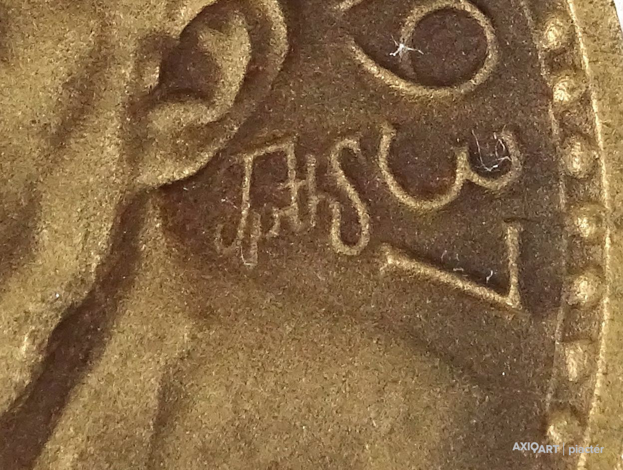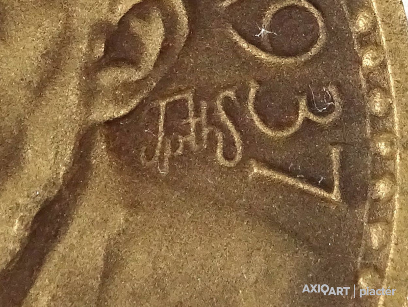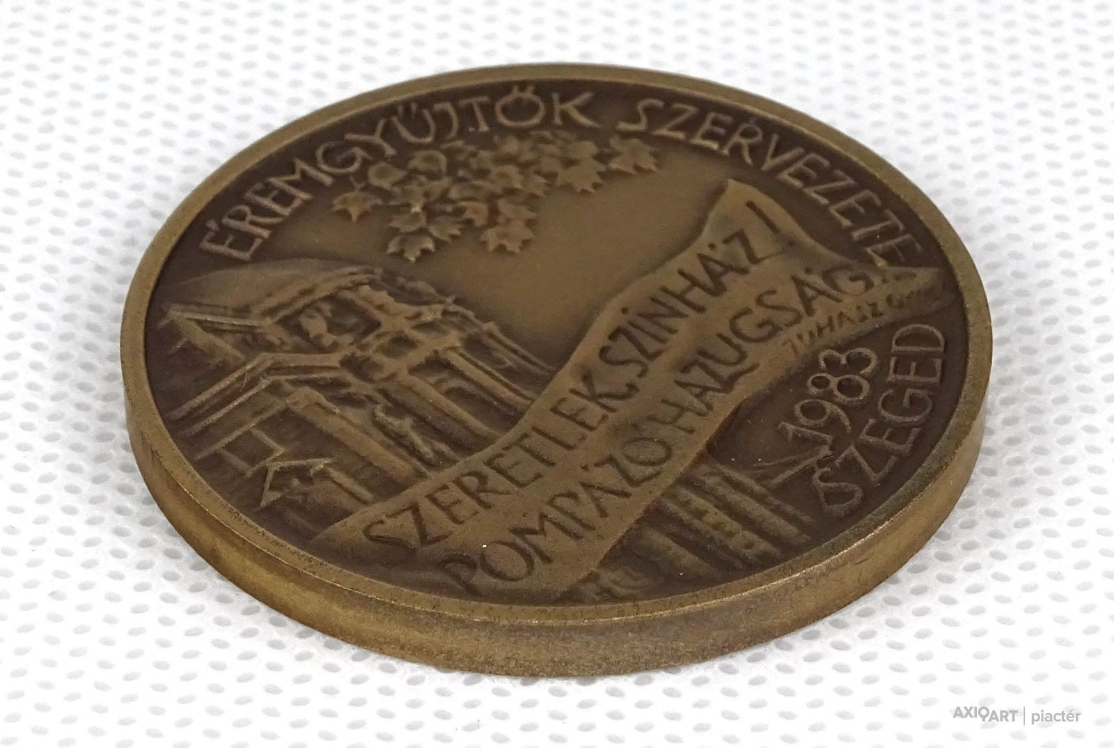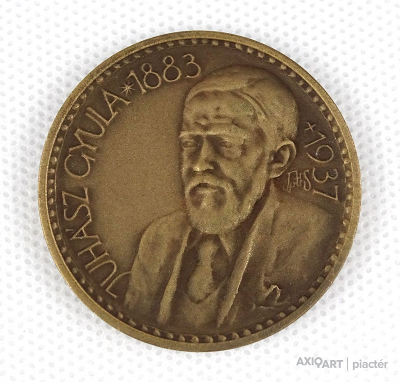[1L408/FSZ] Kétoldalas bronz plakett, emlékplakett. Egyik oldalán Juhász Gyula portré, mellette felirat: JUHÁSZ GYULA 1883-1937 Jelzés: TÓTH S. Másik oldalán a színház épülete, mellette felirat: SZERETLEK, SZÍNHÁZ! POMPÁZÓ HAZUGSÁG... JUHÁSZ GYULA ÉREMGYŰJTŐK SZERVEZETE 1983 SZEGED Szélesség: 4.3 cm Súly: 0.04 kg Tóth Sándor (1933) szobrász szobrász Miskolc, 1933-03-19 Szerző: Matits Ferenc 1951-1959: Magyar Képzőművészeti Főiskola, mesterei: Hincz Gyula, Pap Gyula, Barcsay Jenő, Kisfaludi Strobl Zsigmond. 1959-ben a művészeti főiskolák Tanácsköztársasági Pályázatának nagydíját nyerte el. 1959-1960-ban a Művészeti Alap ösztöndíjával a hódmezővásárhelyi telepen alkotott. 1961-ben Szegeden telepedett le és 1974-ig a Művészeti Gimnázium tanára. Ezt követően Nyíregyházán kapott műtermet, ahol alkotótevékenysége mellett eredményes szakköröket vezetett. Egy évtizedig volt a szabolcsi művészek szervezetének titkára. Számos szegedi és nyíregyházi szobrászművészt indított el a pályán. 1977-ben kezdeményezte a Nyíregyháza-sóstói Nemzetközi Éremművészeti és Kisplasztikai Alkotótelep alapítását, az Alkotótelepi Tanácsnak indulástól fogva tagja. Főiskolás éveiben 1954-től nyaranta a hódmezővásárhelyi, 1969-ben a zsennyei, 1971-1975 között a villányi, 1973-ban a kecskeméti és oronskói (PL), 1974-1976 között, 1983-ban, 1985-ben, 1991-ben a nyíregyháza-sóstói, 1975-ben a burgaszi (BG), 1976-ban a potsdami (Német Demokratikus Köztársaság) és a zamosci (PL); 1977-ben a rzeszówi (PL), 1988-ban a palangai (Litvánia), a dzintari-i (Lettország) és a zsdennyevoni (UA), 1988-ban a körmöcbányai, 1992-ben a klaipédai (Litvánia) művésztelepen dolgozott. Eredményes munkásságát számos elismerés jelzi: 1962: Szegedi Nyári Tárlat III. díja; 1963: Szegedi Nyári Tárlat II. díja; 1964: Alföldi Tárlat díja, Gyula; 1968: Szegedi Nyári Tárlat díja; 1969: Szocialista Kultúráért; 1970: Békéscsabai Alföldi Tárlat Nívódíja; 1972: Szegedi Nyári Tárlat díja; Szabadka Város díja; 1973: Békéscsabai Alföldi Tárlat Munkácsy Emlékérme; 1974: Firenzei Giorgio Vasari Nemzetközi Éremverseny 3. díja; 1975: Felszabadulási Pályázat III. díja, Hódmezővásárhely; 1982: Munkácsy-díj; 1984: Szegedi Nyári Tárlat díja; 1986: a Magyar Éremgyűjtők Egyesülete az év legszebb egyesületi érme kitüntetése; 1989: Iserlohn Város díja; 1991: VI. Pál pápa ezüst Emlékérme; 1995: Ravenna Város Aranyérme; 1996: Hatvani Portré Biennálé díja; 1997: Hadtörténeti Múzem Kiállítási díja; Szeged Megyei Jogú Város Polgármesteri Hivatala díja. Az 1986-1987-es tanévben az Egri Tanárképző Főiskola tanszékvezető főiskolai tanára volt. Első kiállításain a szobrászati alkotások mellett festmények és rajzok is helyt kaptak. Rézlemez-domborításai és kisplasztikái témáit leginkább családja életéből vette. Realista stílusú – ritkán absztrakt felfogású (Madarak és halak sorozat, 1972) – alkotásai leggyakrabban bronzból készülnek, de jól bánik más anyagokkal is. Korábban gyakran készített terrakotta, mészkő-, márvány- és faszobrokat. Számos köztéri munkát készített, melyek között emléktáblák, emlékművek, büsztök, önálló térplasztikák sorakoznak. Legmonumentálisabb alkotásaként tarjuk számon a máriapócsi Bazilita templom kapuját. Vert és öntött érmeket is készít. Jelentős emlékérmeinek és orvosi vonatkozású érmeinek száma. Irodalom SZELESI Z.: Alföldi művészek között, ~ rézdomborításai, Tiszatáj, 1965/2. PAPP L.: Szobrok és gondolatok, ~ kiállítása a Képcsarnokban, Tiszatáj, 1966 VÉGVÁRI L.: (kat. bev., Herman Ottó Múzeum, Miskolc, 1976) VÉGVÁRI L.: (kat. bev., Lévay J. Könyvtár, Miskolc, 1982) BÓNA E.: ~ szobrászművész vert érmei, Szabolcs-Szatmári Szemle, 1982/2. VÉGVÁRI L.: ~ érmei 1953-1986, Nyírbátor, 1986 TÓTH A.: A mesterség dicsérete, ~ szobrász 60 éves, Szabolcs-Szatmár-Bereg Megyei Szemle, 1993/3. MATITS F.: A 65 éves ~ köszöntése, Szabolcs-Szatmár-Bereg Megyei Szemle, 1998/9. Egyéni kiállítások Egyéni kiállítások 1966 • Képcsarnok, Szeged (kat.) • József Attila Múzeum, Makó (kat.) 1972 • Móra Ferenc Múzeum Képtára, Szeged (kat.) 1977 • Benczúr Terem, Nyíregyháza (kat.) 1980 • Ady Endre Művelődési Központ, Kisvárda 1983 • Jósa András Múzeum, Nyíregyháza (kat.) • Somogyi Könyvtár, Szeged • Balatoni Galéria, Balatonfüred (kat.) 1989 • Galerie des Parktheaters, Iserlohn (Német Szövetségi Köztársaság) • Móra Ferenc Múzeum Fekete Ház, Szeged (kat.) 1992 • Déri Múzeum, Debrecen (kat.) 1994 • Kainuun M., Kajaani (FIN) • POST-FIDEM Kiállítás, Városi Galéria [Győrfi Sándorral], Nyíregyháza (kat.) • Hungarian Rhapsody, Amerikai Numizmatikai Múzeum, Colorado Springs (USA) 1996 • Hatvani Galéria [Pintér Józseffel], Hatvan • Vay Ádám Múzeum, Vaja • Városi Galéria [Csizmadia Zoltánnal], Nyíregyháza (kat.) • Móra Ferenc Múzeum Képtára, Szeged 1997 • Európa napi kiállítás, Városi Galéria, Nyíregyháza 2000 • Miskolci Galéria, Miskolc. Válogatott csoportos kiállítások Válogatott csoportos kiállítások 1962, 1965 • 9., 10. Magyar Képzőművészeti kiállítás, Műcsarnok, Budapest 1967, 1968 • Szegedi Képzőművészek Kiállítása, Szabadka, Újvidék 1970 • Alföldi művészek kiállítása, Berlin • Frankfurt • Odessza 1978 • Magyar szobrászat, Műcsarnok, Budapest 1979 • Magyar Éremművészek Tárlata, Helsinki • Stockholm • Párizs 1985 • A művészet szolgálatában, A megyei képzőművészeti gyűjtemények 40 éve, Magyar Nemzeti Galéria, Budapest 1991 • Szegedi Szépmíves Céh Tárlata, József Attila Tudományegyetem Au
