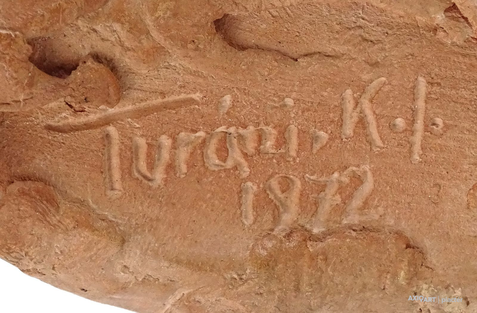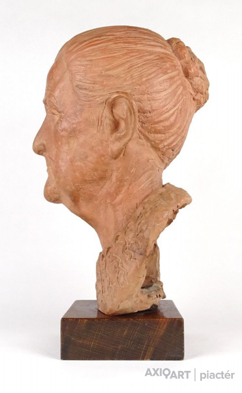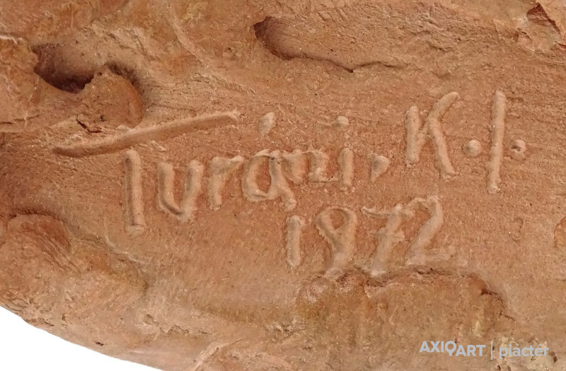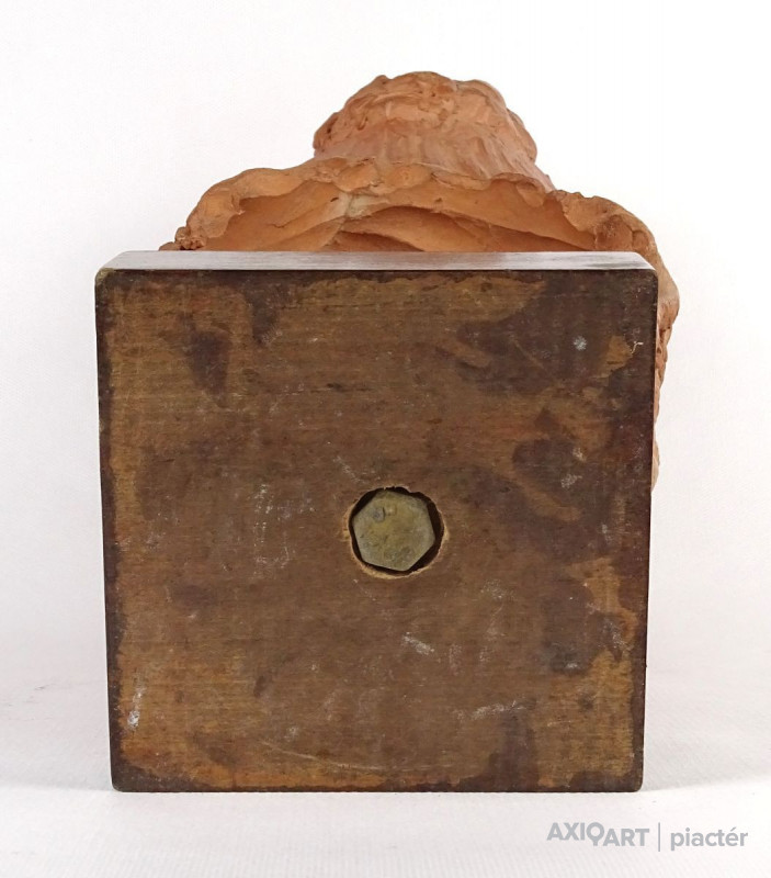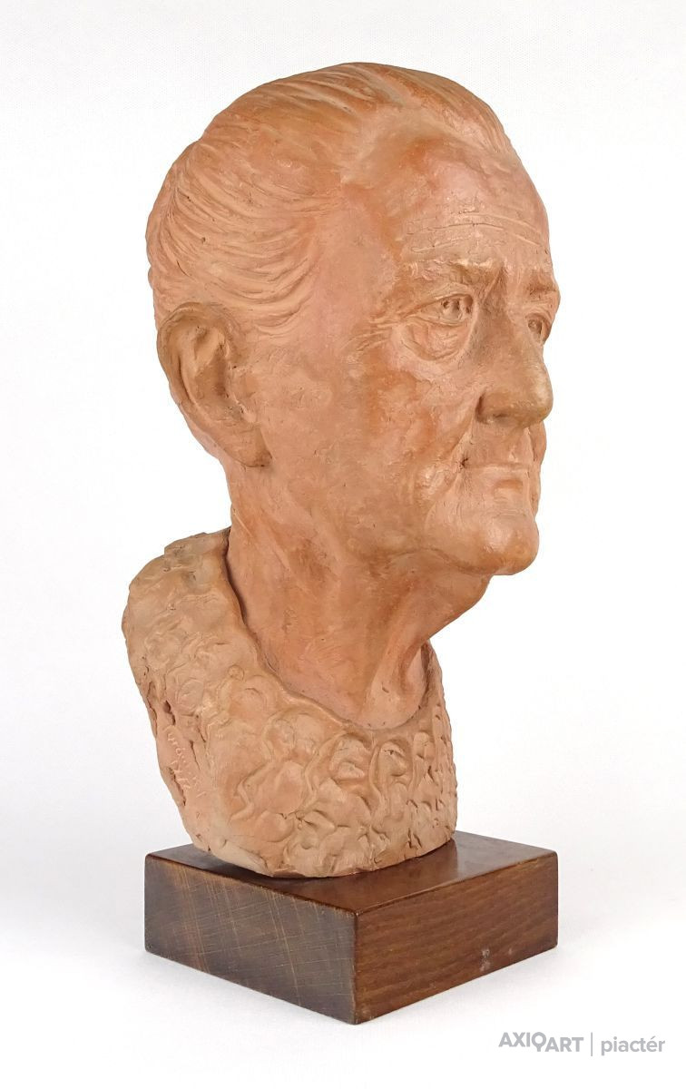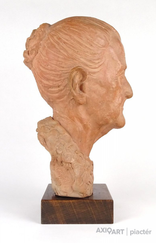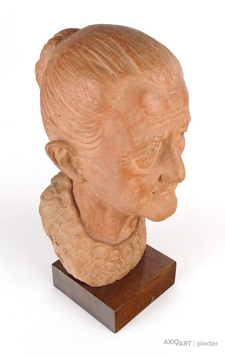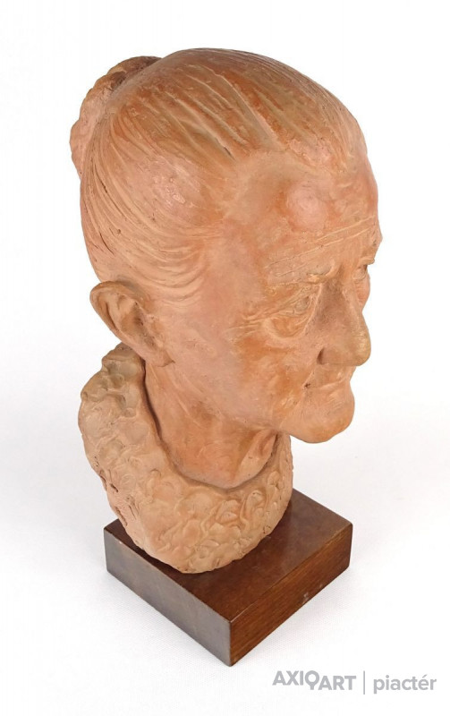 [1P675/X311] Fa talapzaton álló jelzett idős női fej, terrakotta mellszobor, büszt. Oldalán datált jelzés: TURÁNI K.I. 1972 Magasság: 35.5 cm Szélesség: 16.5 cm Súly: 2.475 kg Turáni Kovács Imre szobrász Budapest, 1910-08-31  Elhalálozott: Budapest, 1975. június 16. Először Frim Jenő díszítőszobrász üzemében tanult három évig. 1933-39: Magyar Képzőművészeti Főiskola, mestere: Sidló Ferenc. 1938-41: Sidló Ferenc tanársegédje volt a Magyar Képzőművészeti Főiskolán. 1942: Római Akadémia ösztöndíja. Irodalom GÁDOR E. (szerk.): Budapest szobrai, Budapest, 1955. Válogatott csoportos kiállítások Válogatott csoportos kiállítások 1931-től vett részt a Műcsarnok kiállításain. Forrás: artportal.hu