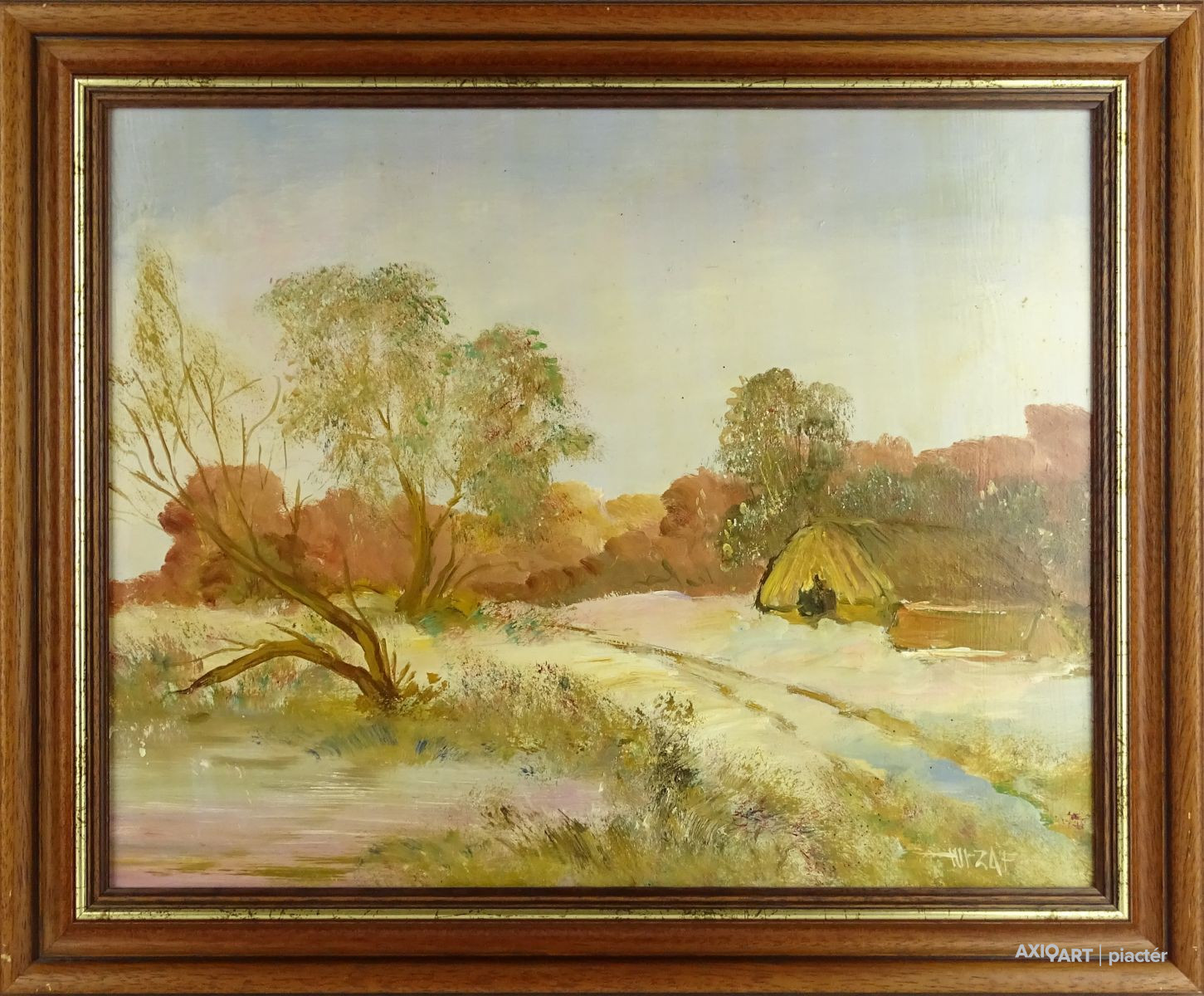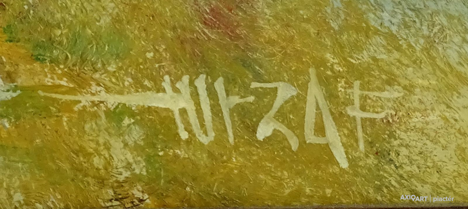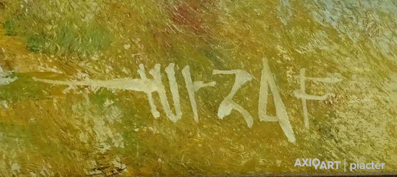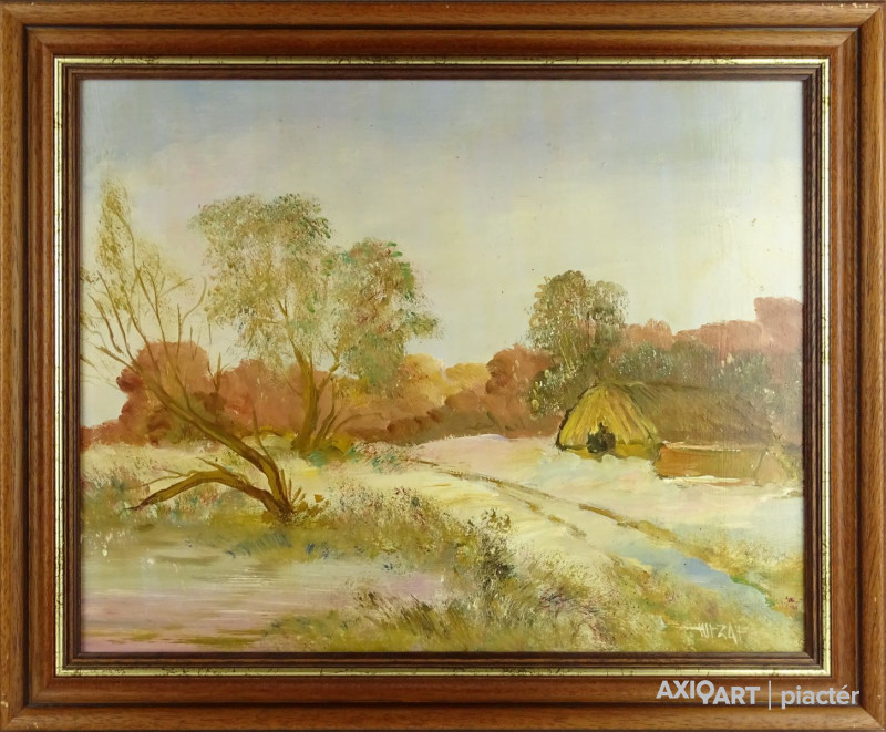 [1H217/037] Havas táj kunyhóval olaj farost festmény barna keretben. Azonnal falra akasztható, ajándékozható állapotban. Jelzés jobbra lent: TURZA F Magasság: 51 cm Szélesség: 60.5 cm Súly: 1.45 kg TURZA FERENC Önéletrajz „Születtem Újszászon a II. világháború végén 1945. február 14-én. Gyermekéveimet is itt töltöttem, itt jártam általános iskolába. Szabad óráimban és az iskolai szünetek idején mindig a Zagyva és a Tápió környékén tartózkodtam pajtásaimmal. Az volt nekünk a játszótér, a focipálya, strand és mindenféle szórakozás színhelye. A nagyerdő is idetartozott, szinte minden fáját ismertem, bejártam minden zugát. Szüleim, nagyszüleim korán megtanítottak a fizikai munkára is. Kinn a földeken gyakran akadt gyerekre szabott mezőgazdasági munka, kapáltam, „markot” szedtem, kévét hordtam, kukoricát törtem stb. Természetesen volt közben időm gyönyörködni a csodálatos természetben. A felhő-virágos égbolt, a messzenyúló délibábos rét, a madarak csicsergése, a folyó csobogása: meghatározó élményeim. Végig eminens tanuló voltam. 4-5. osztályos koromban kezdtem járn a folyópartra rajzolni, festeni. Rajztanárunk (Paál András) szakkört szervezett a jól rajzoló gyerekek okítására. Ő szerette a művészetet (művelte is), és a gyerekeknek így élmény volt vele minden kirándulás. Nyolcan-tízen kiültünk a folyópartra vagy az erdőszélre, és vízfestékkel festettünk. Ebben az időszakban szerettem meg a festészetet. Később már egyedül jártam ceruzával, papírral, vízfestékkel a vidéket. Mára elmondhatom: kevés hely van az országban, ahol nem festettem. Különösen érvényes ez az Alföldre. Elsősorban autodidakta vagyok, mert mindig azt vallottam, nincs édesebb gyümölcs annál, amit kitartó, kemény munkával szerzünk meg. Így a tanulás ideje tovább tart, de biztosabb lehet bennünk, amit így sajátítottunk el. Mesternél is tanultam: azért ez elengedhetetlen. Szolnokon három évig Baranyó Sándornál és egy évig Budapesten Vessely Tibor művésznél. Első komoly, hivatalos megrendeléseimet is ez utóbbinak köszönhetem. Témáim elsősorban az ember és a táj, a természet együtt pedig a legvonzóbb a számomra. 8-10 órát festek naponta, és nincs megállás sem vasárnap, sem ünnepnap. Kivételes események (pl. betegség, utazás) persze letetethetik velem az ecsetet. Ez az iram tűnhet megfeszítőnek, az is lenne, ha nem imádnék festeni. Minden fehér vászon vagy lemez egy-egy kihívás, a vászon nagy fehér ürességében megfesteni egy emberi arcot, egy játszó gyereket, csobogó vizes folyókanyart, fodrozó felhős nyári égbolt alá egy virágos mezőt, benne legelésző lóval vagy tehénnel! Mindez: a semmiből létrehozni valamit, ami szinte él, hasonlít a teremtéshez...” Részletek a Mi Írtuk című diákújságból (Újszász, Vörösmarty Mihály Általános Iskola) 1993. november-december 2. oldal (Riport általános iskolás gyerekekkel, alapítvány létrehozása kapcsán)   Forrás: https://ujszasz.hu/kultura/muveszek/1913-turza-ferenc