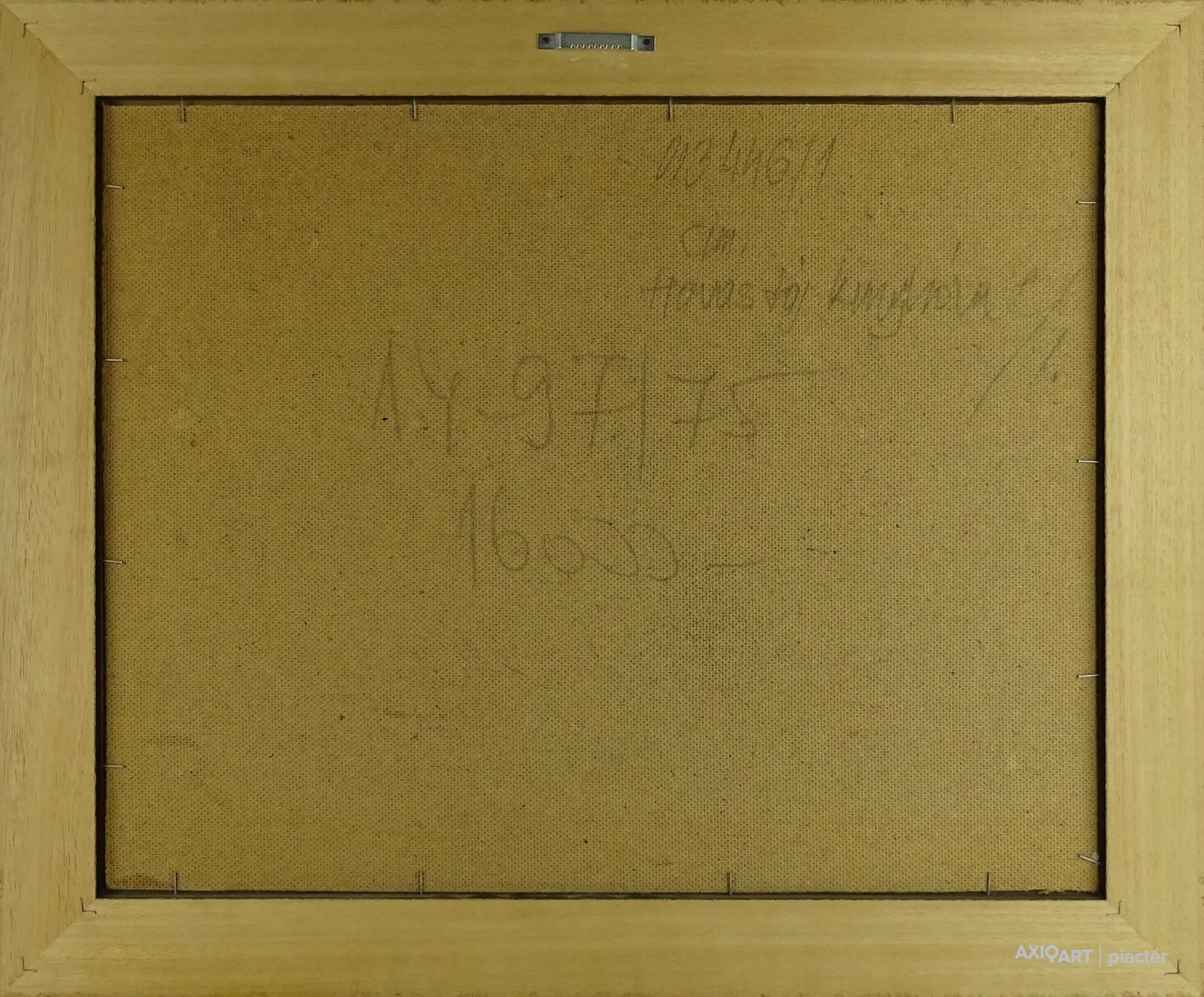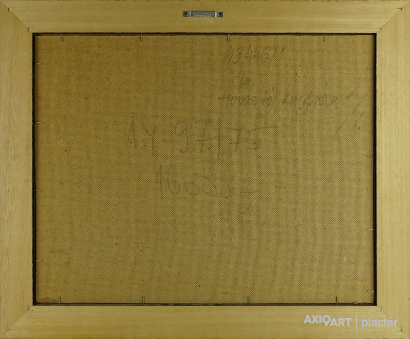 [FK0037/Z018] A kép mérete: 50 x 70 cm keret nélkül. Készült: Olaj, Vászon A kép Paizs László (Szentpéterúr, 1935) alkotása. Jelezve Jobbra lent "P. L." A festmény jó állapotban van. Keret: Ép A festmény hátoldalán a Képcsarnokvállalat címkéje található. Magyar festők és grafikusok életrajzi lexikona I-II. Festő. Tanulmányait a budapesti Iparművészeti Főiskolán végezte 1959-ben. Z. Gács György, Rákosy Zoltán és Szentiványi Lajos növendéke volt. A '60-as évek első felében hagyományosabb felfogású olajképeket festett, mozaikokat, freskókat, utóbb a pop-art körébe tartozó, a francia Arman munkáival rokon műveket alkotott. 1961 óta kiállító művész. Egyéni (Fényes Adolf Terem, Csók Galéria, Műcsarnok, Magyar Nemzeti Galéria, Halászbástya, Bástya Galéria, Vigadó Galéria, Budapest Galéria, Győr, Szombathely, Szeged, Zalaegerszeg, Duisburg, Aix-en-Provence, stb). és vegyes (Ernst Múzeum, Műcsarnok, Óbuda Galéria, Magyar Nemzeti Galéria, Csók Galéria, Vigadó Galéria, Székesfehérvár, Kaposvár, Pécs, Hódmezővásárhely, Firenze, Milano, Padova, Nápoly, Velence, Düsseldorf, Aachen, Genf, stb) tárlatokon vett részt. 1980-ban Munkácsy-díjjal jutalmazták, 1988-ban Érdemes Művész kitüntető elismerésben részesült. Munkáit őrzi a Magyar Nemzeti Galéria, a Fővárosi Képtár, a szombathelyi képtár, a pécsi Janus P. Múzeum, a székesfehérvári István Király Múzeum és a dunaszerdahelyi Kortárs Magyar Galéria. (H.B.: Műv, 1972/4, K.Gy.: Műv. 1977/2, K.G.: Műv. 1978/10, M.L.: Műv, 1983/5, R.G.: Műv, 1987/9, Sz.Gy.: Új Műv. 1995/4, MK) Magyar festők és grafikusok életrajzi lexikona I-II. Műgyűjtők és kereskedők kézikönyve Festő. Tanulmányait a bp.-i Iparművészeti Főiskolán végezte. Mozaikokat ferskókat, utóbb a pop-art körébe tartozó, a francia Arman műveivel rokon műveket alkotott. Mozaikok: a Szegedi Megyei Tanács, a Pécsi Óvoda, a Gödöllői Agrártudományi Egyetem. Freskók: Budapest - Csatárka úti Gyermekotthon. 1971-ben a Fényes Adolf Teremben volt kiállítása, 1983-ban pedig a szegedi Móra Ferenc Múzeumban nagyszabású tárlatokon mutatta be munkáit. 1988-ban érdemes művész kitüntető elismerésben részesült. (MK) Magyar festők és grafikusok adattára Az Iparművészeti Főiskolán végzett 1959-ben. Mozaikokat (Szeged, Megyei Tanács; Pécs, Óvoda; Gödöllő, Agrártudományi Egyetem), freskókat (Budapest, Csatárka úti Gyermekotthon), újabban a pop art körébe tartozó, a francia Arman műveivel rokon műveket alkotott. 1971-ben a Fényes Adolf Teremben nyílt kiállítása. 1983 februárjában a szegedi Móra Ferenc Múzeumban megrendezett nagyszabású tárlaton mutatta be alkotásait. 1988-ban érdemes művész kitüntető elismerésben részesült. - MK Művészeti lexikon I-IV. (Szentpéterur, 1935. dec. 26.- ): festő. Az Iparművészeti Főiskolán 1959-ben végzett Rákosy Zoltán, Z. Gách György és Szentiványi Lajos növendékeként. Épületdiszítő mozaikokat, (Szeged, Megyei Tanács, 1961; Pécs, Óvoda, 1964), műanyagfreskókat (Bp., Csatárka úti Gyermekotthon, 1964) és gobelinterveket készít. Kortárs magyar művészeti lexikon I-III. Festő, szobrász, grafikus. 1959: MIF, mesterei: Z. Gács György, Rákosy Zoltán, Szentiványi Lajos. 1980: Munkácsy-díj; 1988: érdemes művész. Főiskolás éveinek második felében, majd azt követően számos murális munka kivitelezésében vett részt, Fónyi Géza, Konecsni György, Z. Gács György, Rákosi Zoltán és Domanovszky Endre mellett dolgozva. A 60-as évek első felének hagyományosabb fölfogású olajképeket festett. 1964-ben a Velencei B.-n megismerkedett az amerikai pavilonban a pop art Európában akkor még újnak számító törekvésével, és részben ez inspirálta, hogy 1967-ben textil, fém, bőr anyagú "varrottas" képeket küldjön az FKS éves tárlatára; a megnyitó előtt többek között az ő munkáit is eltávolították a falról. A 70-es években pop art-os objekteket (A trónörököspár politikai gyilkosság áldozata lett, 1970, plexiüveg, újság, szarvasbogarak), majd konstruktív, átlátszó plexiüveg plasztikákat készített belső fénytörő határfelületekkel. A 80-as években készültek az anyagában színezett, konstruktív, nagyméretű poliészter szobrai, majd színes poliészter táblaképeket alkotott, mesterségesen roncsolt felületekkel, mintha régészeti leletek vagy atomtámadás utáni festmény-szurrogátumok lennének. Ekkor kezdett organikus plaszikájú bronzszobrokat is mintázni. A 90-es években, a táblaképek és szobrok mellett nagyméretű, egyedi grafikákat készített, formavilágában némileg a roncsolt táblaképekből kiindulva, de szinte kizárólag az emberi alakból elvonatkoztatott torzókat megjelenítve. Ek: 1966: Művészklub, Győr; 1971: Fényes A. T.; 1972: Bercsényi 28-30 G.; 1973: BME B-épület; 1976: Csók G.; 1977: G. Hildebrandt, Duisburg (NSZK); 1979: Bástya G., Halászbástya; Helyőrségi Műv. H., Nagyatád; József A. Műv. Közp., Szeged; Göcsej M., Zalaegerszeg; 1982: Bezzegh G., Küsnacht (CH); 1983: Móra F. M., Szeged; 1987: Műcsarnok (kat.); MNG; 1988: Pandora G., Badacsonytomaj; 1989: Parktheatter, Iserlohn (NSZK); Qualitas G.; Hevesi S. Színház, Zalaegerszeg; 1990: Vasarely Fondation (Ferdinánd Judittal, Fóth Ernővel), Aix-en-Provence (FR); 1994: Vigadó G.; 1997: Pest Center G.; 1998: Budapest G. (kat.); 1999: Pest Center G. (kat); G. Arcis, Sárvár; MMA, Bp.; 2001: SZK, Szhely; Ernst M. (kat.) Vcsk: 1961, 1964, 1966: FKS, Ernst M.; 1962: 9. Magyar Képzőműv. kiállítás, Műcsarnok; 1967: Mai magyar festészet, Új-Delhi; 1969: Vas megyei művészek, Savaria M., Szhely; V. Orsz. Grafikai B., Miskolc; 1971: Új művek, Műcsarnok; 1972: Fiatal művészek Budapestről. Likovni Salon, Újvidék (YU); 1972, 1973: Balatonboglár