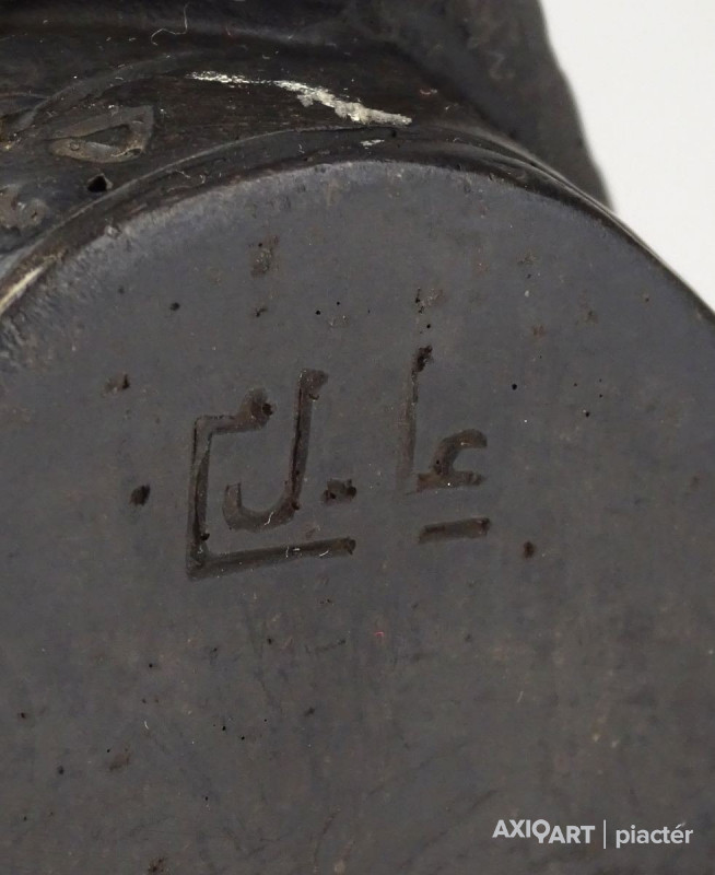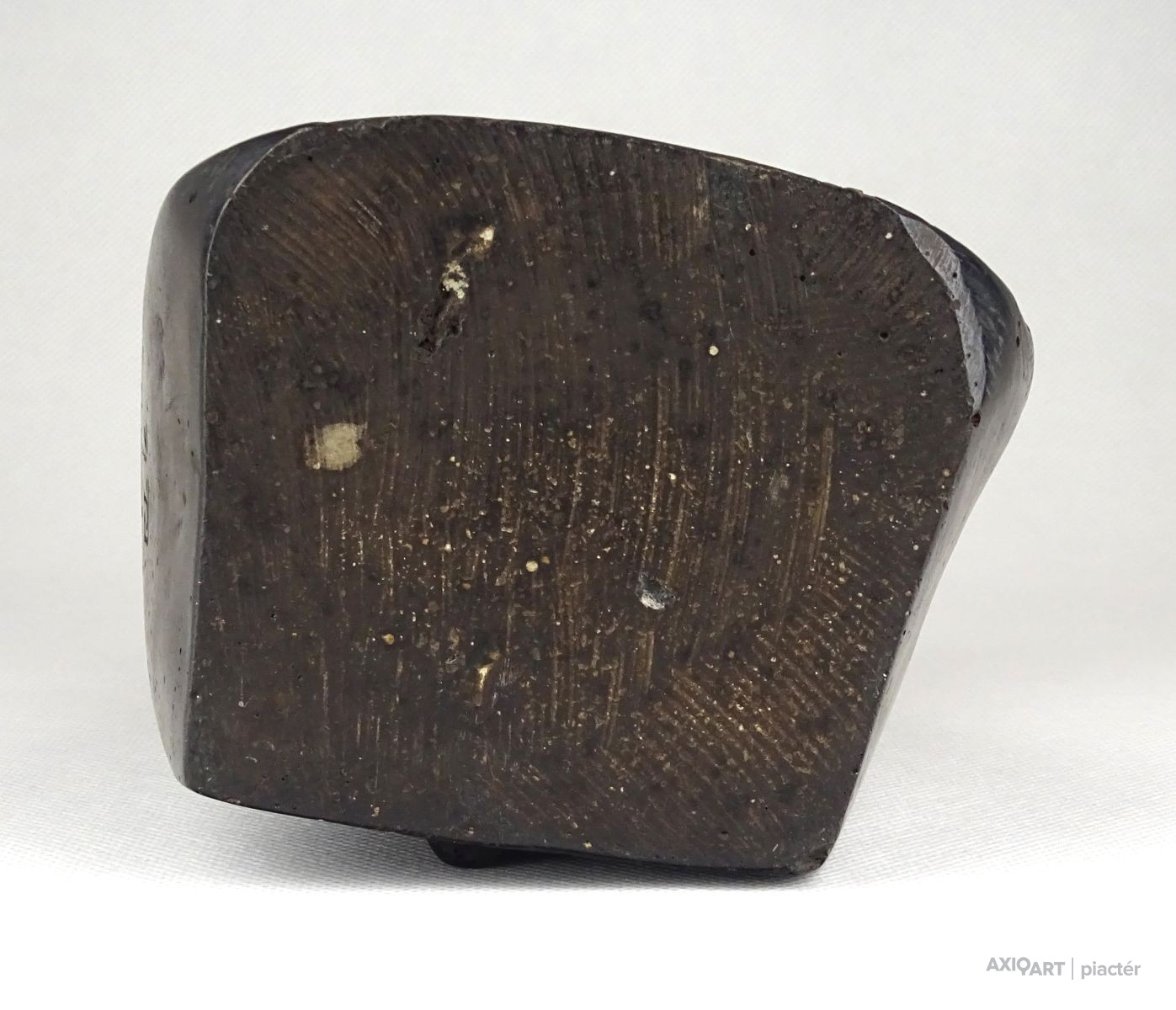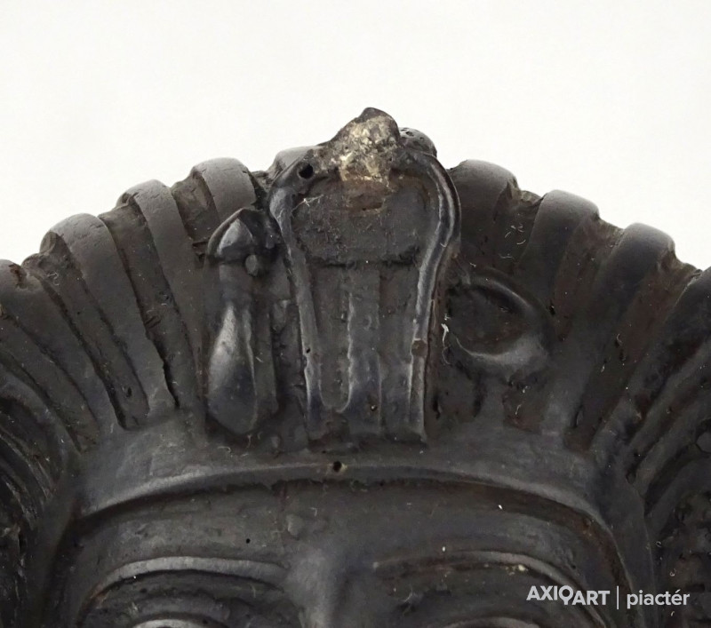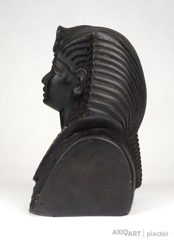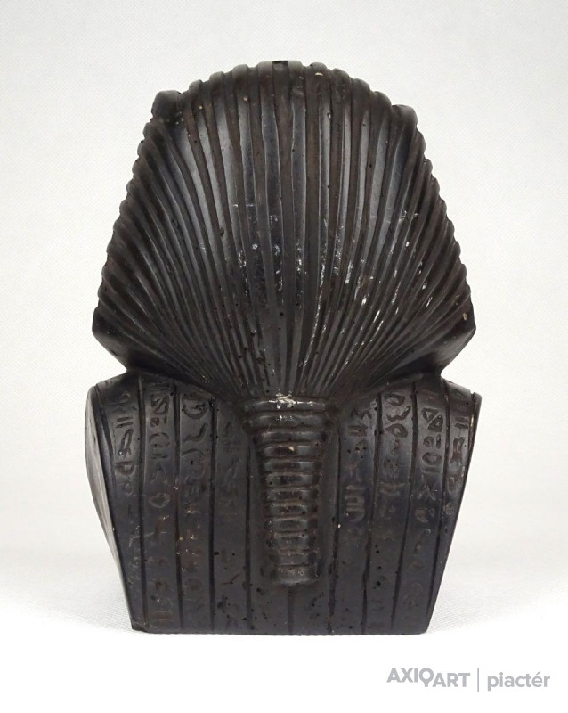 [1E860/X003] Szép állapotú, faragott kő egyiptomi fáraó fej szobor, Tutanhamon halotti maszk. Magasság: 14.5 cm Szélesség: 11 cm Súly: 1.45 kg Tutanhamon Tutanhamon Tutankhamon előd egyiptomi fáraó utód Szemenhkarévagy Nofernoferuaton XVIII. dinasztia Ay Tutanhamon aranyból készített halotti maszkja Uralkodása i. e. 1333 – 1324 Prenomen       Nebheperuré Ré a megjelenések ura Nomen     Tutanhamon Hekaiunusema Ámon élő képmása; A déli Héliopolisz [Théba] uralkodója Apja Ehnaton Anyja A KV35-ös sír ifjabbik női múmiája Főfelesége Anheszenamon Sírja KV62 Tutanhamon, másik elterjedt írásmód szerint Tutankhamon, uralkodói nevén Nebheperuré, (i. e. 1342 körül – i. e. 1324) az ókori Egyiptom XVIII. dinasztiájának egyik utolsó fáraója. Mivel fiatalon került trónra, helyette más nagy hatalmú személyek, mint Ay és Horemheb irányították az országot. Uralma alatt kezdődött Egyiptom Amarna-reform utáni restaurációja. Történelmi szempontból mérsékelten fontos uralkodó volt. Hírneve nagyrészt annak köszönhető, hogy sírja, a Királyok völgye 62, amit 1922-ben tártak fel Howard Cartervezetésével, az egyetlen, épségben megmaradt fáraósír. A fáraó múmiája most is ott található. A múmia aranymaszkja az egyik legismertebb ókori egyiptomi műalkotás. Nicholas Reeves angol egyiptológus szerint a maszk eredetileg Nofertitinek készült.      Nevének változatai  Születésekor Tutanhatonnak hívták („Aton élő képmása”). Neve előfordul Tutanhuaton alakban is. Uralkodása első éveiben – Aton napisten egyedülálló kultuszának felszámolása és a régi istenek, köztük Ámon tiszteletének helyreállítása idején – nevét Tutanhamonra változtatta, ma ezen a néven a legismertebb. Uralkodói neveit aTitulatúra fejezet tárgyalja. Valószínűleg ő az a fáraó, akit Manethón Rathotisz néven említ; ez prenomene és nomene, a Neb-heperu-Ré-Tut-anh-amonból eredhet. A Manethón által említett Rathotiszkilenc évig uralkodott (ami nagyjából megfelel Tutanhamon uralkodása hosszának).[2] Az Amarna-levelekben és egyéb ékírásos dokumentumokban többször említenek egy Nipḫururiyaš vagy Nibḫururia nevű fáraót. A Nebḫeperuré uralkodói név alapján Tutanhamonnal azonosítják. Az azonosítás bizonytalan ugyan (Ehnaton uralkodói neve Noferheperuré), de nagy valószínűséggel jó az időrend miatt. Néhány kronológiaikérdést is tisztáz, így például I. Szuppiluliumasz éppen Karkemis ostroma alkalmával értesült Nipḫuruiyaš haláláról. Származása  2008 és 2010 között DNS-vizsgálatokat végeztek Tutanhamonon és több más múmián, köztük máig azonosítatlanokén is. A vizsgált múmiák közt volt III. Amenhotep, Tije, Juja és Tuja (Tije szülei), két női múmia a Királyok völgye 21 sírból, a Tutanhamon sírjában (KV62) talált két halva született gyermek (akikről egy korábbi vizsgálat bebizonyította, hogy az ő gyermekei), az úgynevezett „Fiatalabb hölgy” múmia a Királyok völgye 35-ből (a mellette talált „Idősebb hölgyet” azonosították Tijeként), illetve a Királyok völgye 55-ben talált és sok vitát kiváltott múmia, amelyet azonosítottak már Ehnatonnal és Szemenkharéval is, a jelenlegi vizsgálat az előbbivel azonosítja annak alapján, hogy korát 35 és 45 év közé teszi (korábban fiatalabbnak tartották, ami kizárta volna, hogy a 17 évig uralkodó Ehnaton lehetne az). Kontrollcsoportként öt korábbi, a dinasztia elejére datálható múmiát is megvizsgáltak (Ahmesz-Nofertari, Hatsepszut, II. Thotmesz, Szitré-In és egy korábban I. Thotmesznek tulajdonított múmia). A vizsgálat alapján a Tutanhamon családtagjainak feltételezett múmiák valóban mind közeli rokonságban álltak vele. Az eltérő allélek kizárták, hogy Tutanhamonnak III. Amenhotep lenne az apja vagy Tije lenne az anyja. III. Amenhotep 99.99999999%-os biztonsággal a KV55 múmia apja, utóbbi pedig 99.99999981%-os biztonsággal Tutanhamon apja, így a KV55-ös múmia Ehnatonnal azonosítható. A KV35 „Fiatalabb hölgy” múmiát 99.99999997%-os biztonsággal azonosították Tutanhamon anyjaként, ezenkívül Ehnaton testvére volt. Tutanhamon nagy valószínűséggel az apja a sírjában talált két lánymagzatnak (99.97992885% illetve 99.99999299% eséllyel). A két magzat, illetve a KV21-ben talált KV21A múmia hasonlósága arra mutat, utóbbi lehetett a két gyermek anyja, emiatt feltételezetten ő Anheszenamon, Tutanhamon egyetlen ismert felesége, de ez további bizonyítást igényel.   Forrás: wikipedia