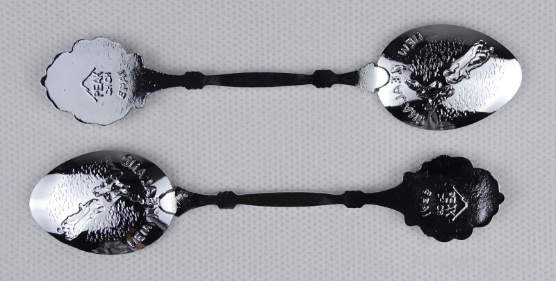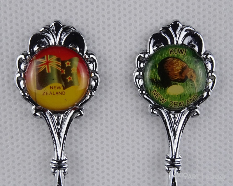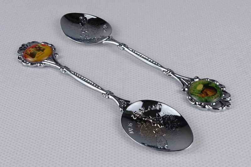 [1P962/X024/017] Hibátlan állapotú ajándék tárgy, kettő darab kanál, díszkanál. A kanál fején felirat: - NEW ZEALAND - KIWI NEW ZEALAND A kanál hátoldalán jelzés, felirat: PEAK CHIC EPAI Szélesség: 2.4 cm Hosszúság: 11.2 cm Súly: 0.025 kg