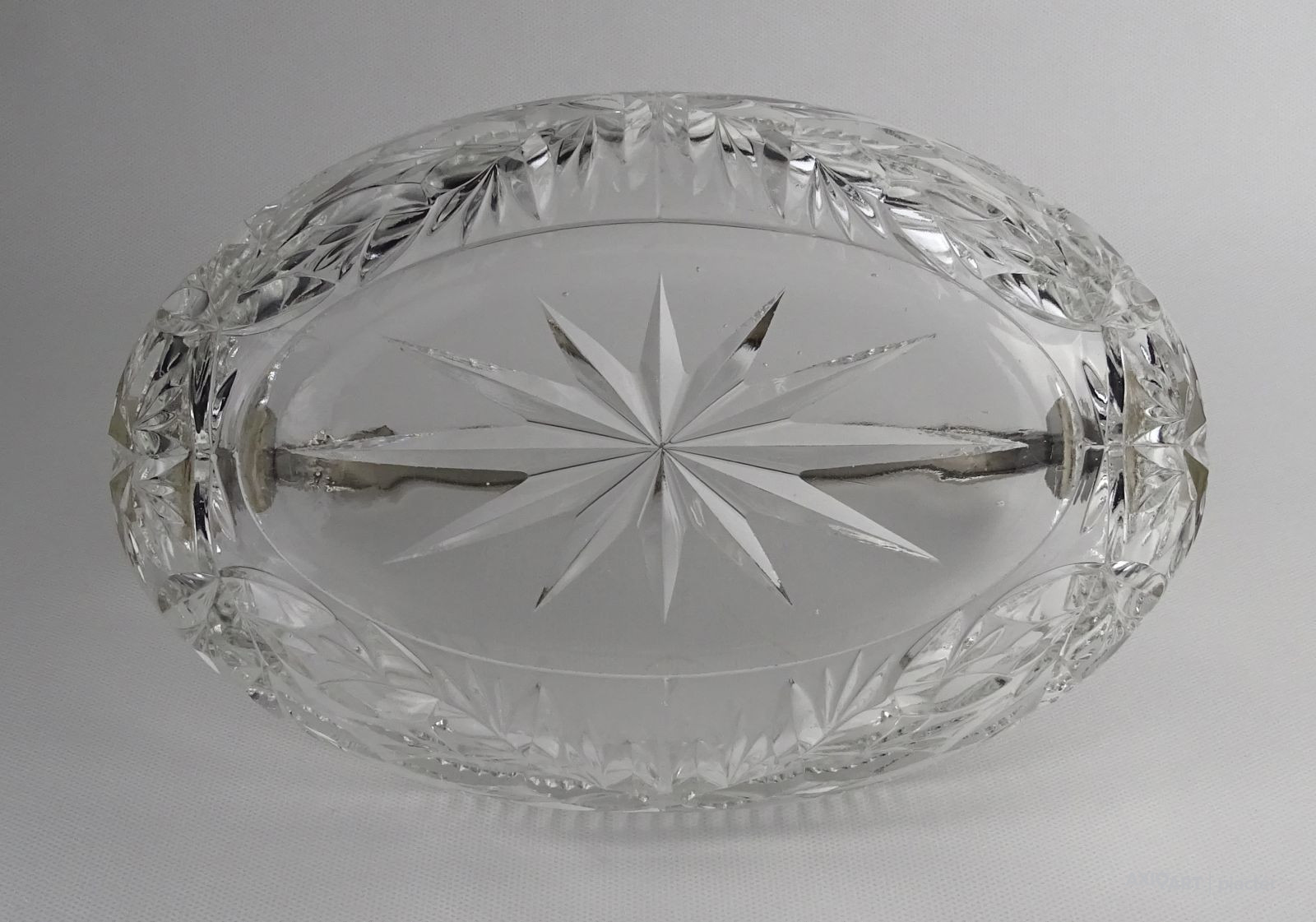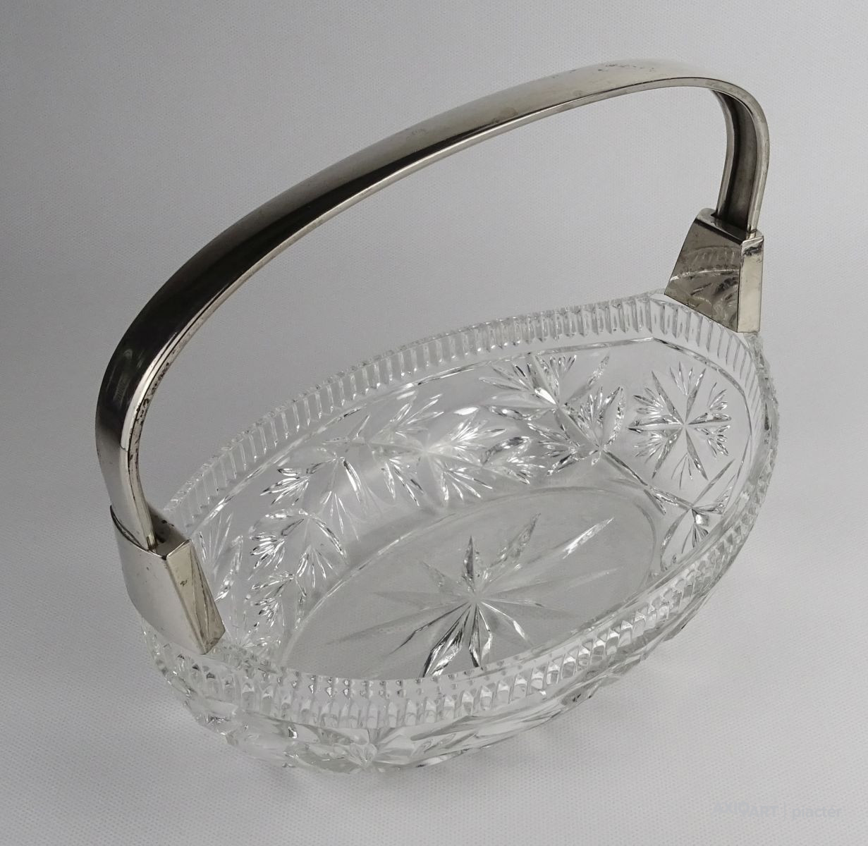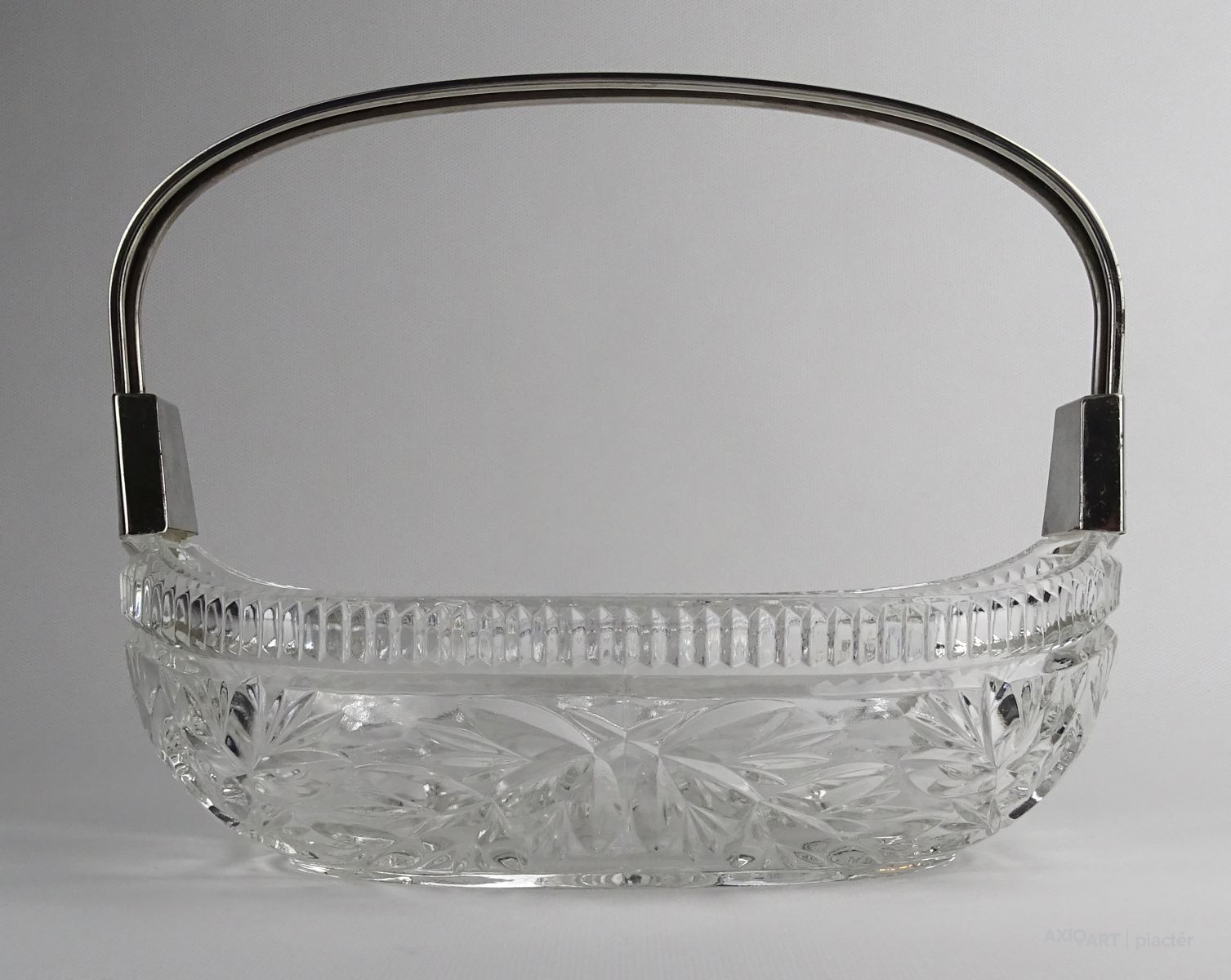 Hibátlan állapotú, ovális alakú üveg kosár asztalközép kínáló, gyümölcskínáló kosár, fém füllel.