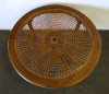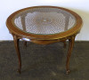 [1H308/KCS] Gyönyörű, régi üveglapos asztal, szalonasztal. Az üveglap alatt szép fonat, gyékényfonat található. Kör alakú könnyed neobarokk szalonasztal, körasztal. Magasság: 55 cm Szélesség: 85 cm