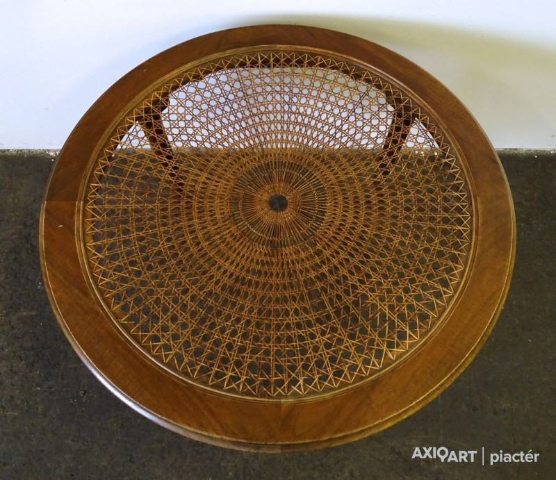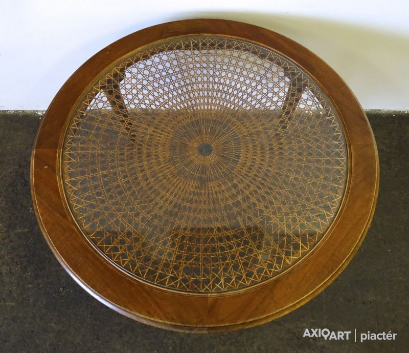 Gyönyörű, régi üveglapos asztal, szalonasztal. Az üveglap alatt szép fonat, gyékényfonat található. Kör alakú könnyed neobarokk szalonasztal, körasztal.