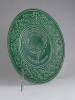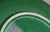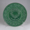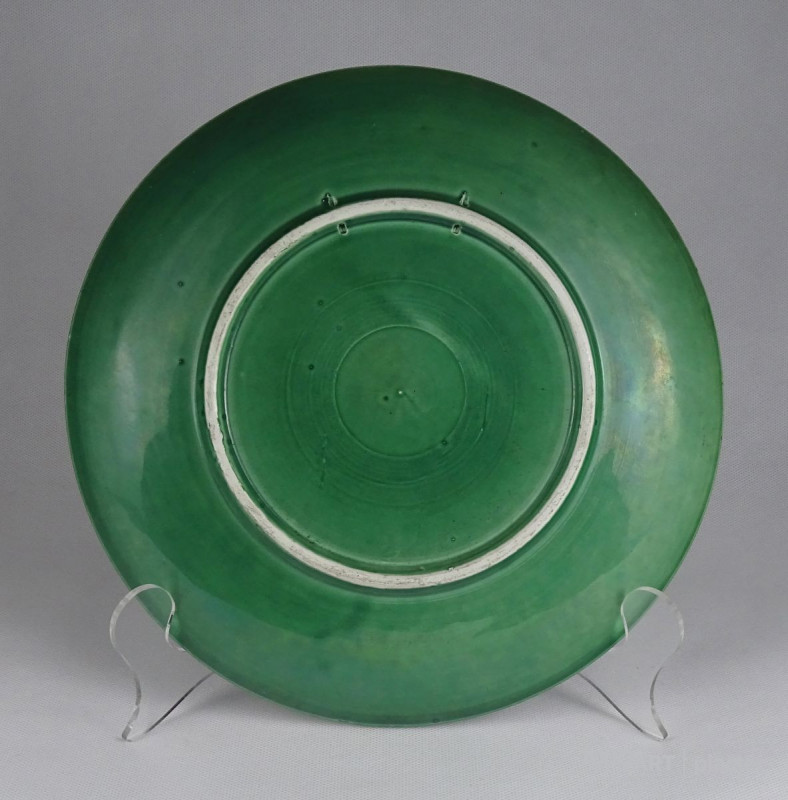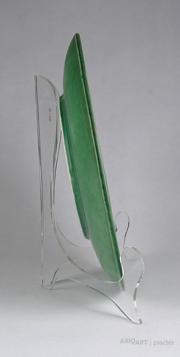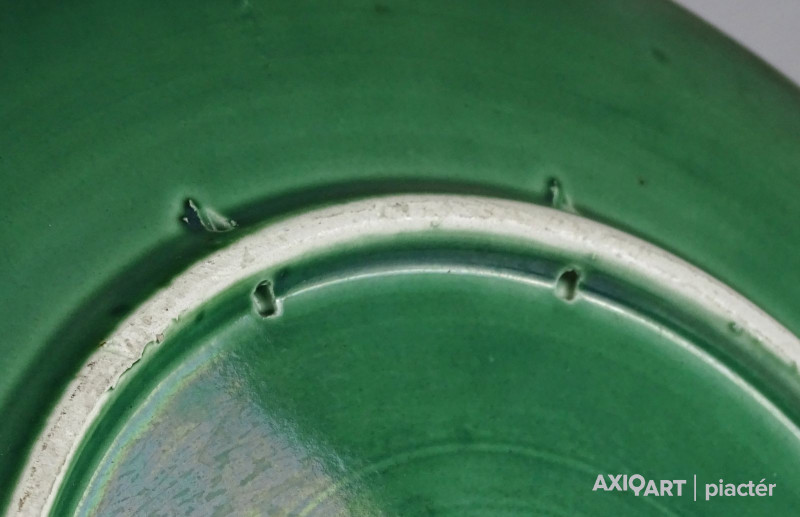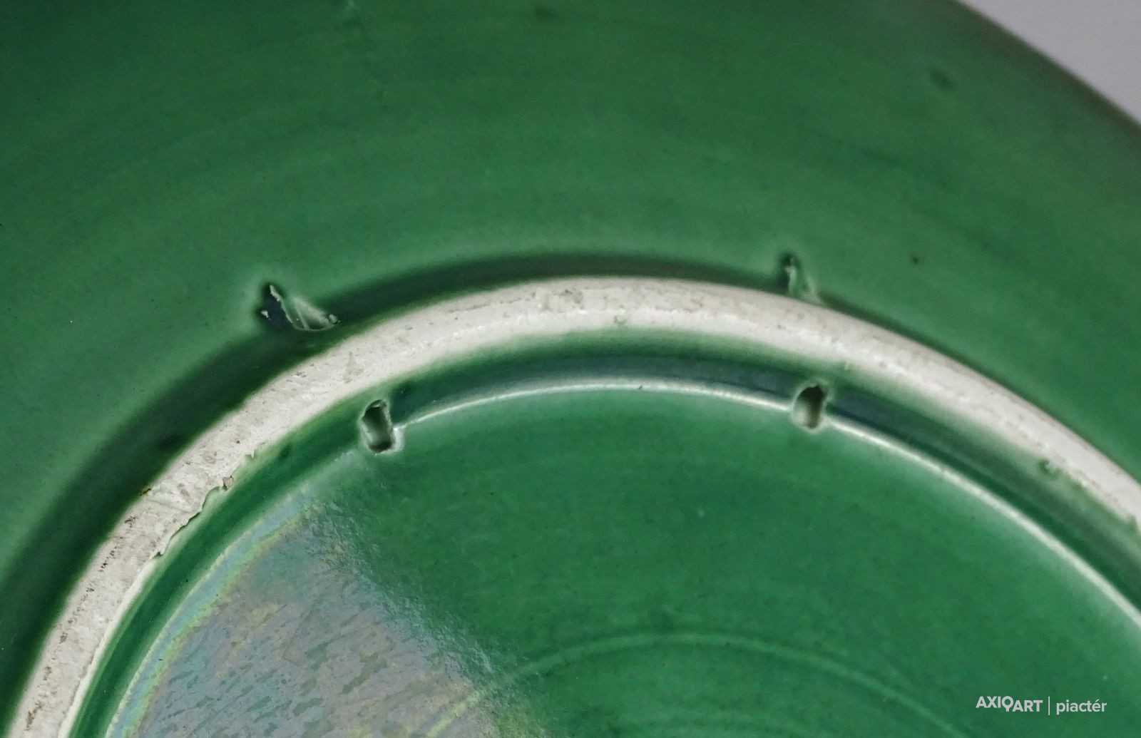 Hibátlan állapotú, zöld mázas kerámia tál, fali tál, dísztál. Akasztási lehetőséggel rendelkezik. Körben tölgyfalevél és makk plasztikus motívumaival díszített. Közepében egy nagyméretű vadász trófea, szarvasagancs látható