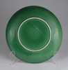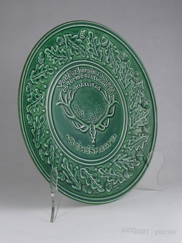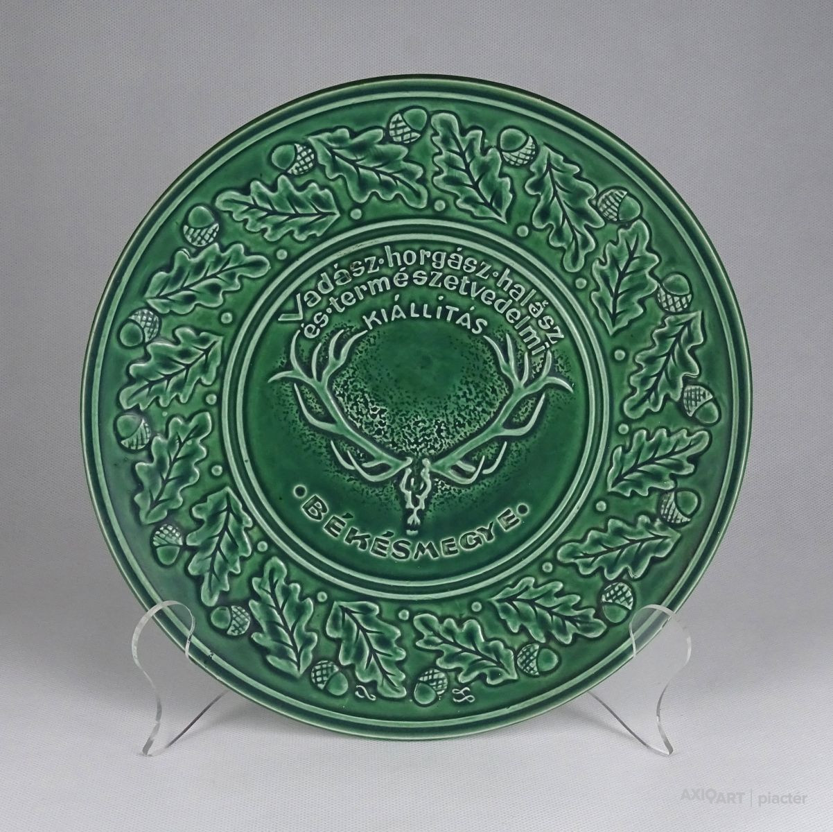 [1S631/X052] Hibátlan állapotú, zöld mázas kerámia tál, fali tál, dísztál. Akasztási lehetőséggel rendelkezik. Körben tölgyfalevél és makk plasztikus motívumaival díszített. Közepében egy nagyméretű vadász trófea, szarvasagancs látható Rajta felirat: VADÁSZ HORGÁSZ HALÁSZ ÉS TERMÉSZETVÉDELMI KIÁLLÍTÁS BÉKÉSMEGYE Szélesség: 27 cm Súly: 0.65 kg
