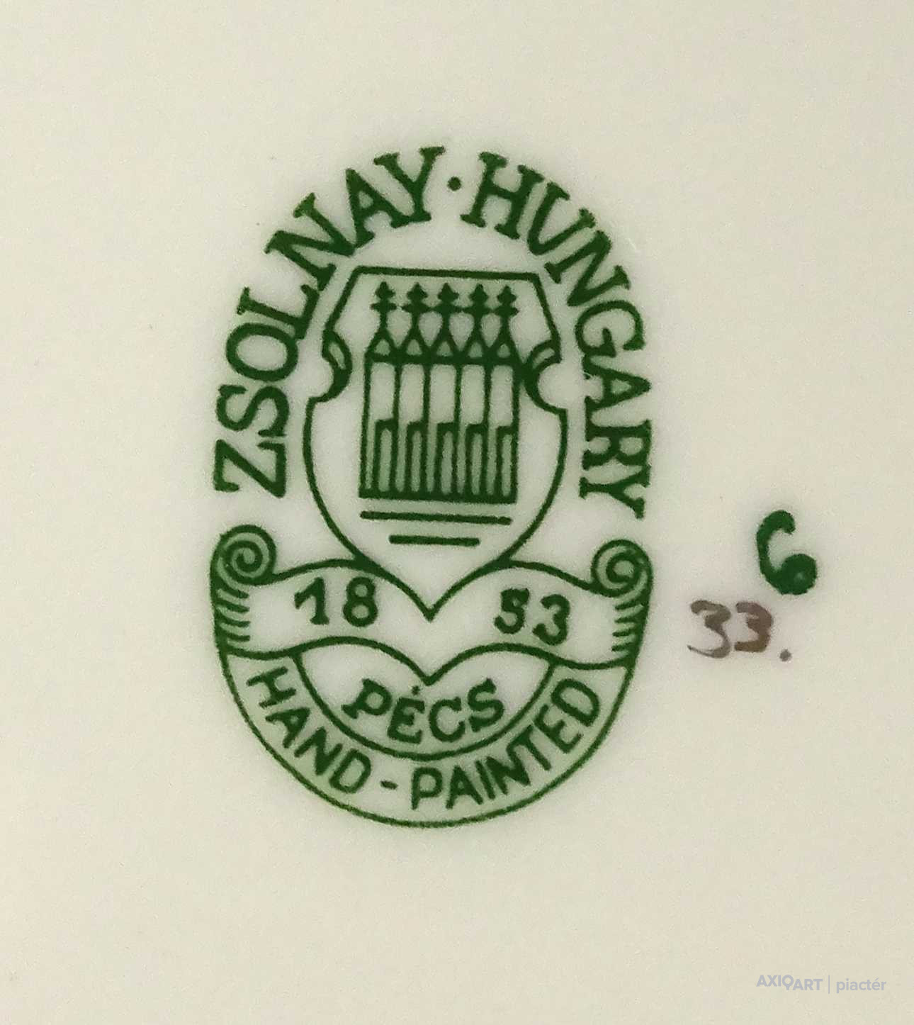 Alján zöld színű öttornyú Zsolnay márkajelzés: