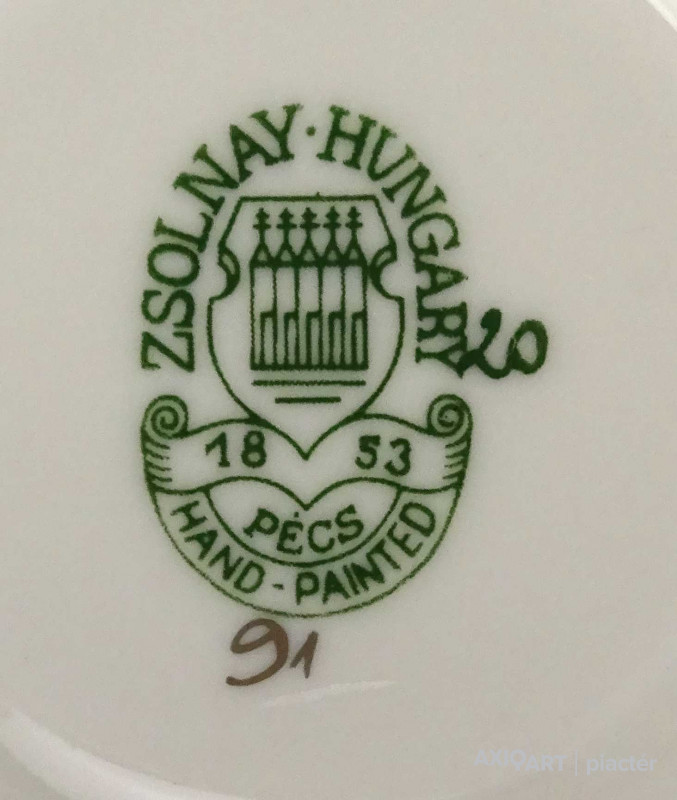 Alján zöld színű öttornyú Zsolnay márkajelzés: